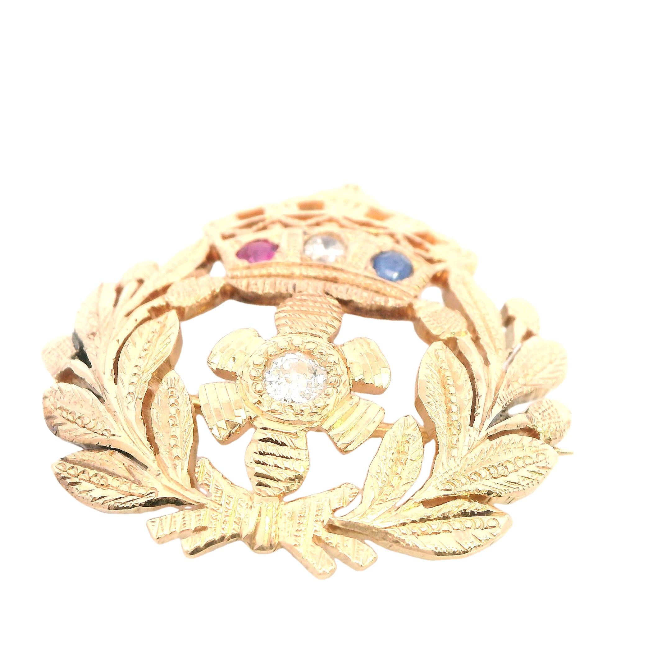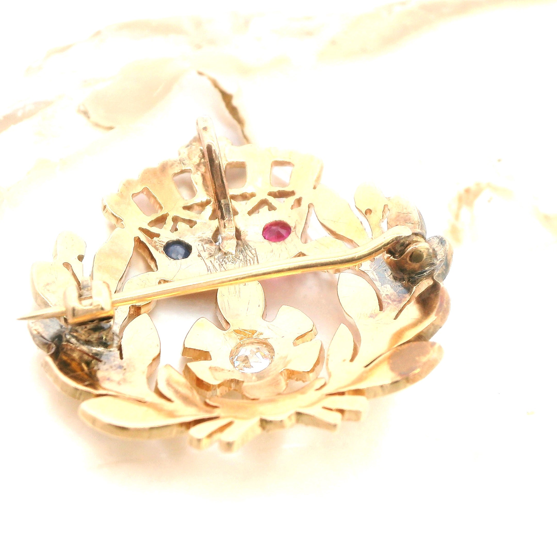 This exquisite 18ct yellow gold brooch or pendant is a versatile and timeless piece of jewelry. Measuring 28mm x 29mm, the piece is beautifully grain set with a 2.5mm round-cut sapphire, a 2.5mm round-cut ruby, and two old brilliant-cut diamonds—one weighing 0.05ct and the other 0.10ct. The diamonds are graded “H” in color and “I1” in clarity, adding a subtle brilliance to the colorful gemstones.