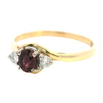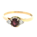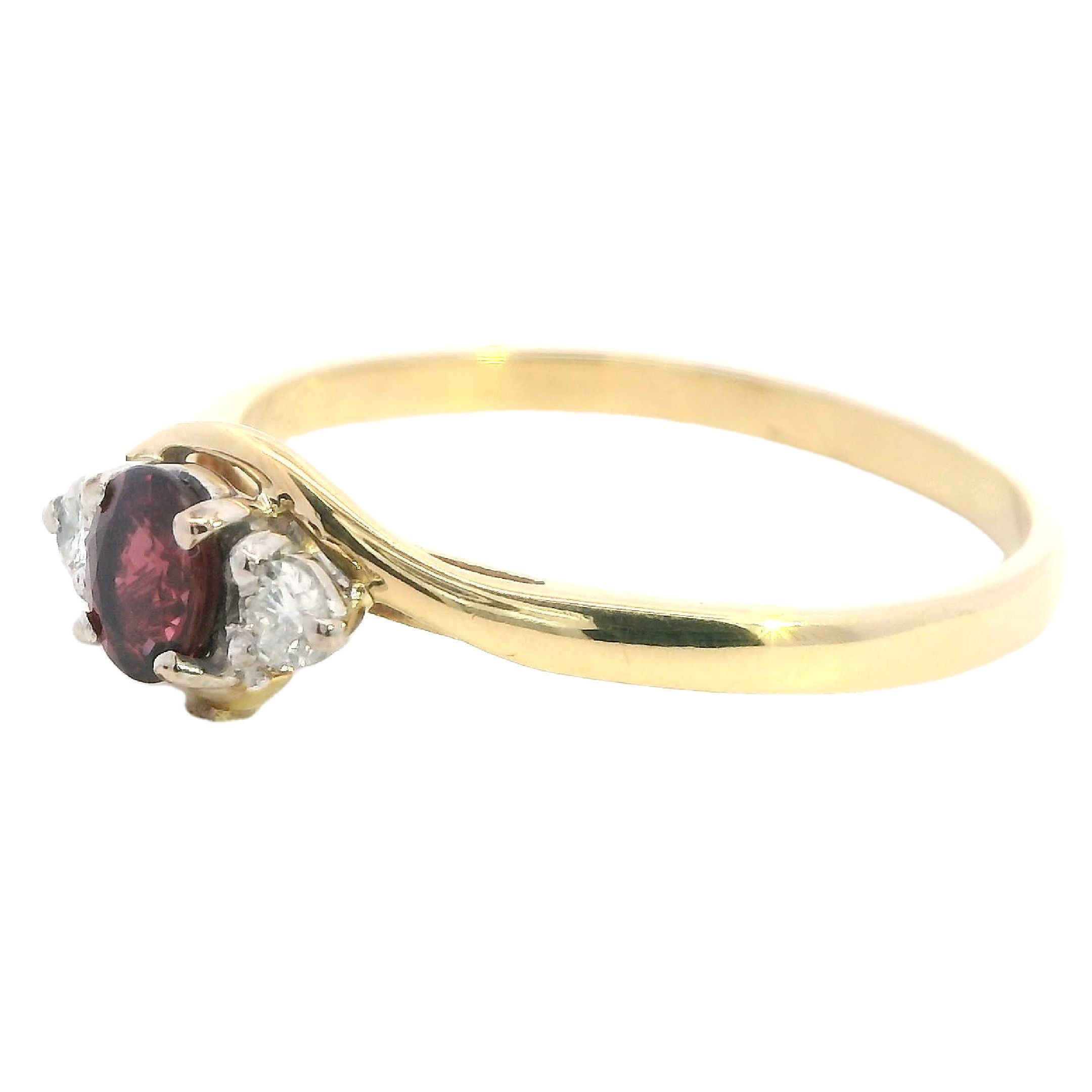 Presenting a timeless 18ct yellow and white gold 3 stone ring from The Exclusive Jewellery and Antiques Company. This elegant ring features a striking oval ruby, securely set in a white gold 4-claw setting. Flanked by two round brilliant cut diamonds, each set in a white gold 3-claw setting, the ring's design is completed with pointed swept up crossover shoulders on a 1/4 round 1.89mm yellow gold band. This piece embodies sophistication and classic beauty.