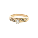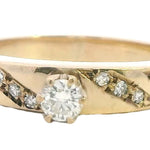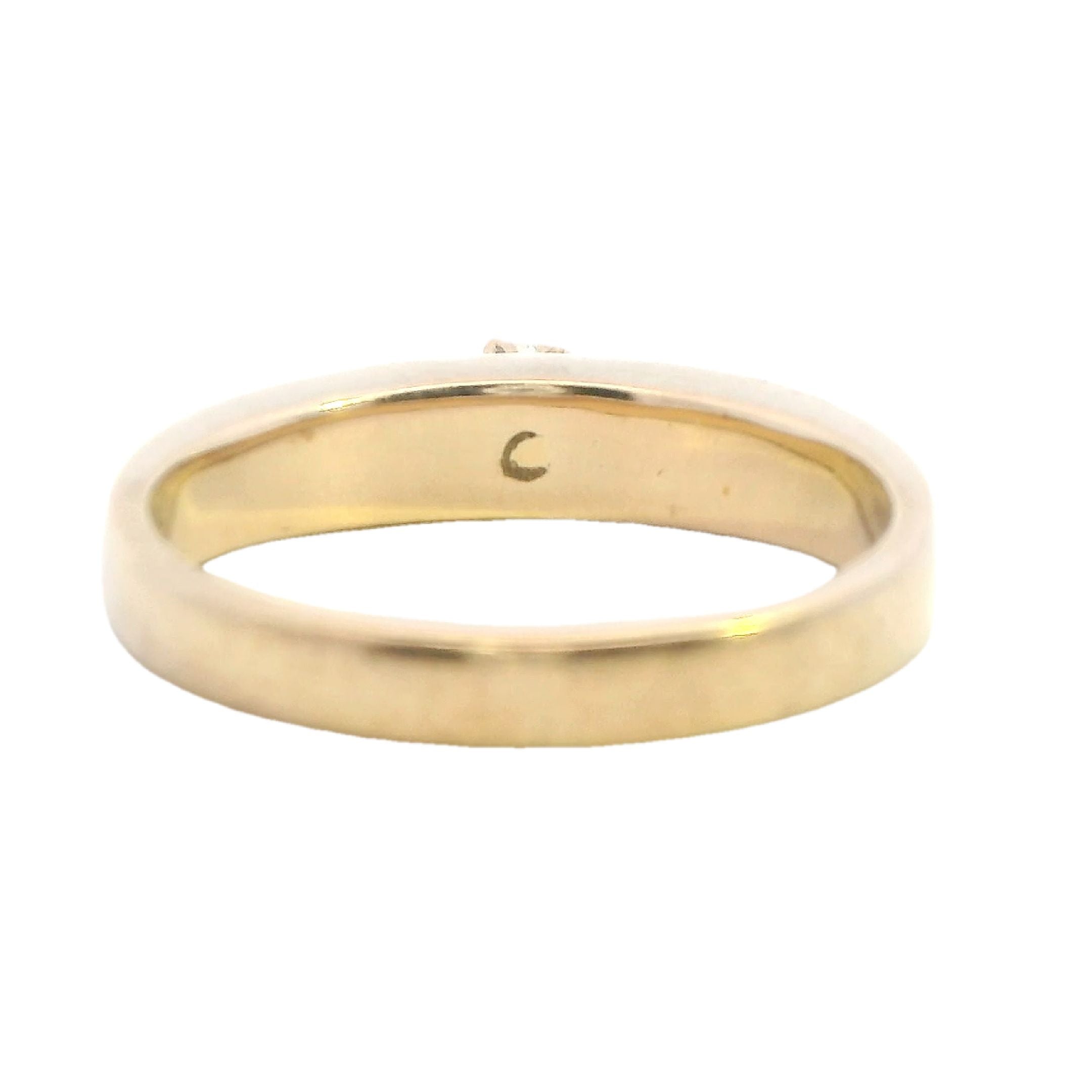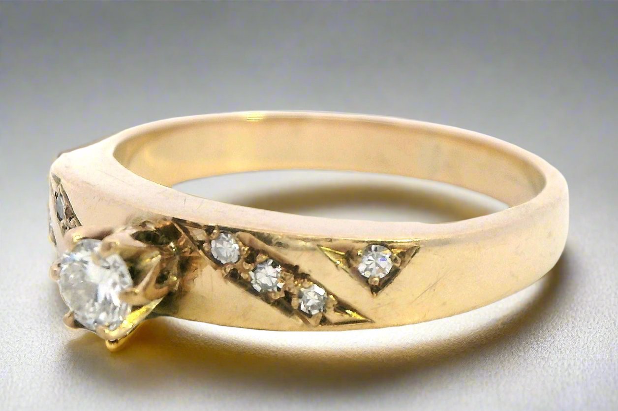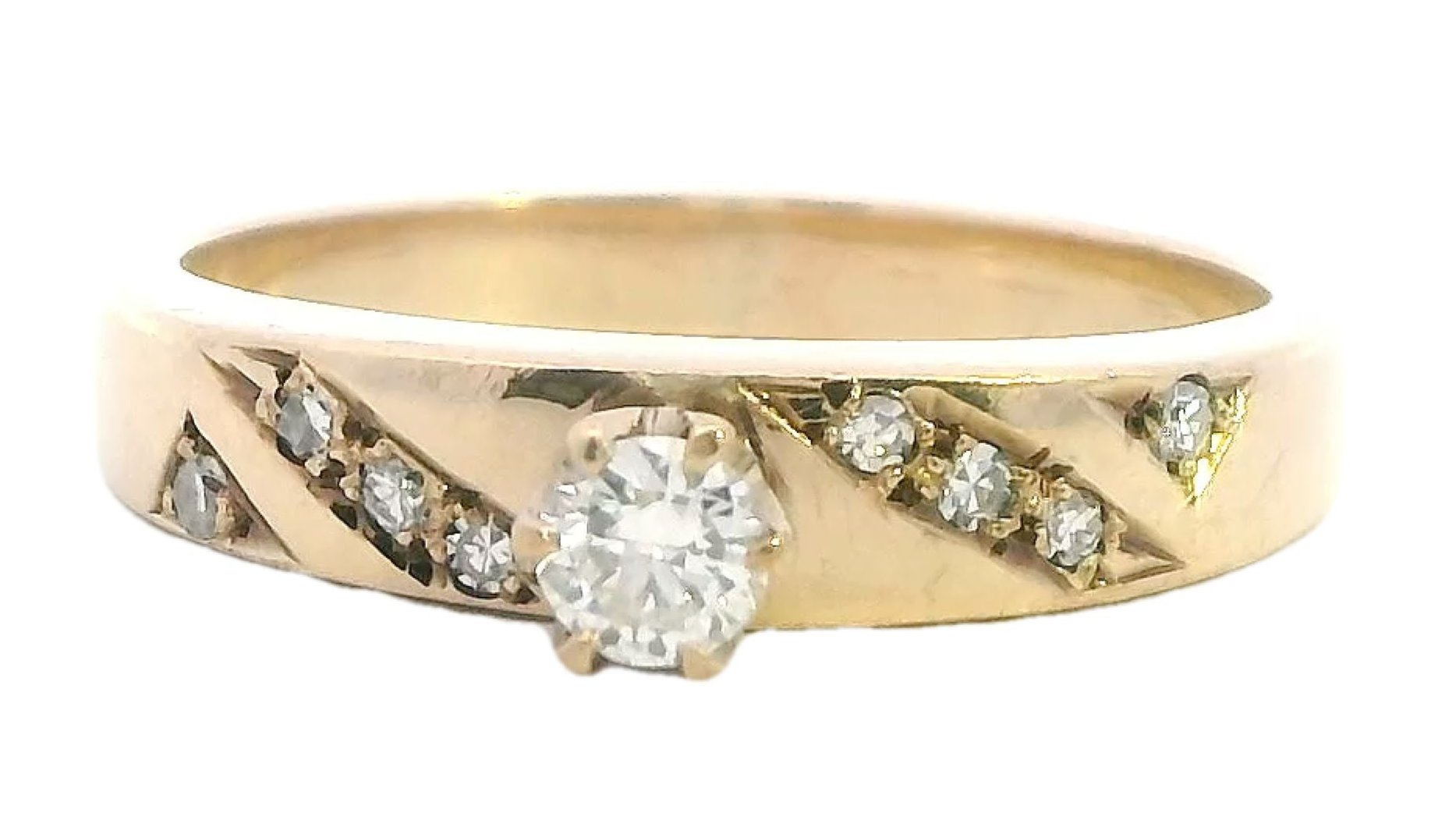 Introducing a beautifully crafted 9ct yellow gold diamond ring that exudes elegance and timeless charm. The centerpiece of this ring is a round brilliant cut diamond, securely set with six claws. Flanking the central diamond are four single cut diamonds on each side, grain set diagonally, adding extra sparkle to this stunning piece. The diamonds are all set in a 1/4 round 2.6mm band, making this ring both elegant and comfortable to wear.