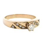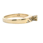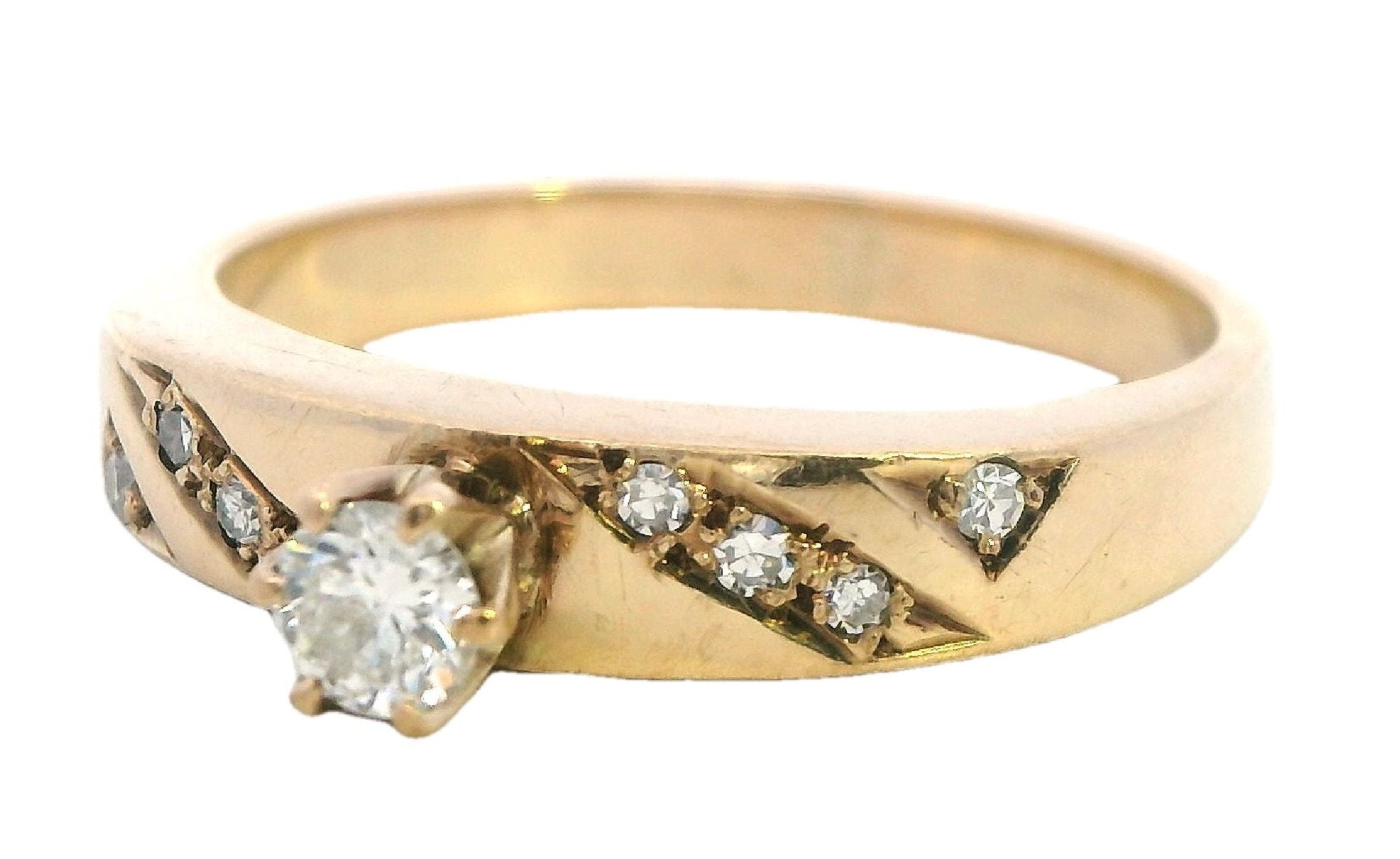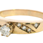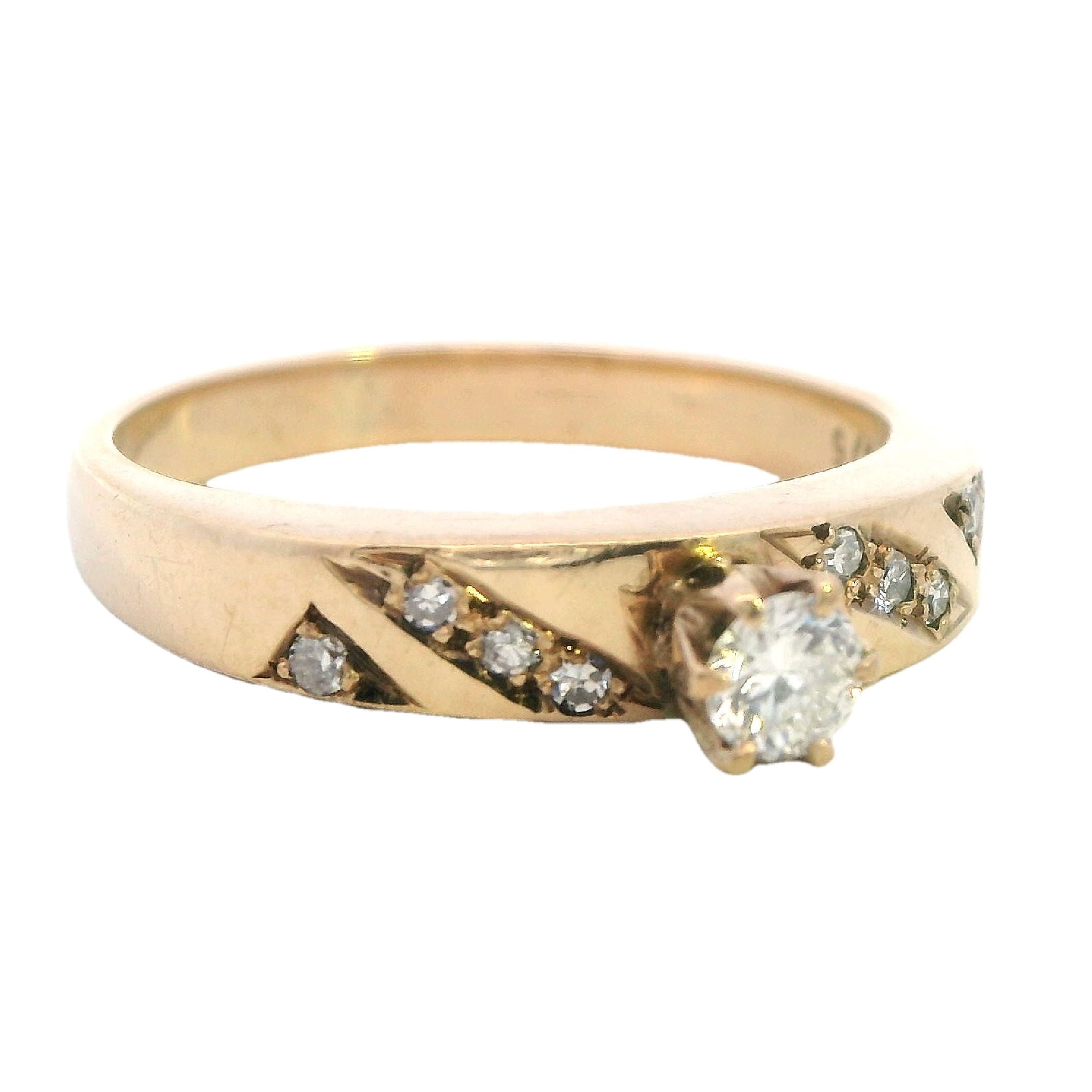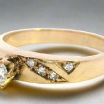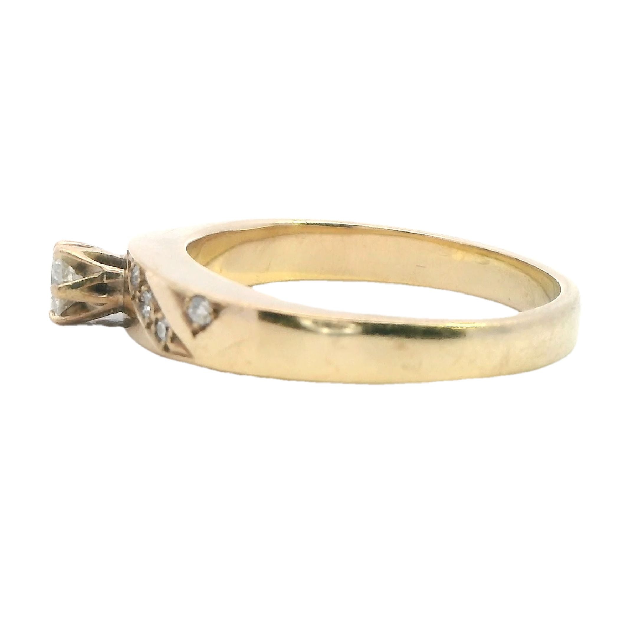 Introducing a beautifully crafted 9ct yellow gold diamond ring that exudes elegance and timeless charm. The centerpiece of this ring is a round brilliant cut diamond, securely set with six claws. Flanking the central diamond are four single cut diamonds on each side, grain set diagonally, adding extra sparkle to this stunning piece. The diamonds are all set in a 1/4 round 2.6mm band, making this ring both elegant and comfortable to wear.
