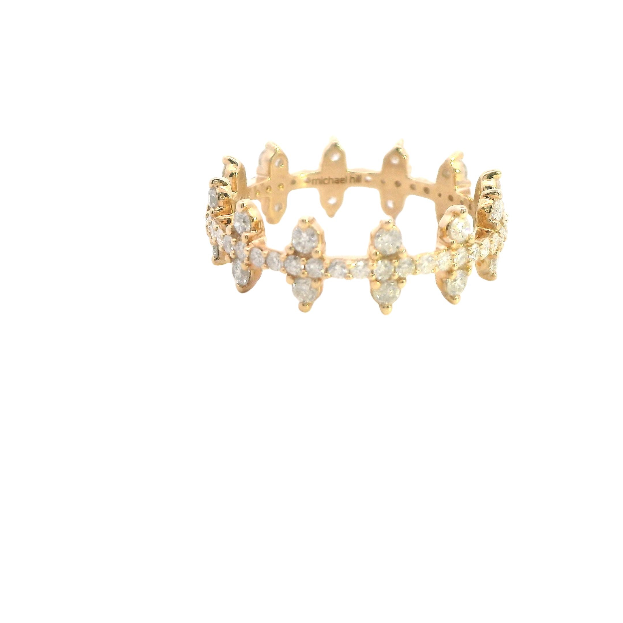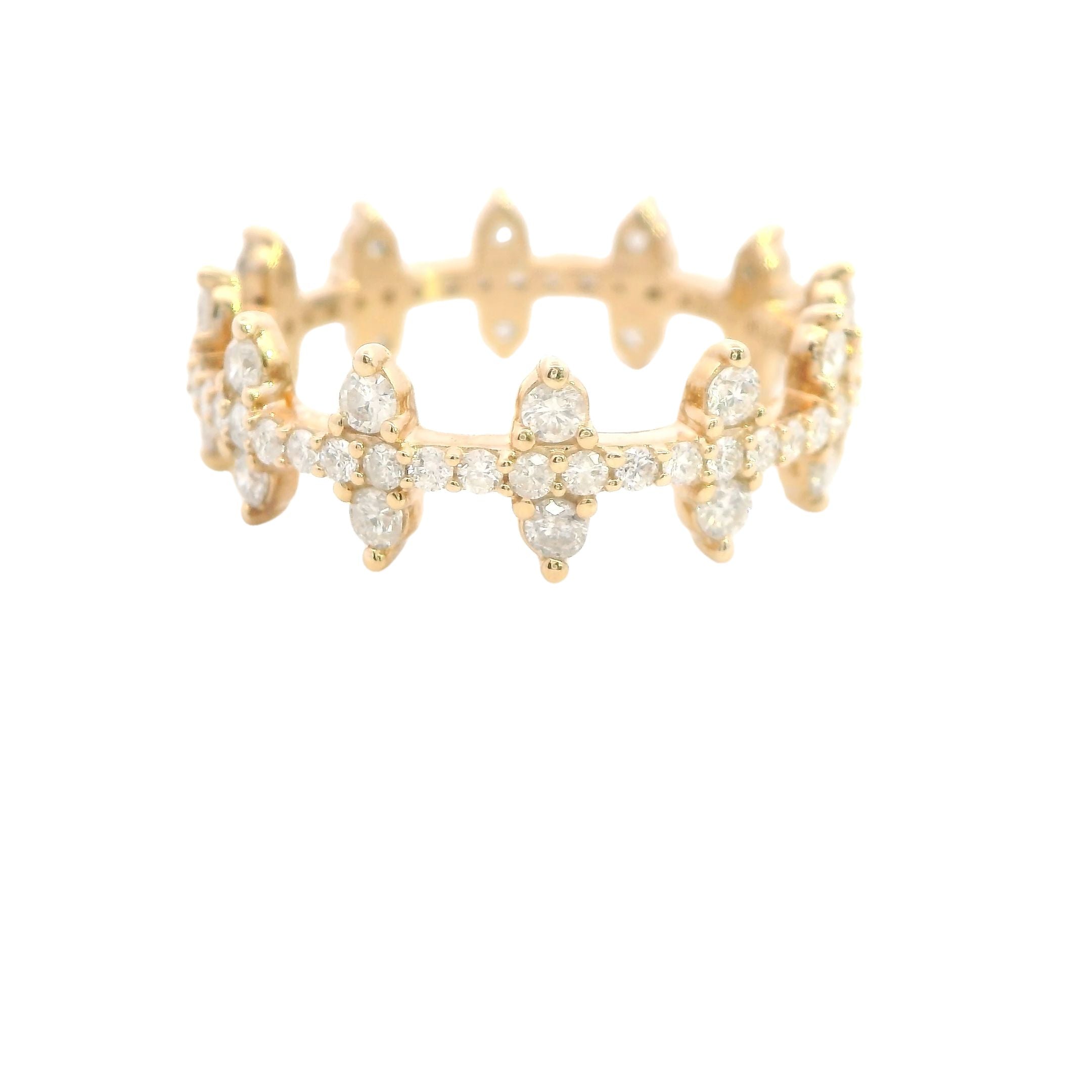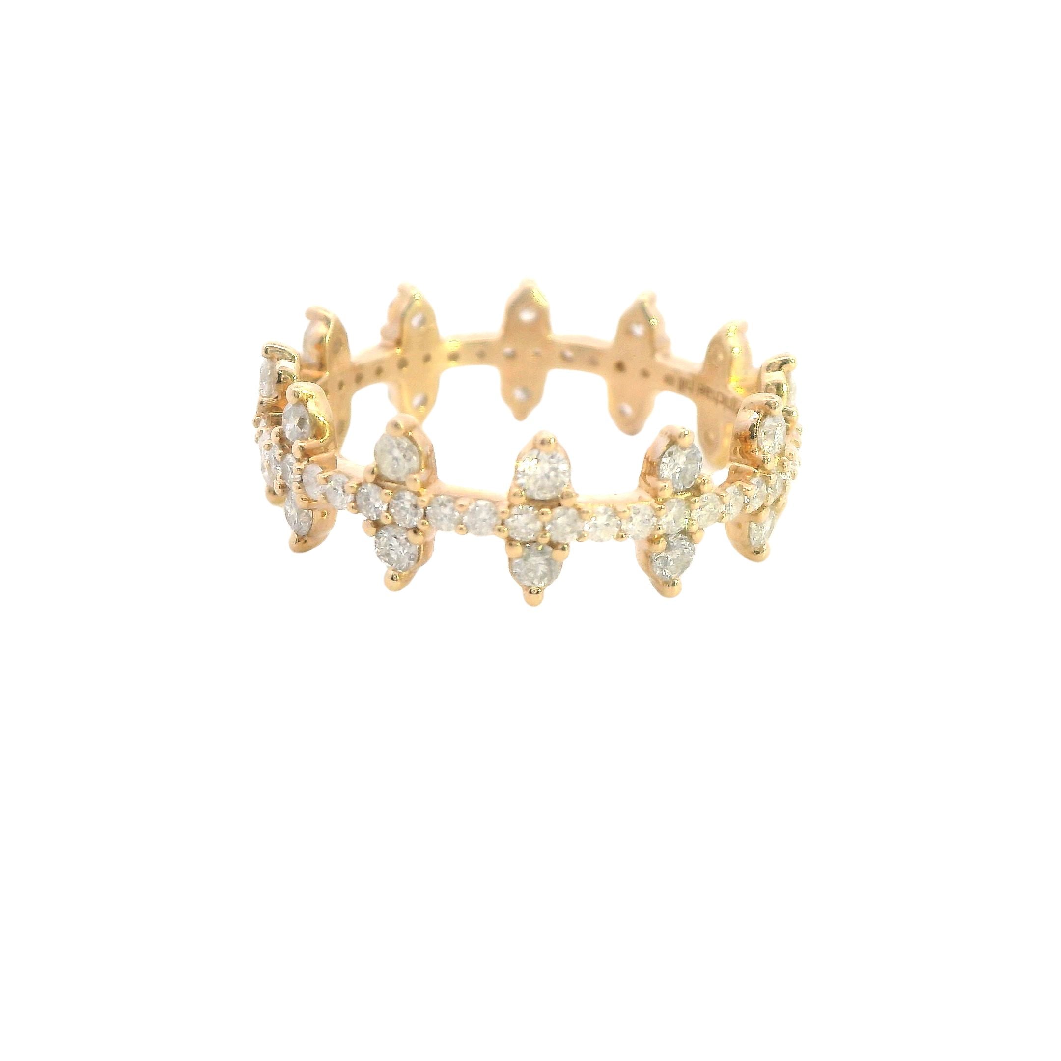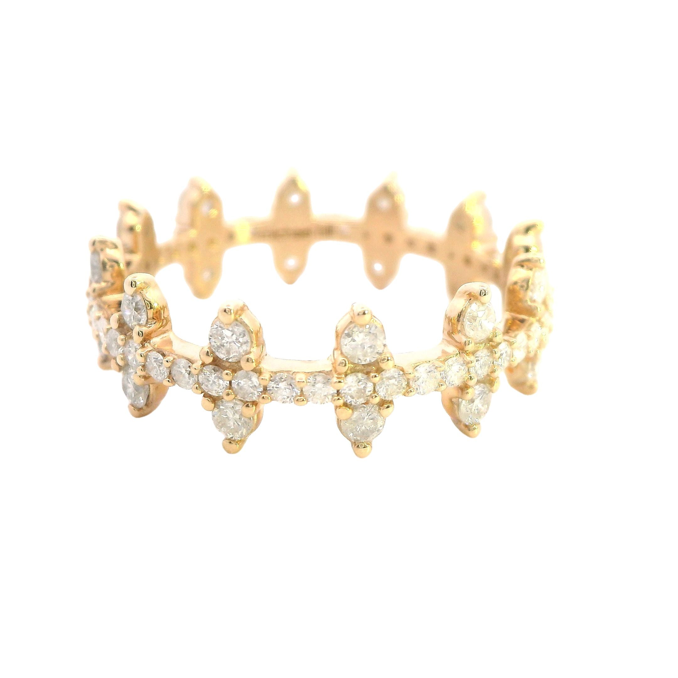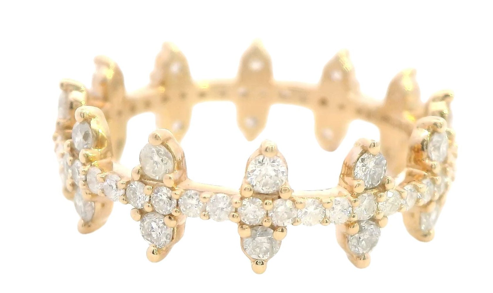 This stunning 10ct yellow gold "Zipper" ring is a truly unique piece, showcasing a total of seventy-two (72) brilliant cut diamonds. The diamonds, with a total weight of 1.00ct, are graded “I” in color and “I1” in clarity, creating a beautiful sparkle that adds elegance and charm to this distinctive ring. The shank is 1.4mm wide, providing a delicate yet eye-catching design. Perfect for anyone looking to add a touch of glamour to their jewelry collection, this "Zipper" ring is both stylish and luxurious.