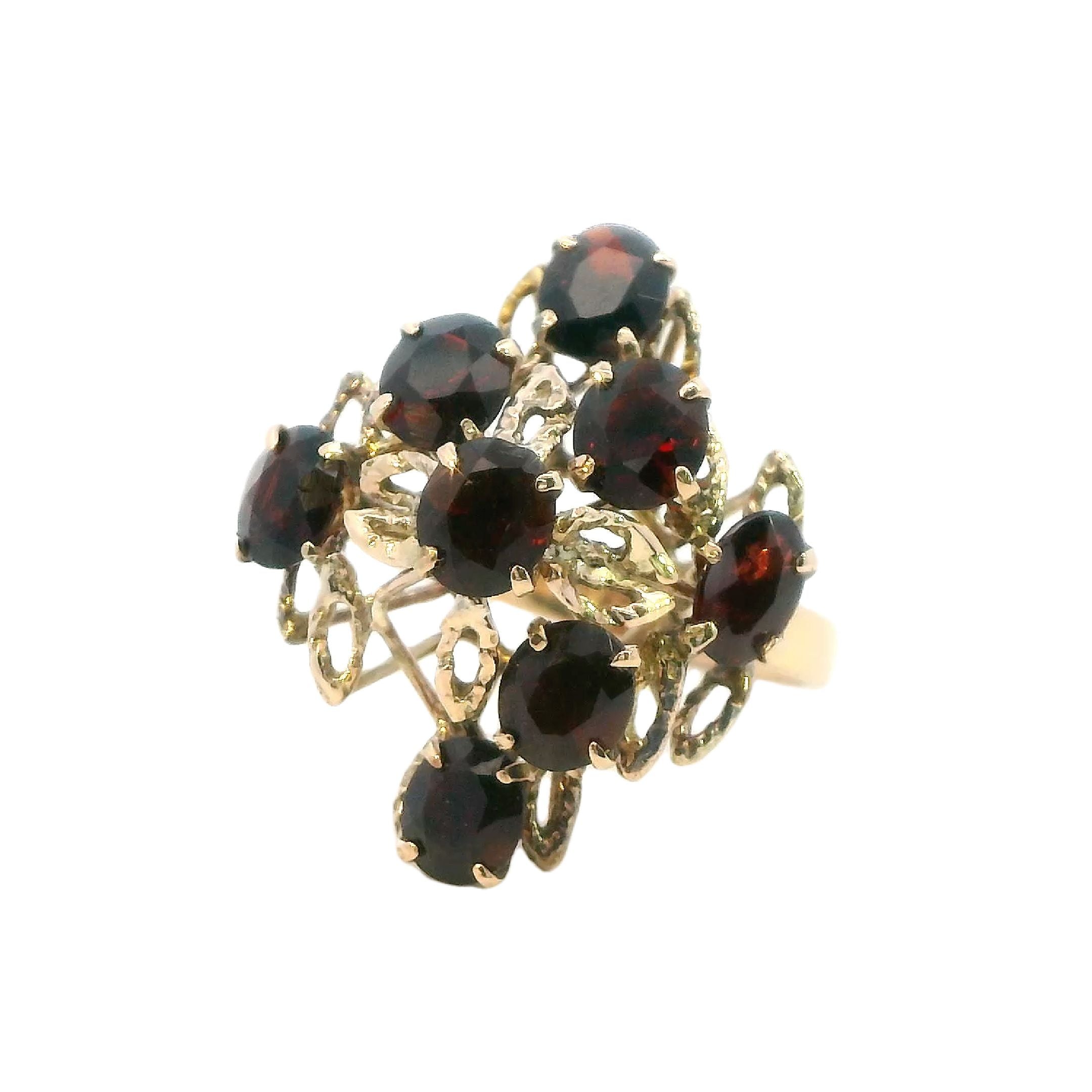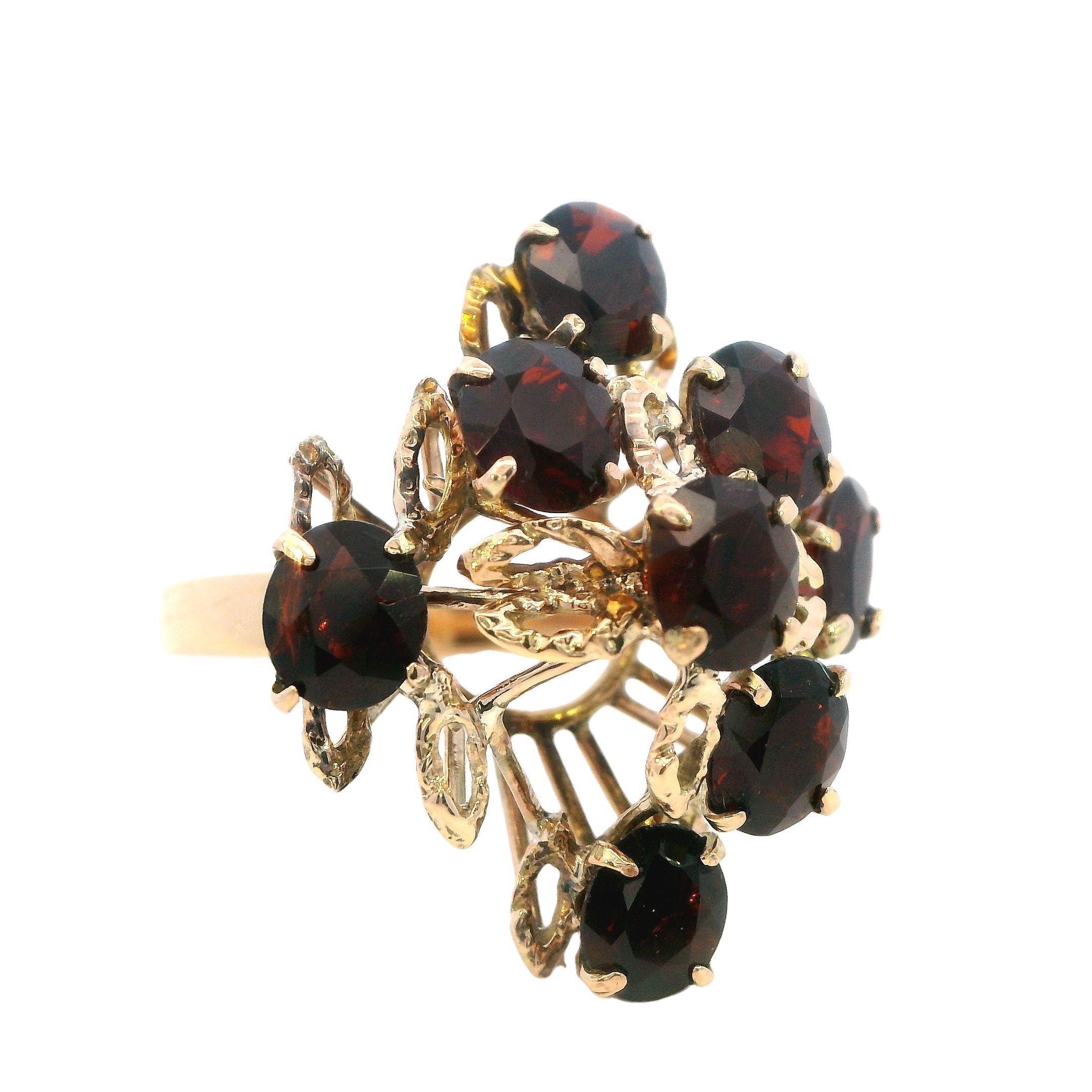 Description: This magnificent ring features a meticulously crafted 14ct yellow gold setting with a 2.6mm to 2.9mm flat tapered shank. The centerpiece of this elegant piece is a striking 25mm x 22mm tiered mount, claw set with eight oval cut garnets, each measuring 5mm x 4mm. The garnets' rich, deep red hues are beautifully complemented by the warm glow of the yellow gold, creating a piece that is both bold and refined.