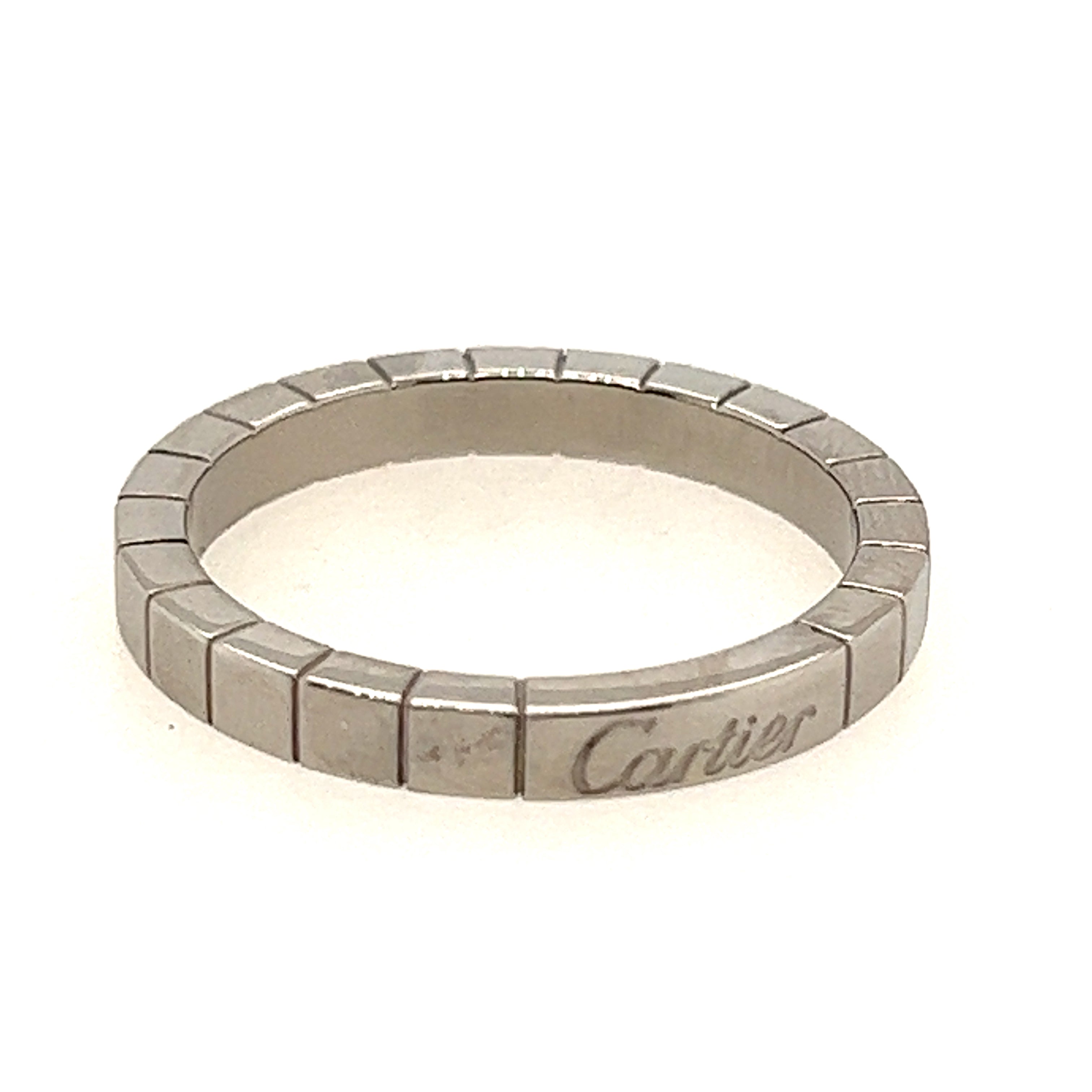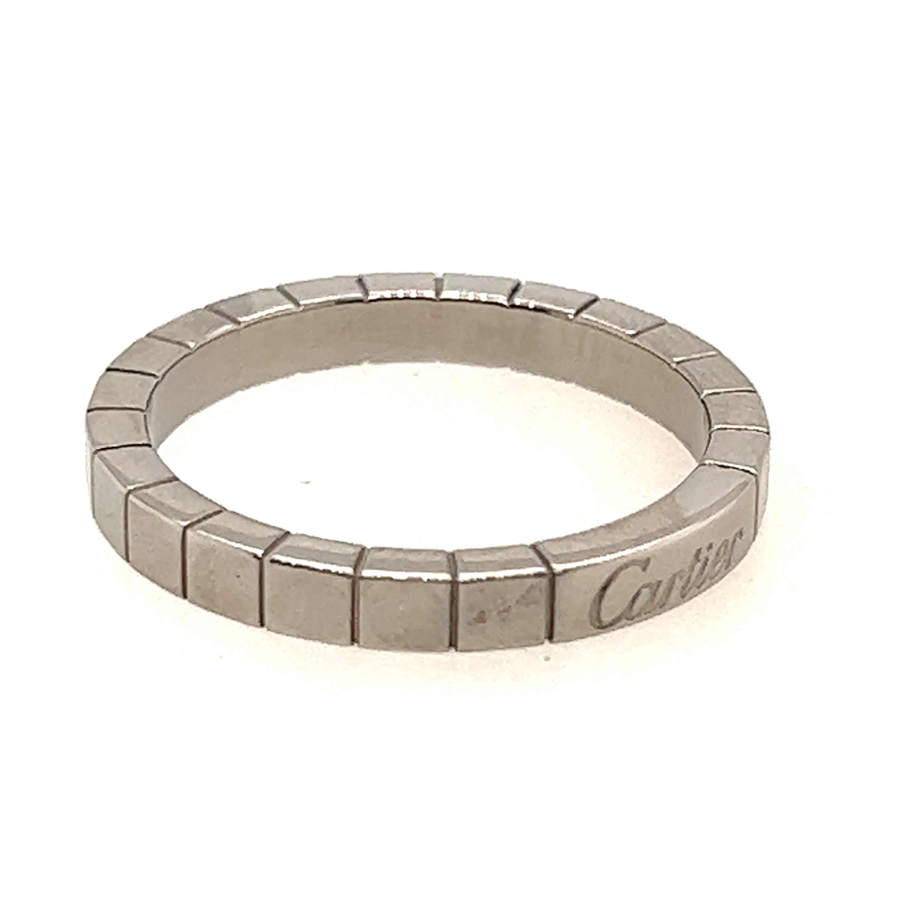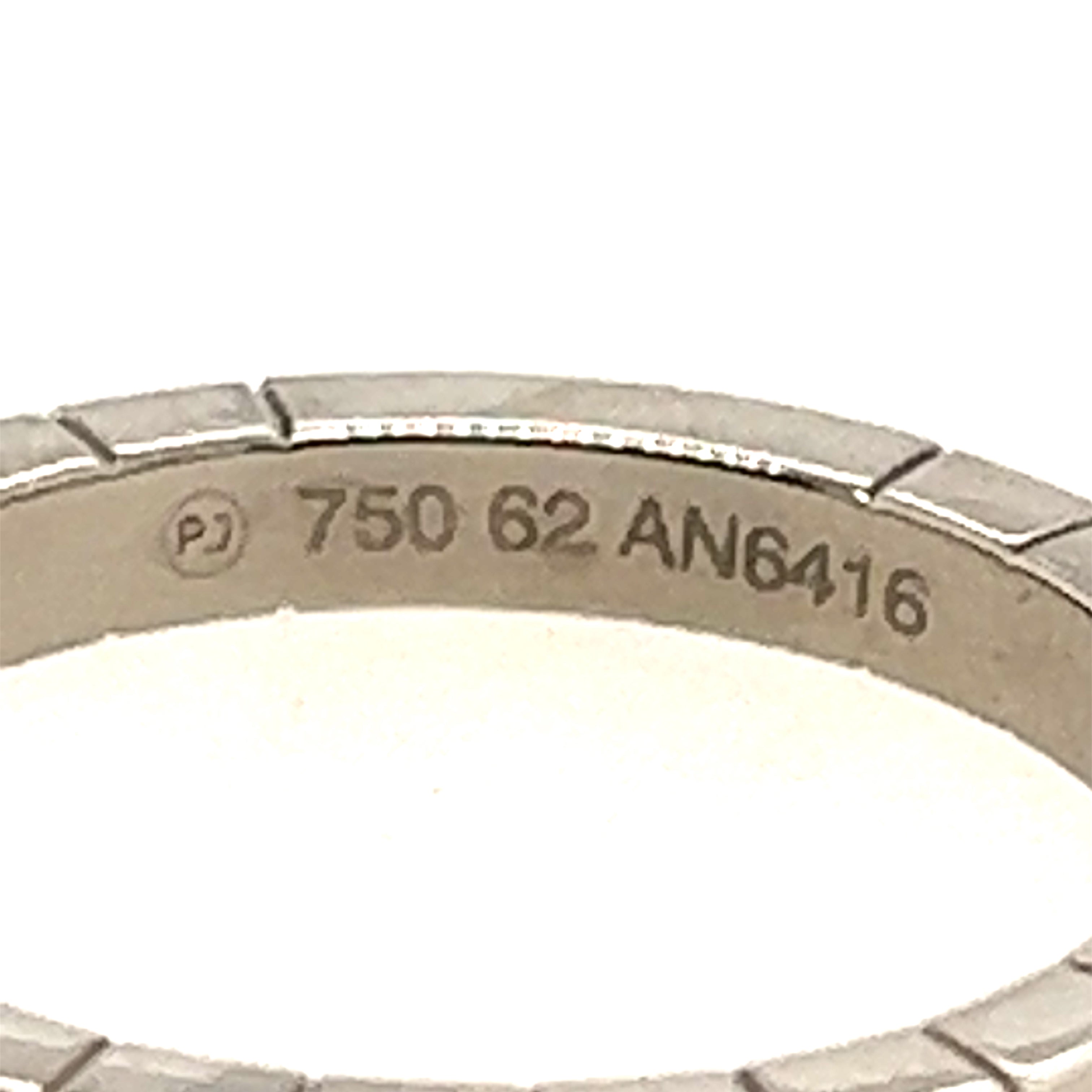 18ct white gold “Cartier” wedding band. The segmented band is 3mm in width and is stamped “Cartier”, 750 62 AN6146. White Gold with an engraved logo and segmented design.
