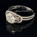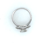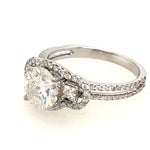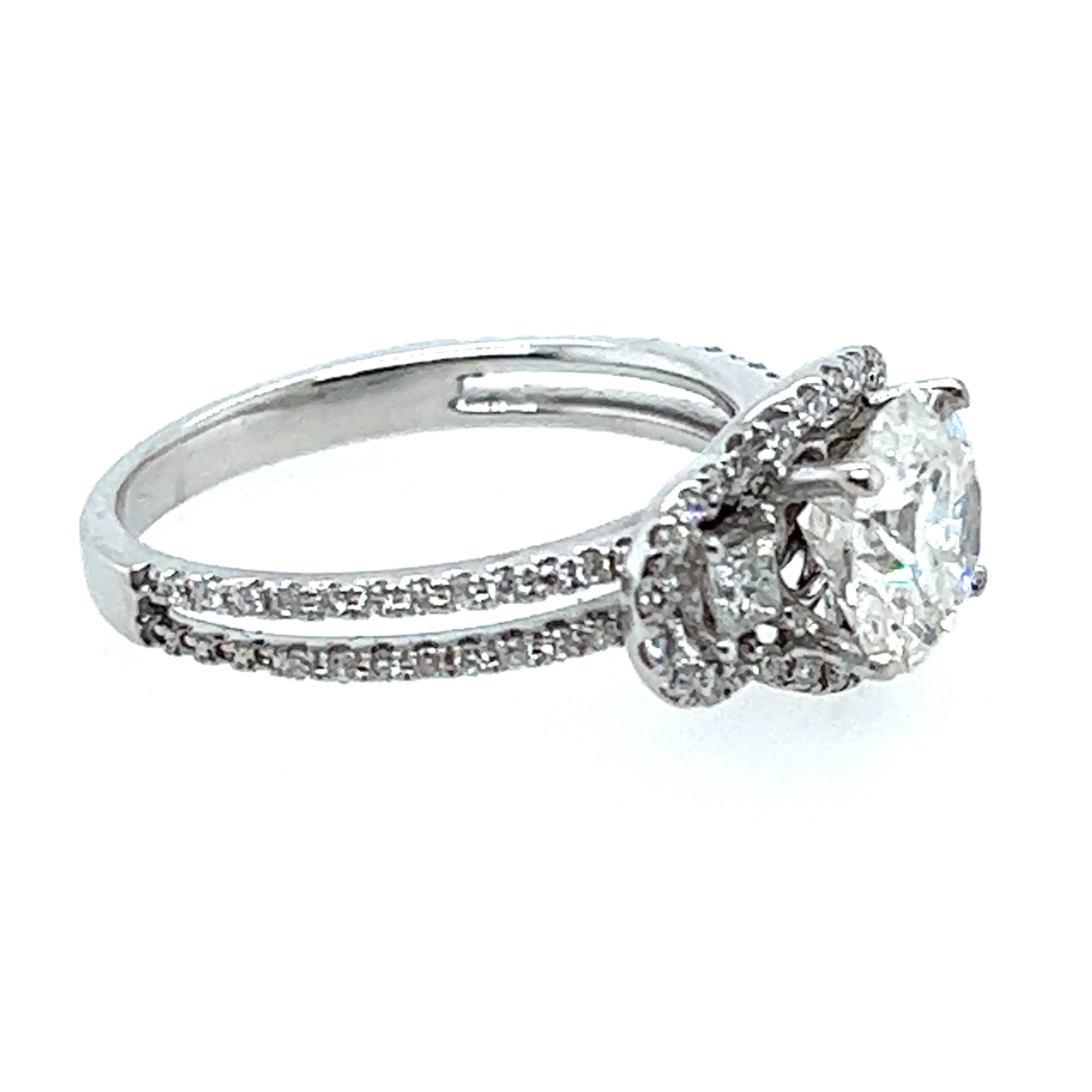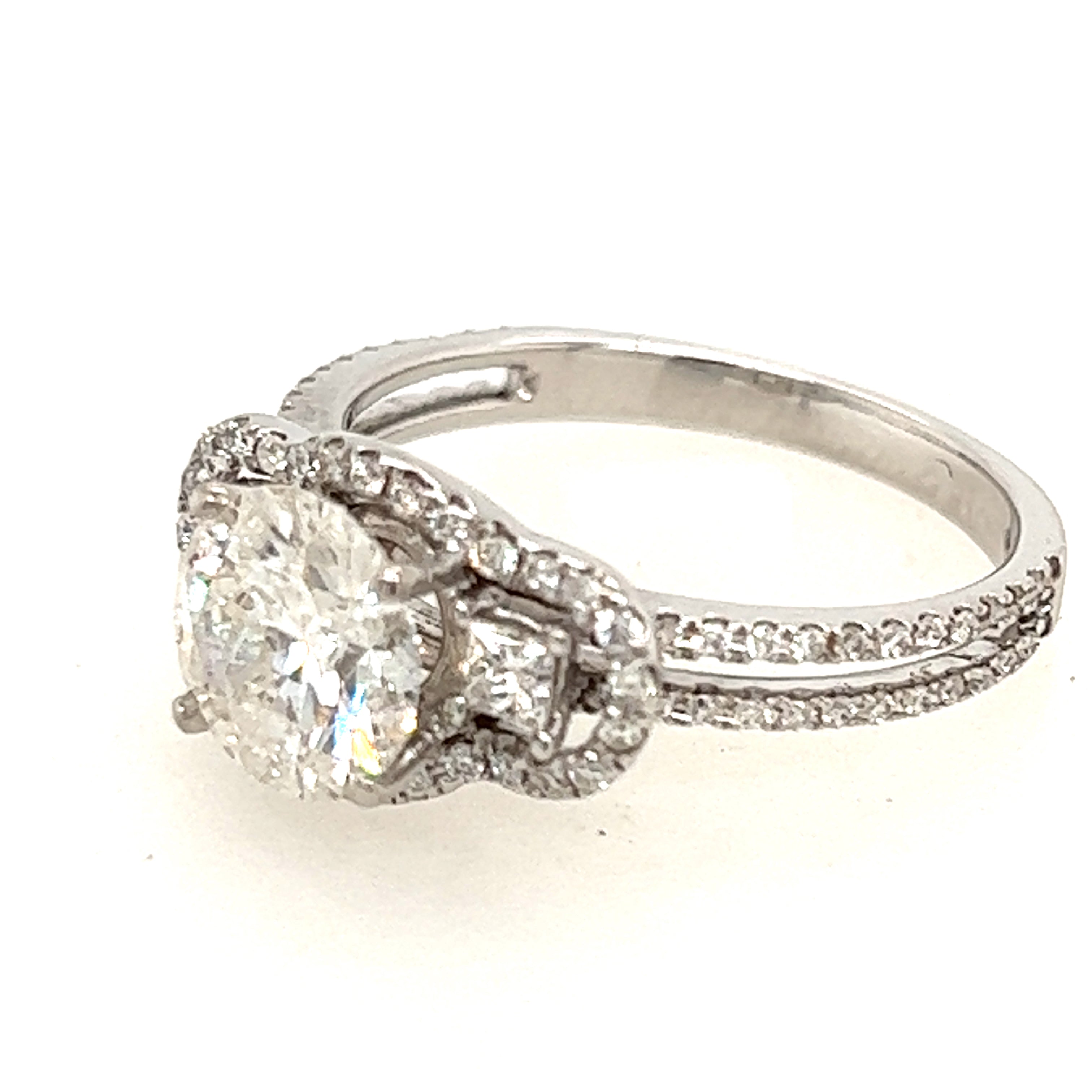 18ct white gold diamond engagement ring. The centre diamond is round brilliant cut – colour ‘H’ – ‘I2’ clarity and weighs 1.71cts. The 2 x ‘Princess’ cut side diamonds are colour ‘F’ – ‘SI2’ clarity and have a total eight of 0.10cts. The 96 x round brilliant cut diamonds in the band are colour ‘F’ = ‘SI2’ clarity and have a total weight of 0.48cts. The total weight of the diamonds in the ring is 2.29cts.