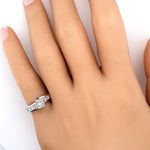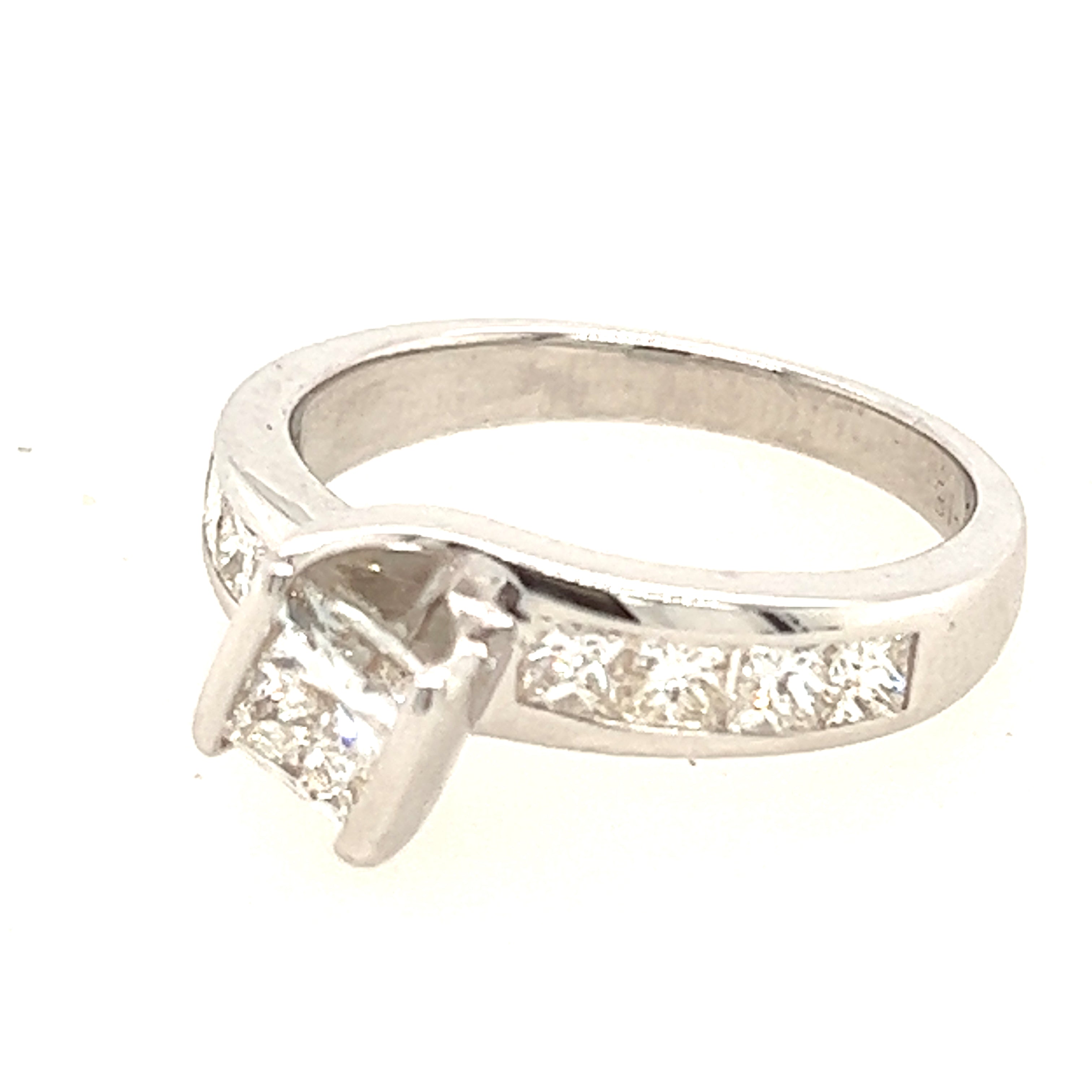 18ct white gold diamond ring with a 2.1mm – 3.3mm flat tapered shank which runs up to form a tension mount set with a 0.50ct princess cut diamond with a further four princess cut diamonds channel set in each shoulder with a total weight of 0.50ct.