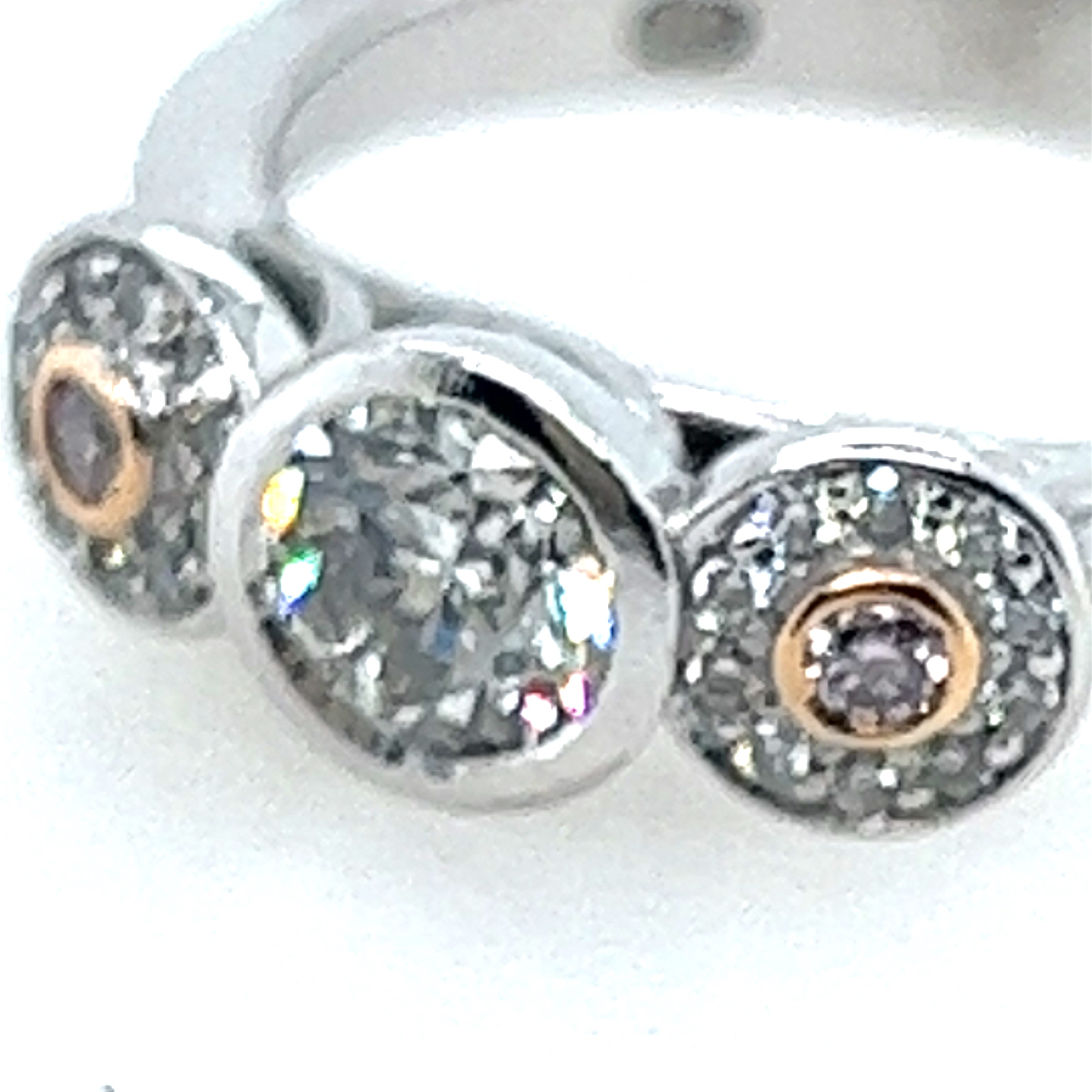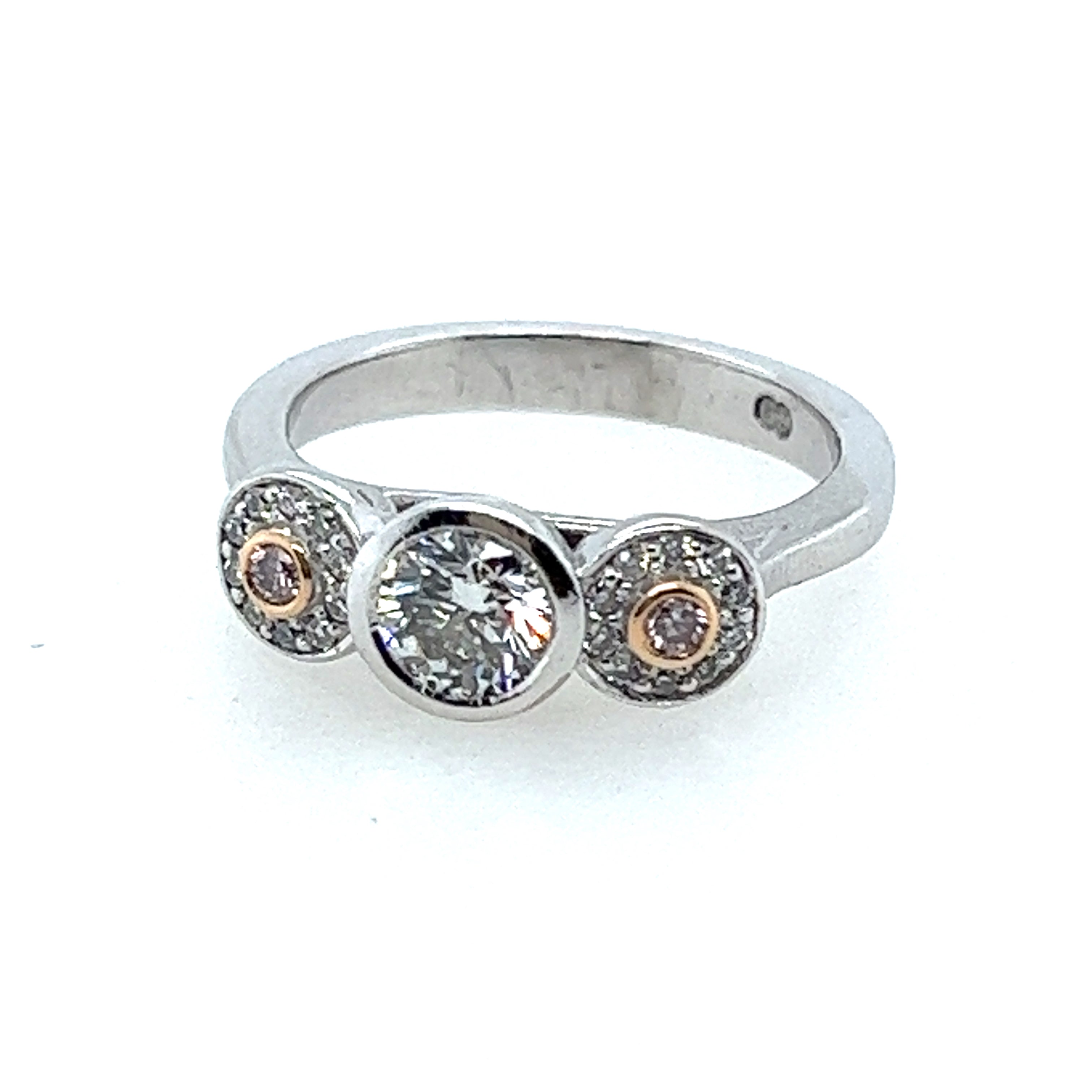 On offer is this stunning 18ct white gold diamond set 'Trilogy' style ring. If you are looking for an amazing engagement/wedding ring, then this is the ring for you or your partner. One centre diamond with two pink diamonds surrounded by brilliant cut diamonds.