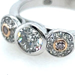 The two outer circles are set with a fancy pink 0.06ct round brilliant cut diamond in the centre surrounded by 0.10cts of round brilliant cut diamonds – colour ‘F’ and S11 clarity.