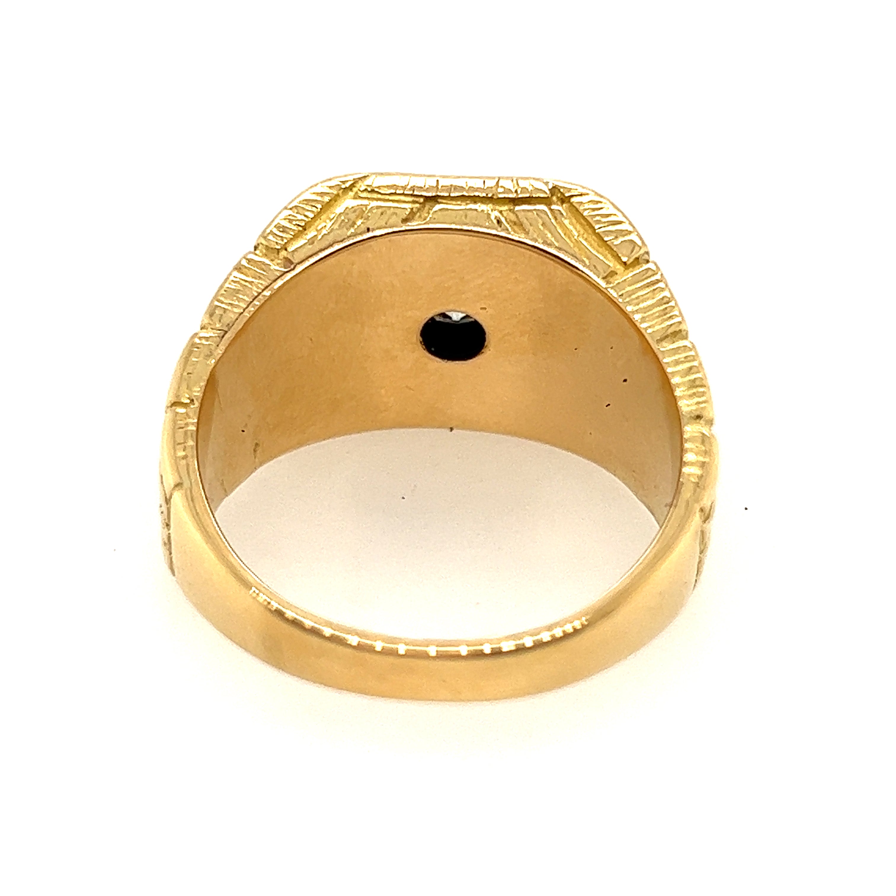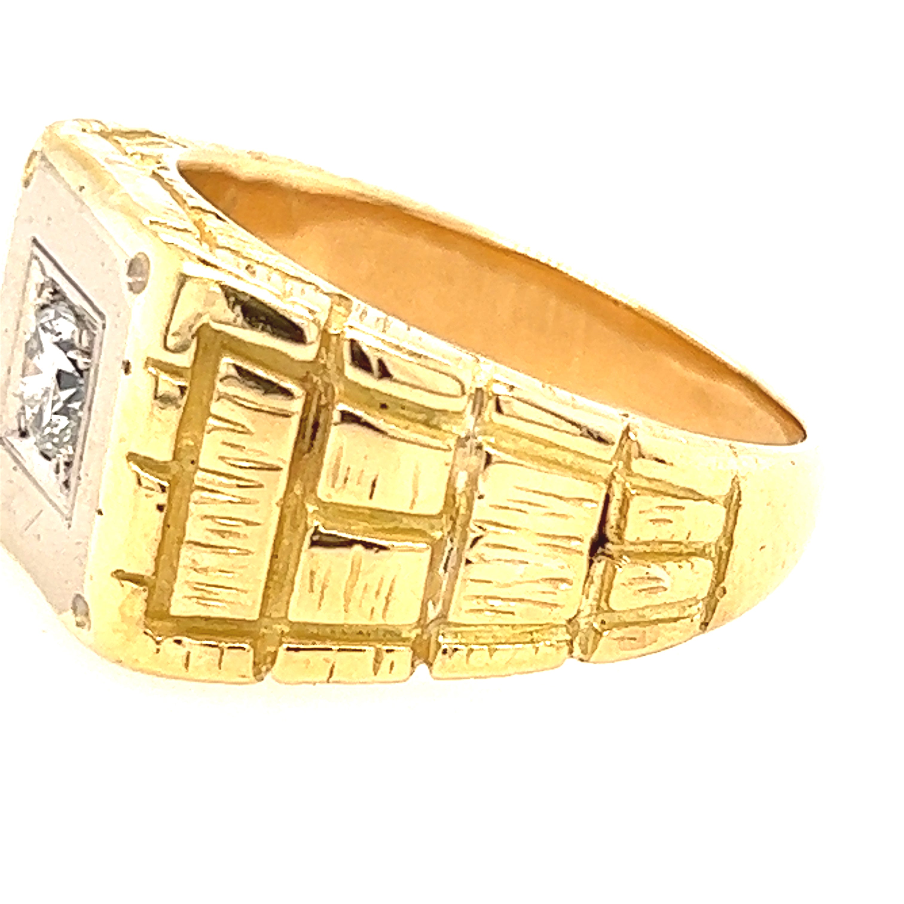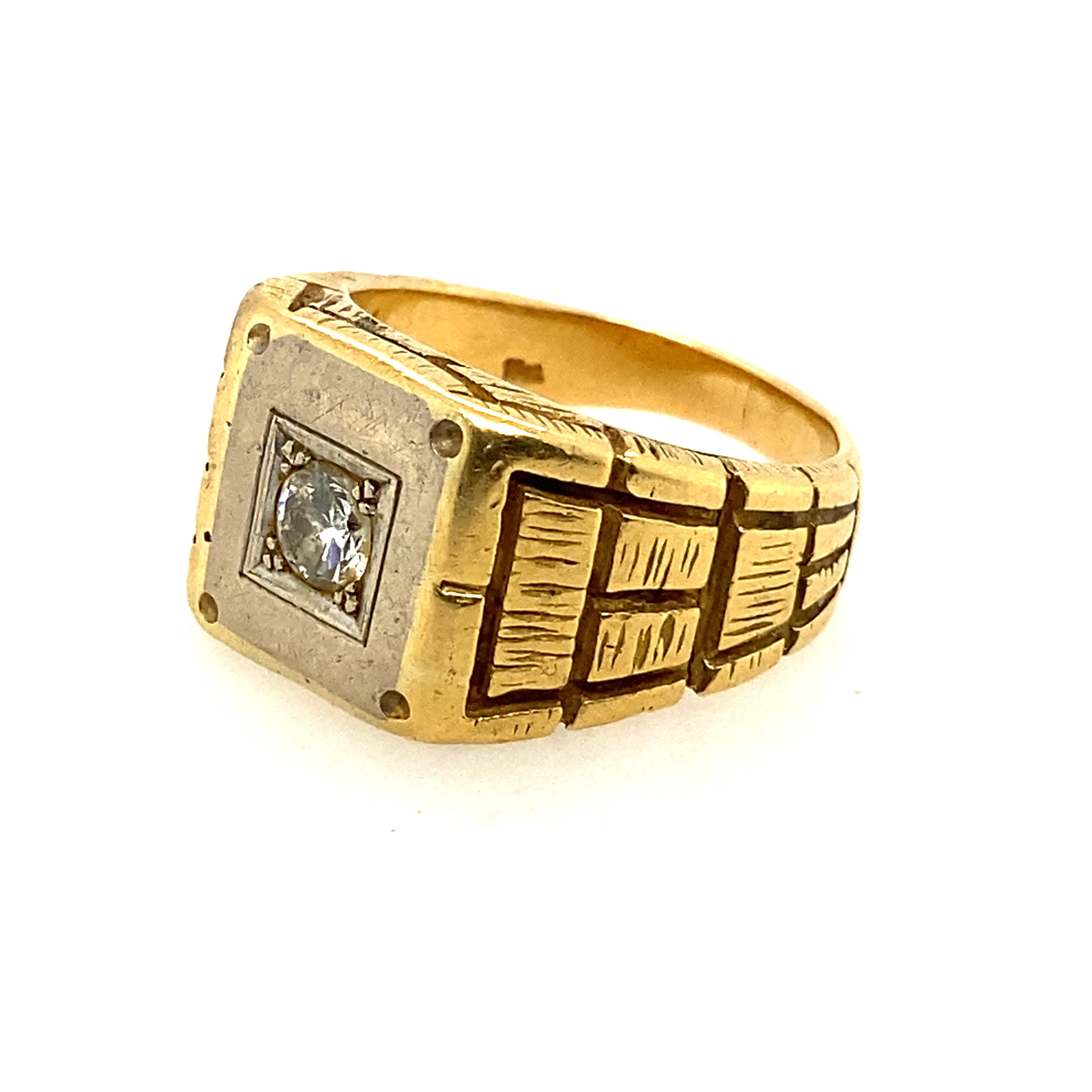 18ct yellow and white gold diamond ring with a 3.7mm – 6.7mm tapered shank and patterned shoulders running up to a 15.1mm wide head with a white gold plate grain set with a 0.50ct brilliant cut diamond colour “G” and clarity “SI”.