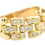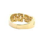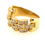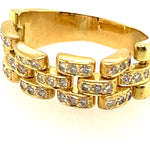 Description: This remarkable ring is crafted from 18ct yellow gold and features a 4.4mm to 8.5mm flat tapered shank that elegantly transitions into an 8.1mm wide link section. Each of the fourteen links is expertly claw set with three brilliant cut diamonds, each weighing 0.005ct. The diamonds, with a color grade of "H" and clarity of "SI," add a dazzling sparkle to this exquisite piece, making it a true statement of elegance and sophistication.