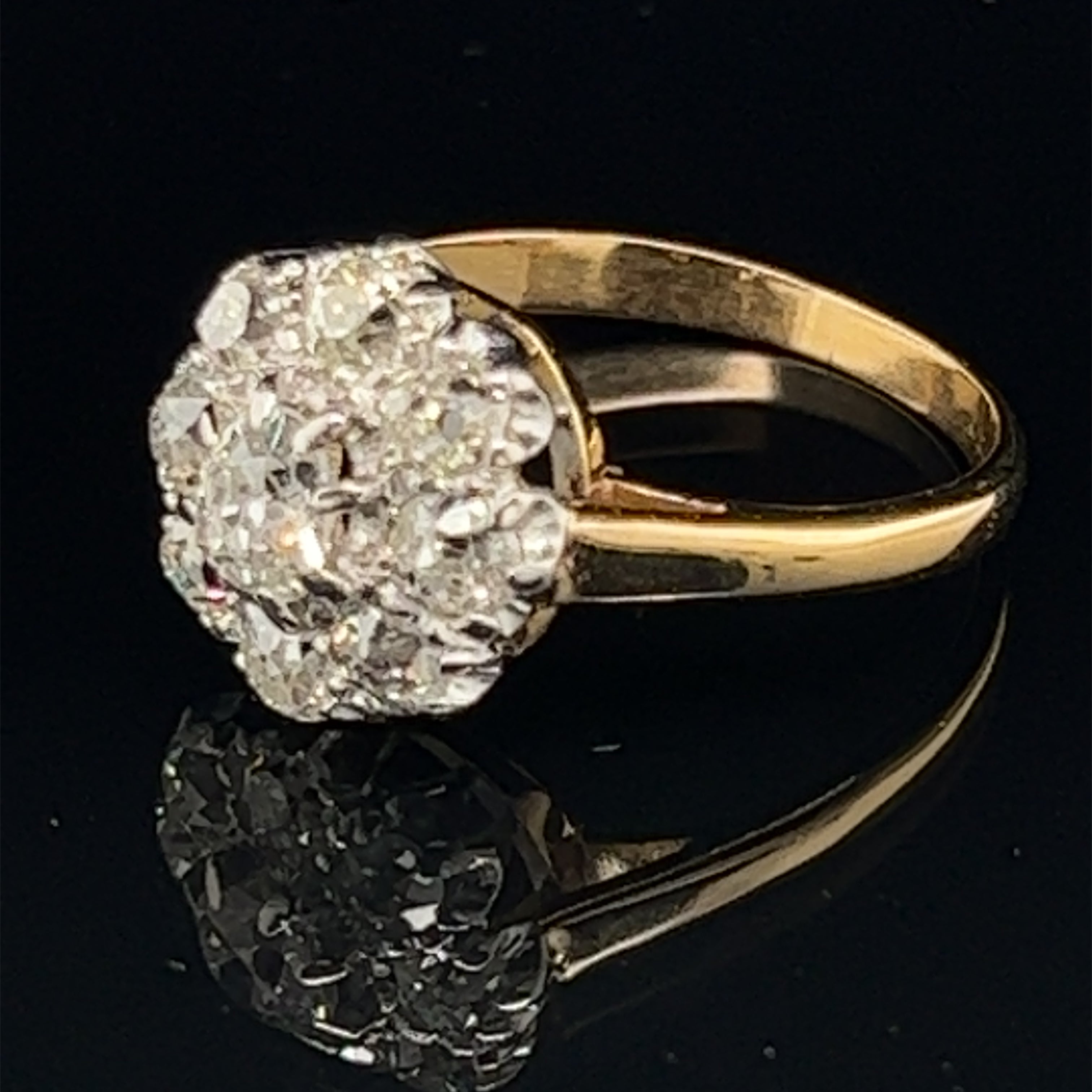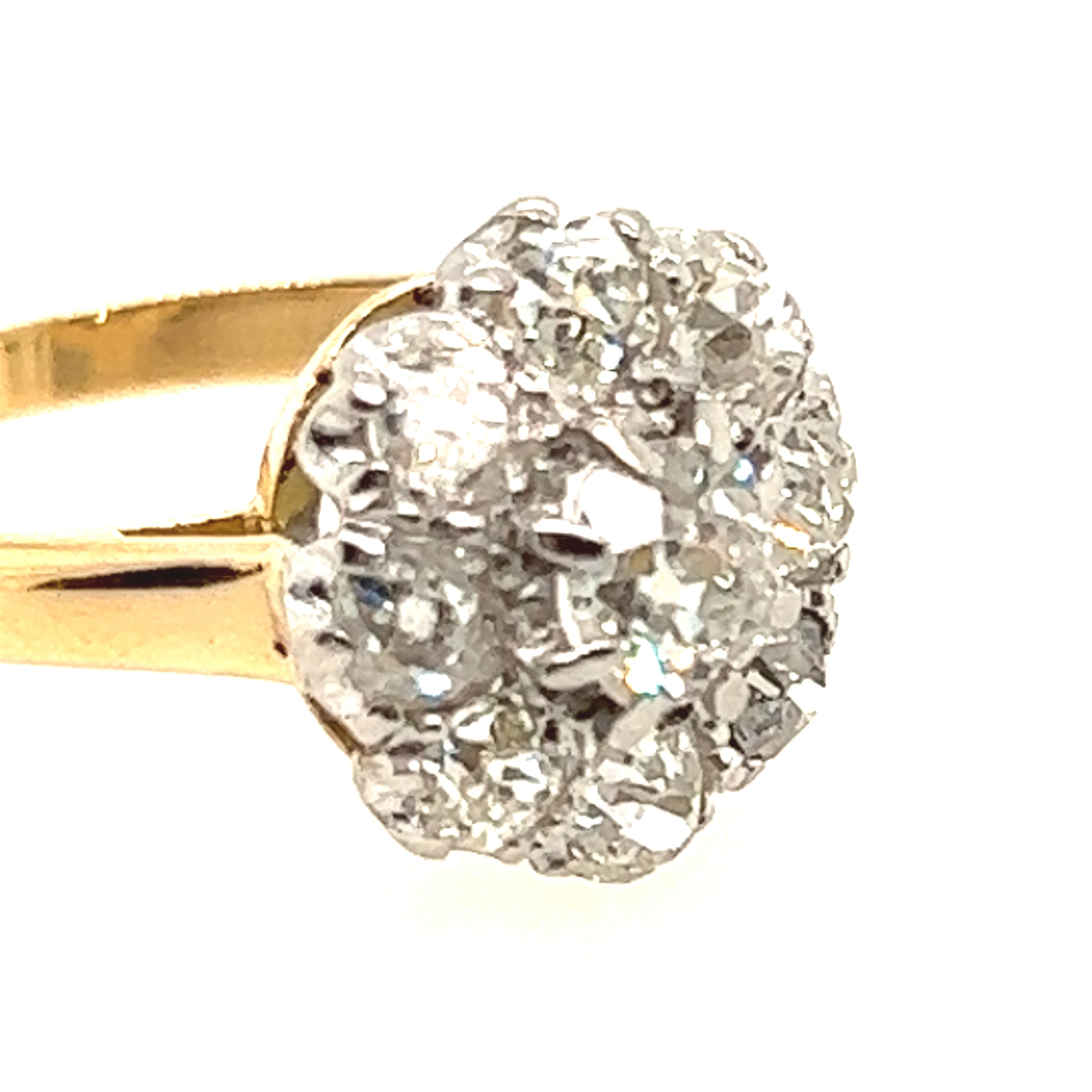 18ct yellow Gold Palladium and Platinum diamond ring with a 2.0mm – 2.4mm rounded tapered shank and square flow up shoulders holding a palladium and platinum mount set with a nine “old mine cut” diamonds colour “H/I” and clarity “SI/I!” with a total weight of 1.50ct.
