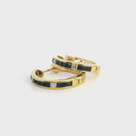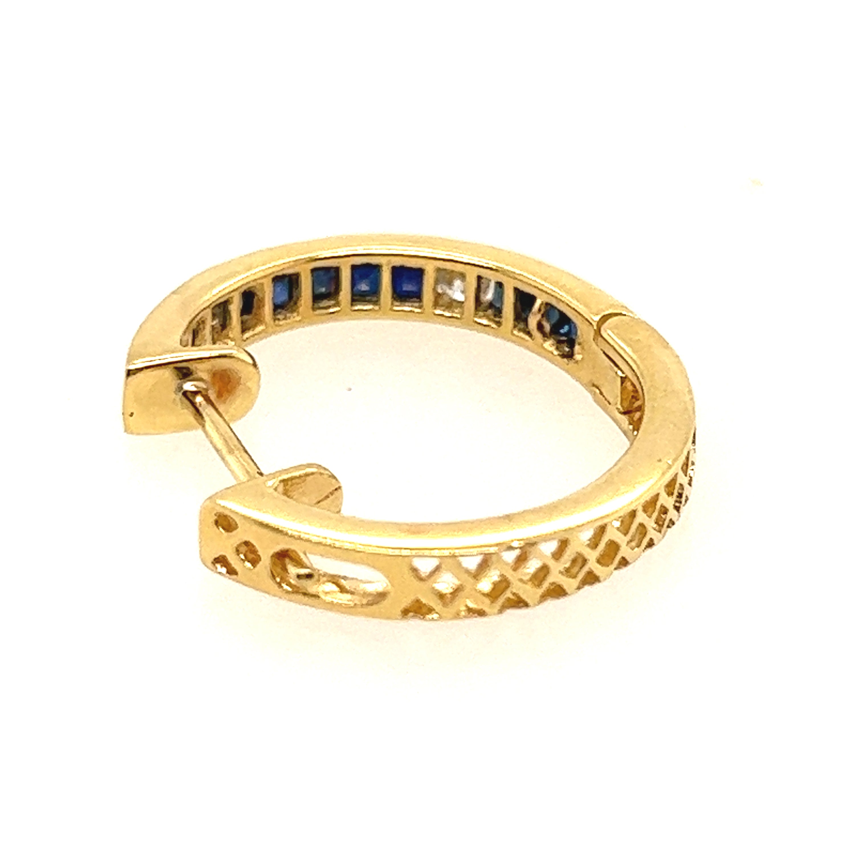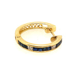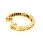 These breathtaking huggie-style earrings, crafted in 18ct yellow gold, are a perfect blend of sophistication and timeless elegance. Each earring is beautifully channel set with ten square-cut sapphires and two brilliant-cut diamonds, adding a striking contrast of deep blue and radiant sparkle.