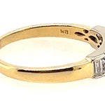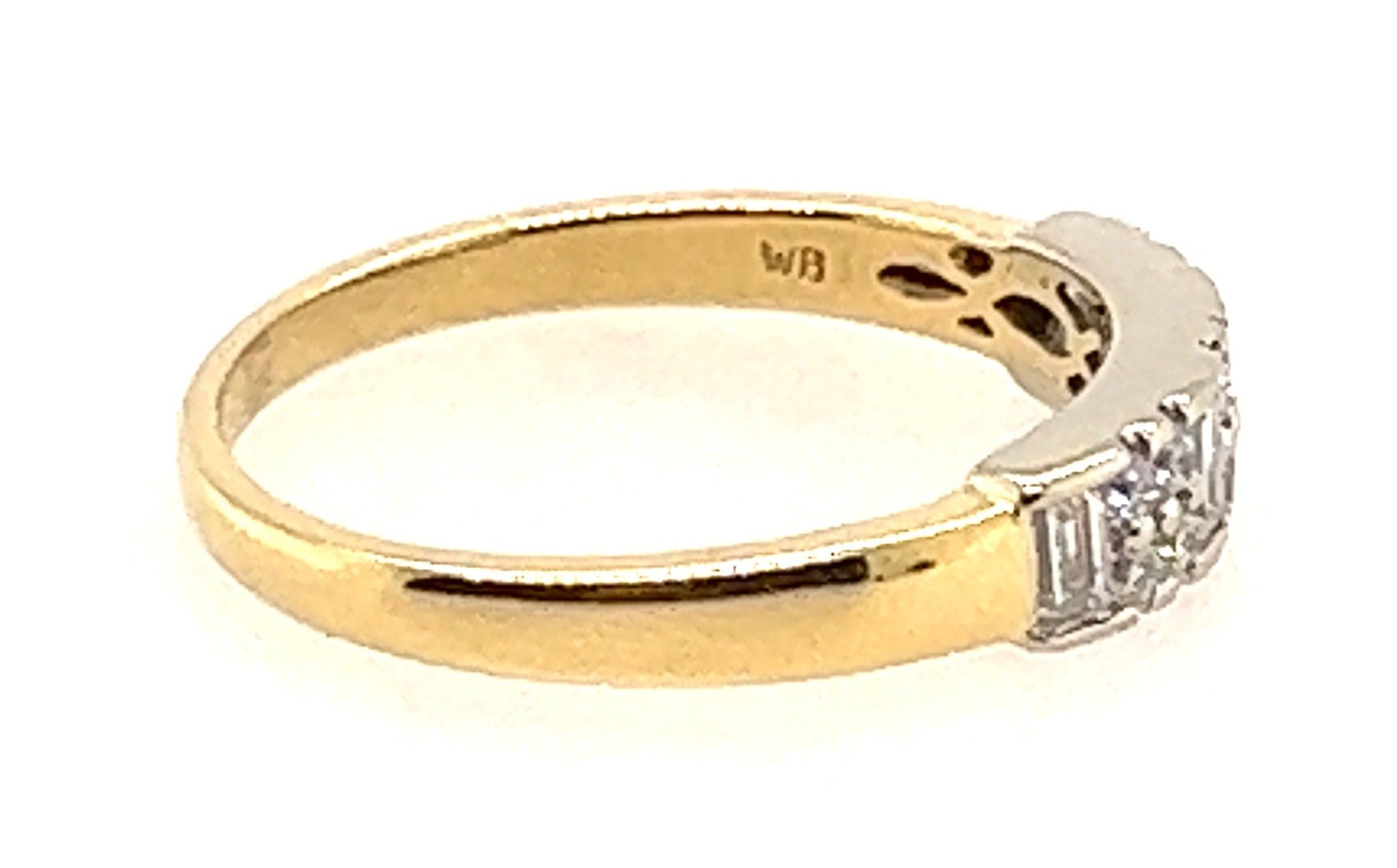 18ct yellow & white gold 16 stone Diamond ring. 12 round brilliant cut Diamonds shared claw & channel set in groups of 4 with 4 baguette Diamonds white gold end cap set in a yellow gold 1/2 round 1.9mm tapered band.