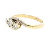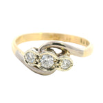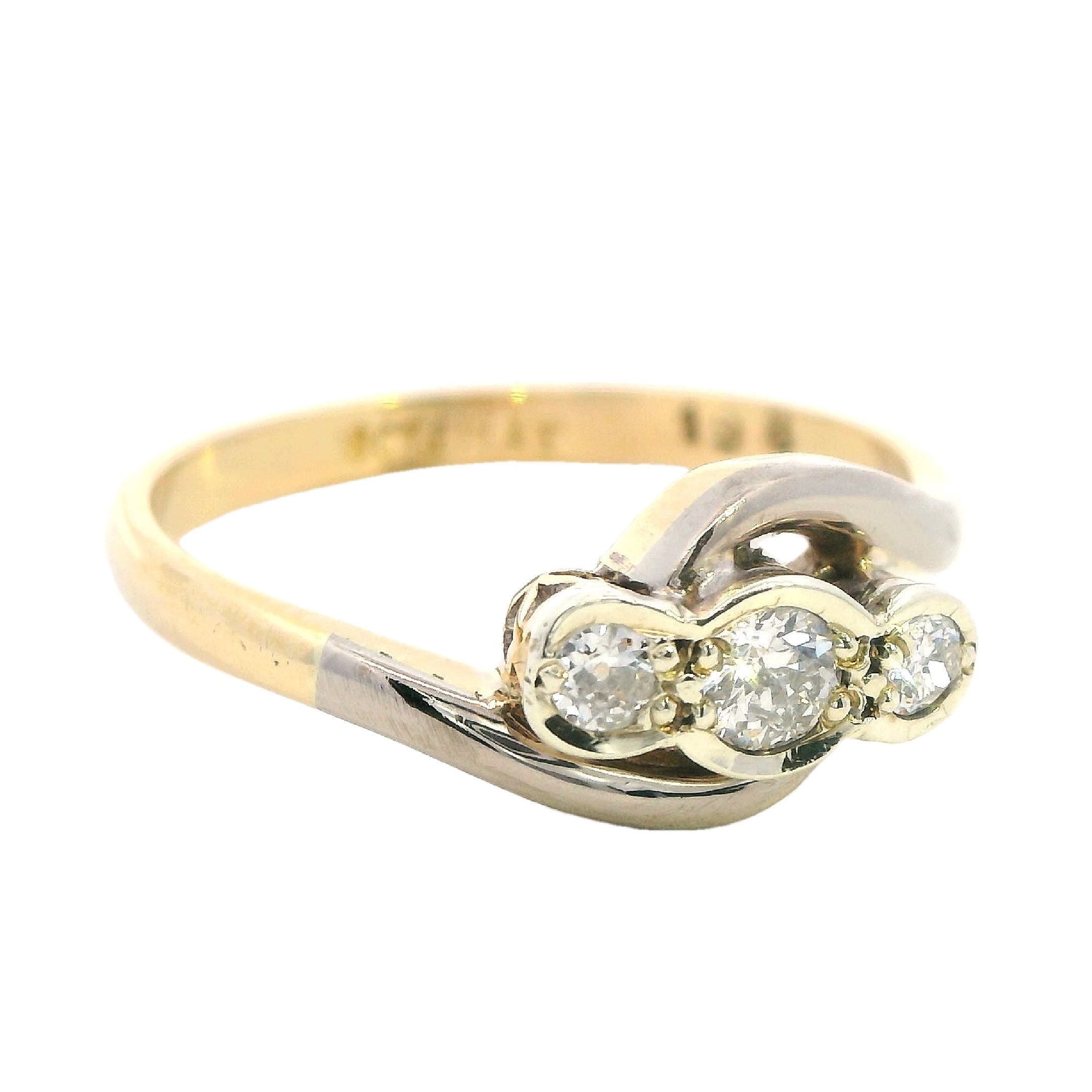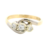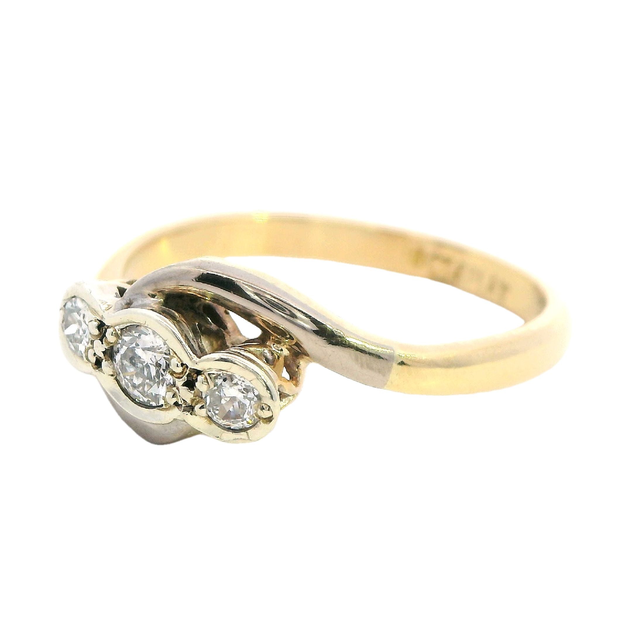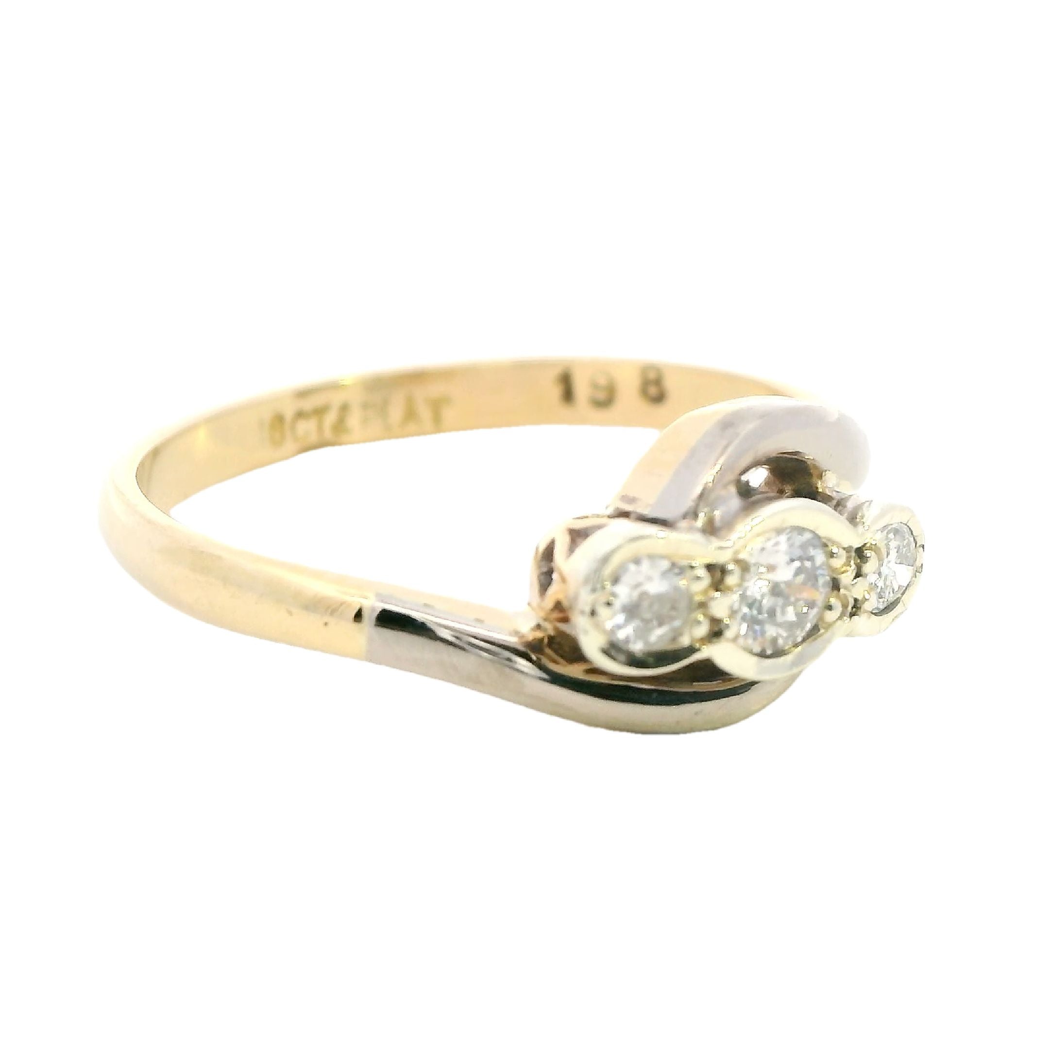 This elegant 18ct yellow and white gold ring from The Exclusive Jewellery and Antiques Company features three dazzling diamonds, set in a timeless design. The semi-modern cut diamonds are securely grain set in a white gold scalloped edge with pointed crossover shoulders. The design is completed with a 1/2 round yellow gold 2.1mm band, offering a perfect blend of classic and contemporary style.