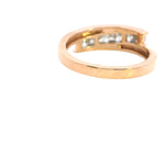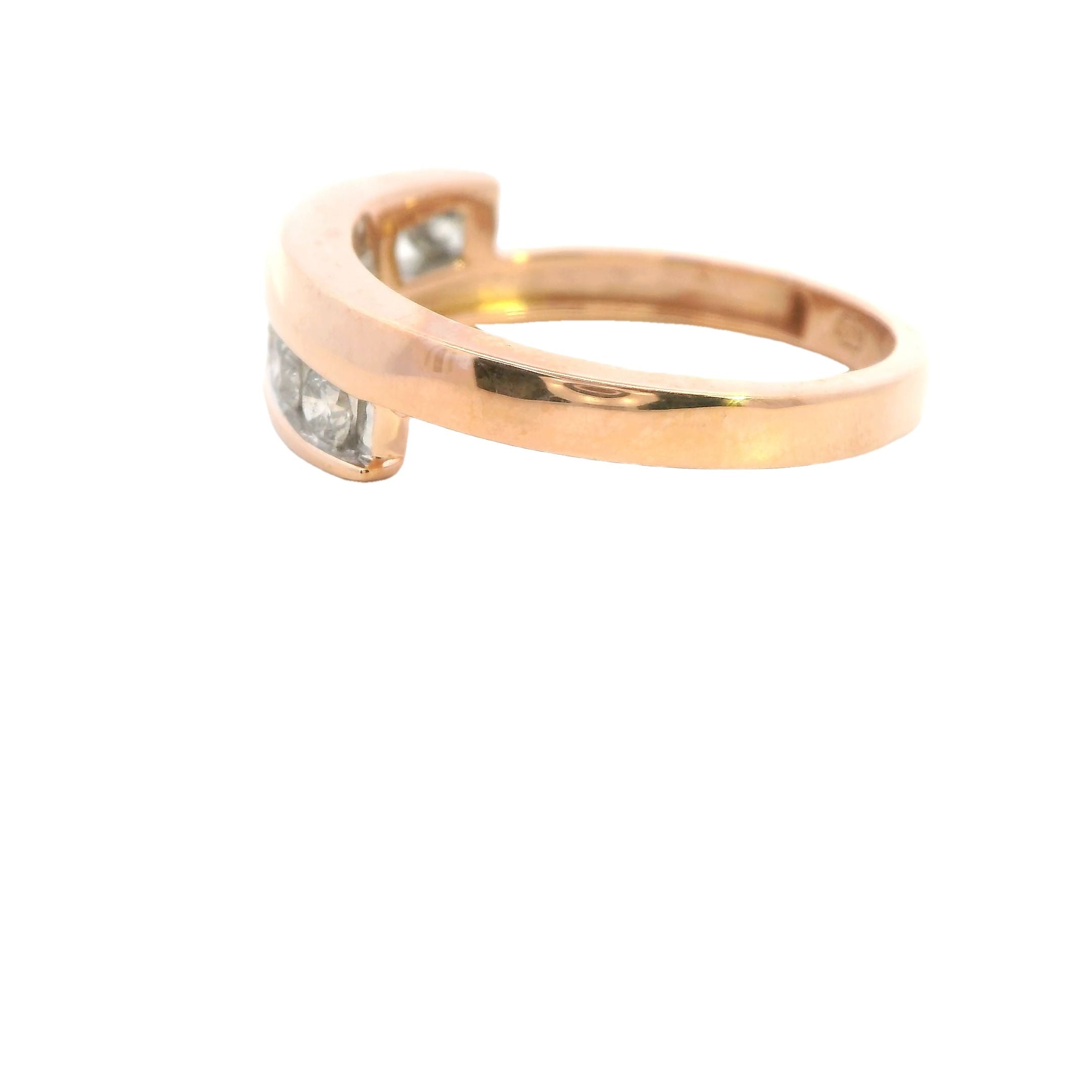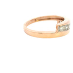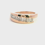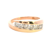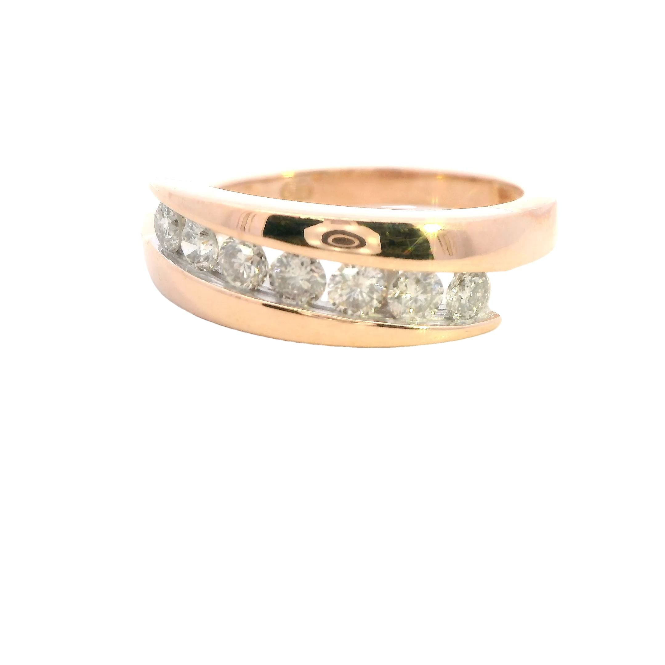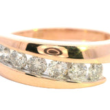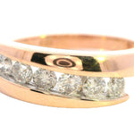 This stunning 9ct rose gold ring features a 2.4mm - 2.6mm flat tapered shank, which gracefully crosses at the head to form a channel mount. Set with seven brilliant cut diamonds, this ring offers a total diamond weight of 0.50ct. The diamonds are graded “J” in color and “I1” in clarity, providing a beautiful sparkle against the warm rose gold setting. This elegant ring is perfect for those who appreciate classic design with a modern twist, making it a versatile addition to any jewelry collection.