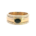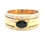 This beautiful 9ct yellow gold ring features an exquisite combination of sapphire and diamonds. The oval sapphire is part rub over set and accented by five single cut diamonds, rhodium plated and grain set in split outer edges on a quarter round 8.1 - 6.75mm band. This piece blends sophistication with timeless beauty.
