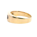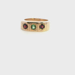 This stunning 9ct yellow gold ring features three exquisite tourmaline stones, expertly set in a square grain setting on a soft edge flattened top tapered band. This piece is a perfect blend of elegance and craftsmanship.