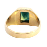 This exquisite ring from The Exclusive Jewellery and Antiques Company is crafted in 9ct yellow gold, featuring a bold design that is perfect for the discerning gentleman. The ring boasts a 3.9mm flat tapered shank leading up to a striking 12.9mm wide head, which is bezel set with a stunning 9mm x 7mm, 2.30ct step-cut blue/yellow parti sapphire. This unique gemstone makes the ring an exceptional piece that stands out in any collection.