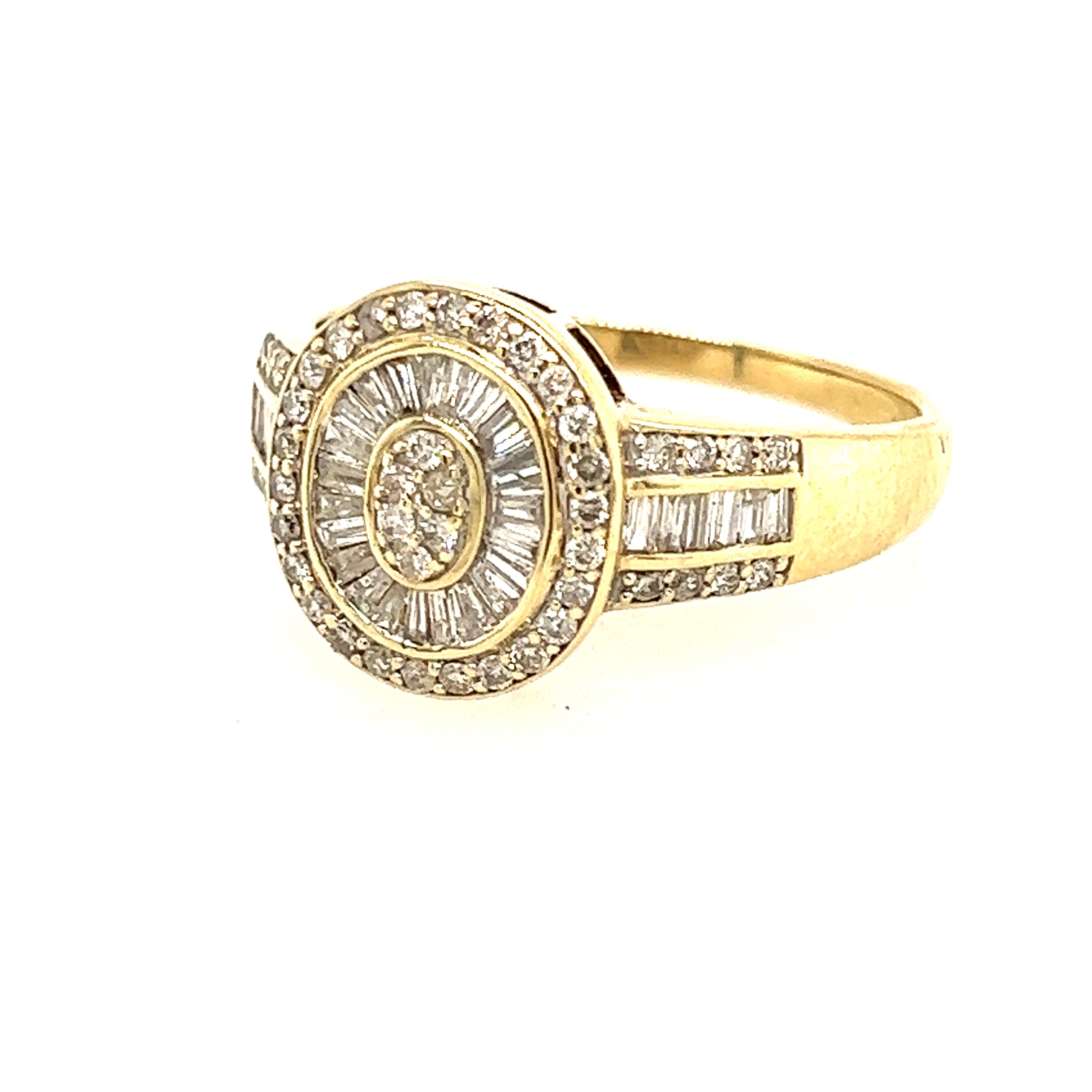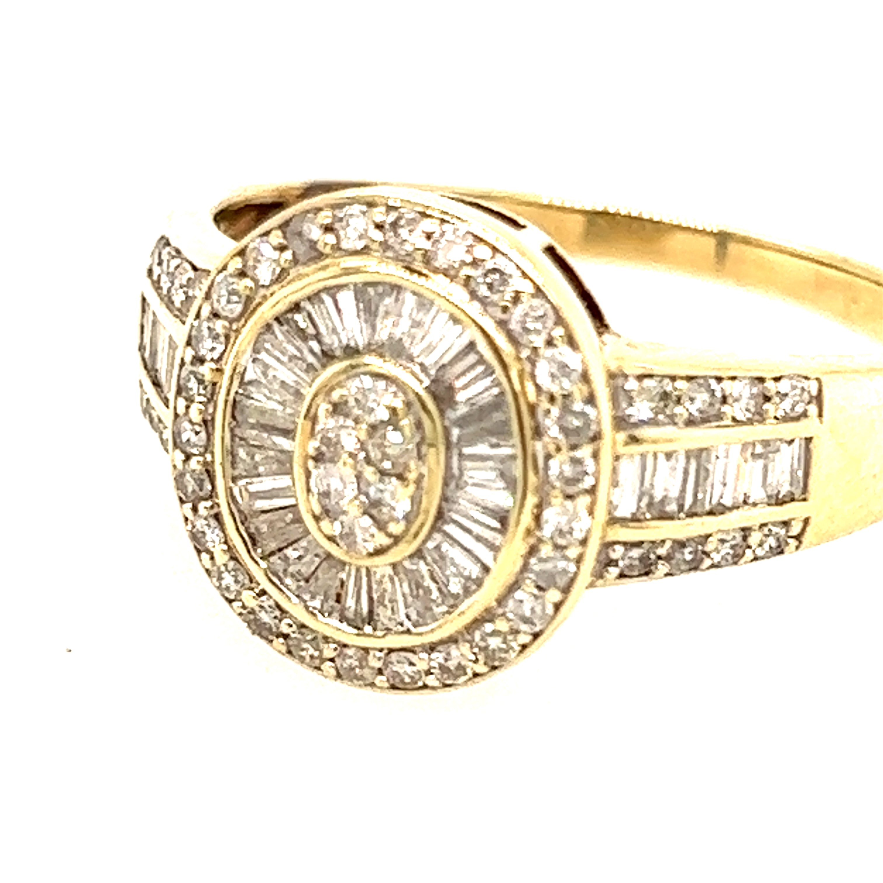 9ct yellow gold diamond ring with a 2.0mm – 5.3mm flat tapered shank thickening at the shoulders to hold a 13.9mm x 12.6mm Halo style head set with six 0.01ct single cut diamonds surrounded by twenty-six tapered baguette cut and twenty-six brilliant cut diamonds.