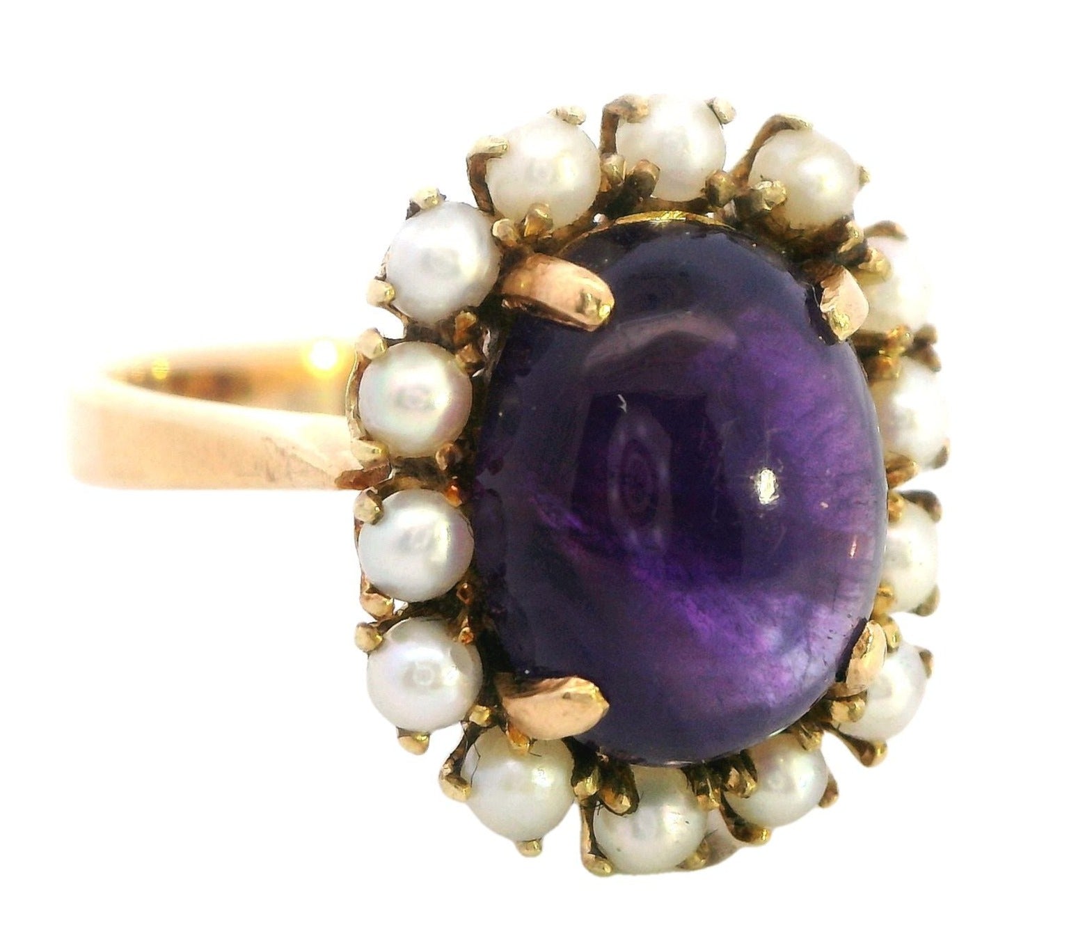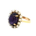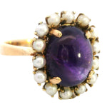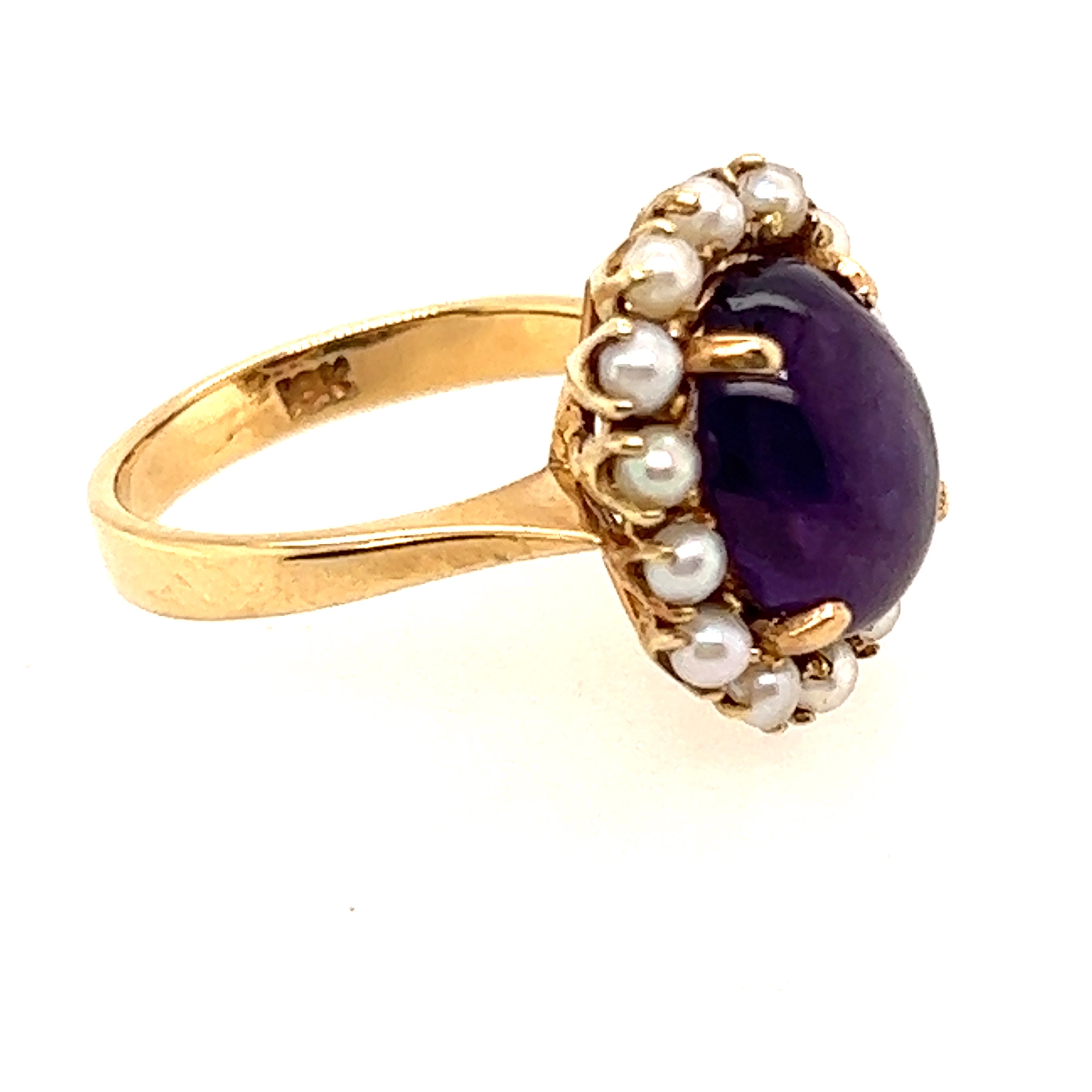 This exquisite 18ct yellow gold ring features a stunning oval cabochon amethyst surrounded by fourteen cultured pearls. The amethyst is securely set with four claws, and the pearls are also set with four claws each, creating a beautiful cluster design. The ring showcases pointed solid swept up shoulders on a soft edge flat 2.6mm band, blending elegance with durability.