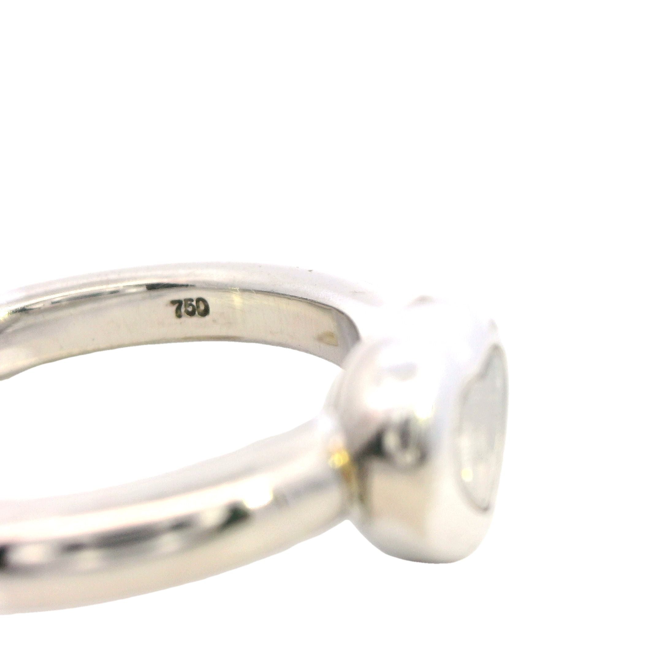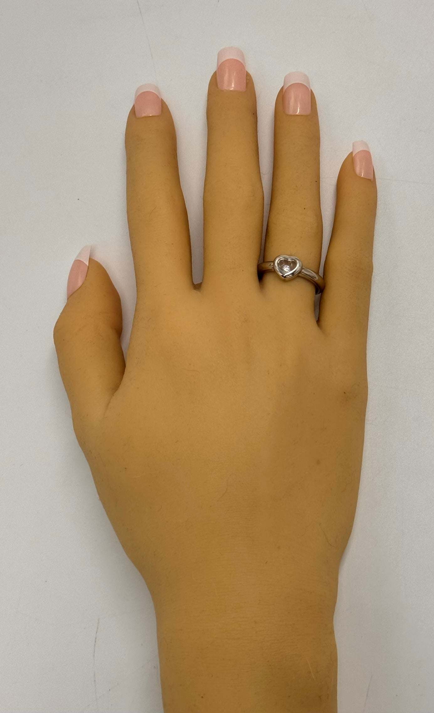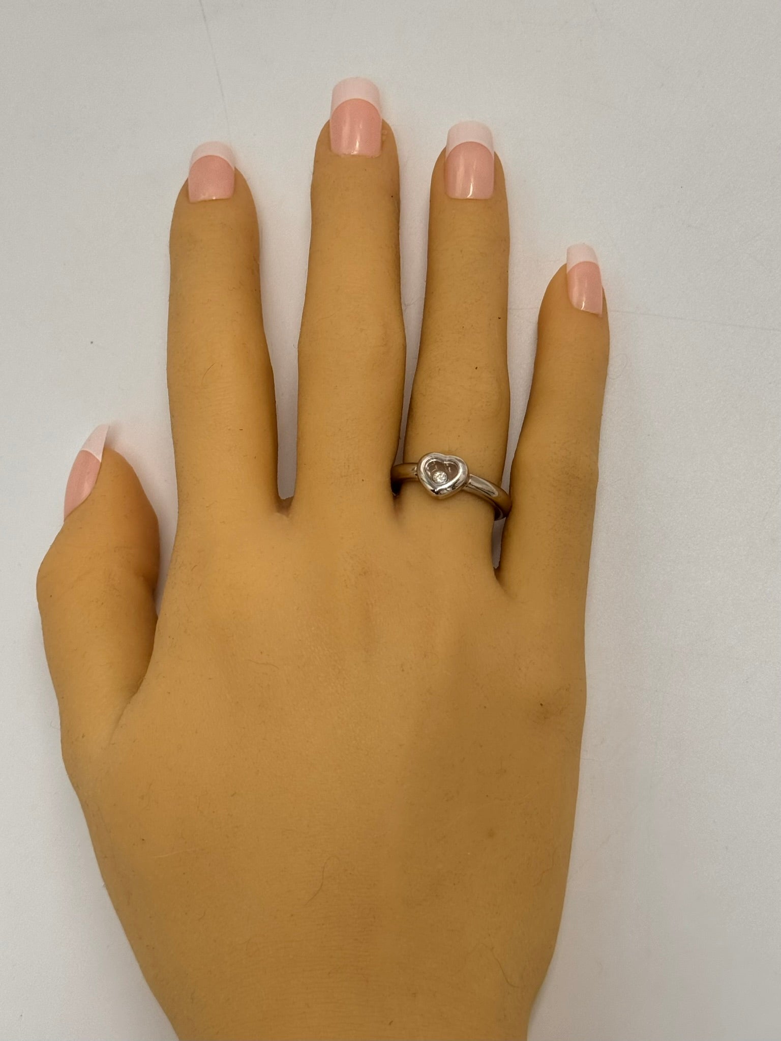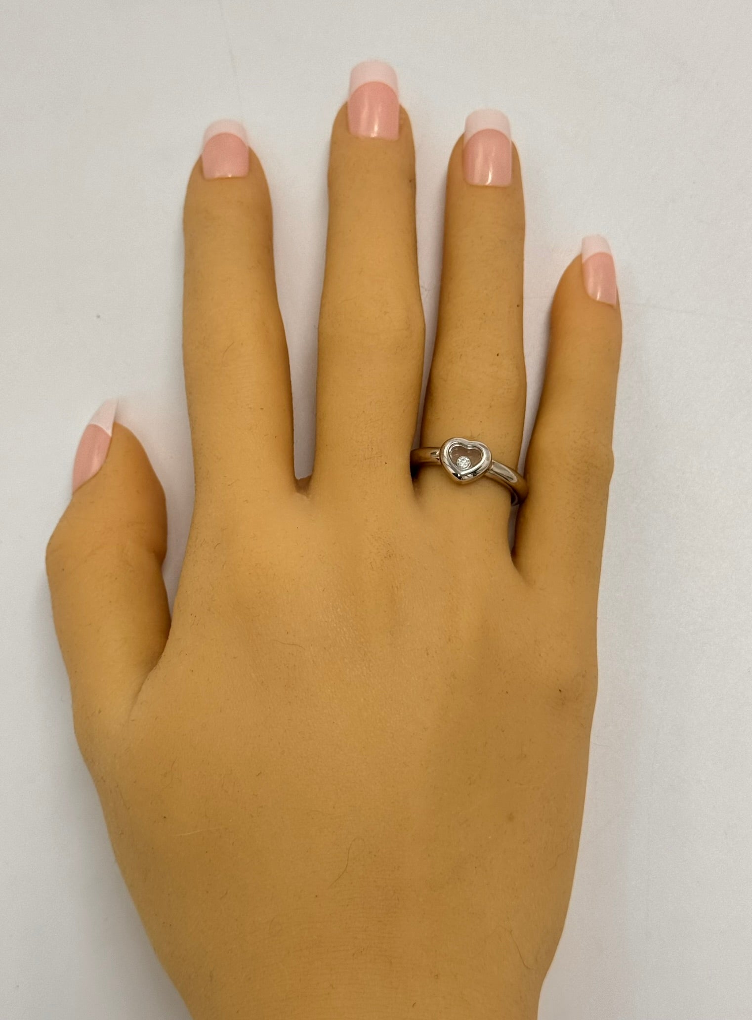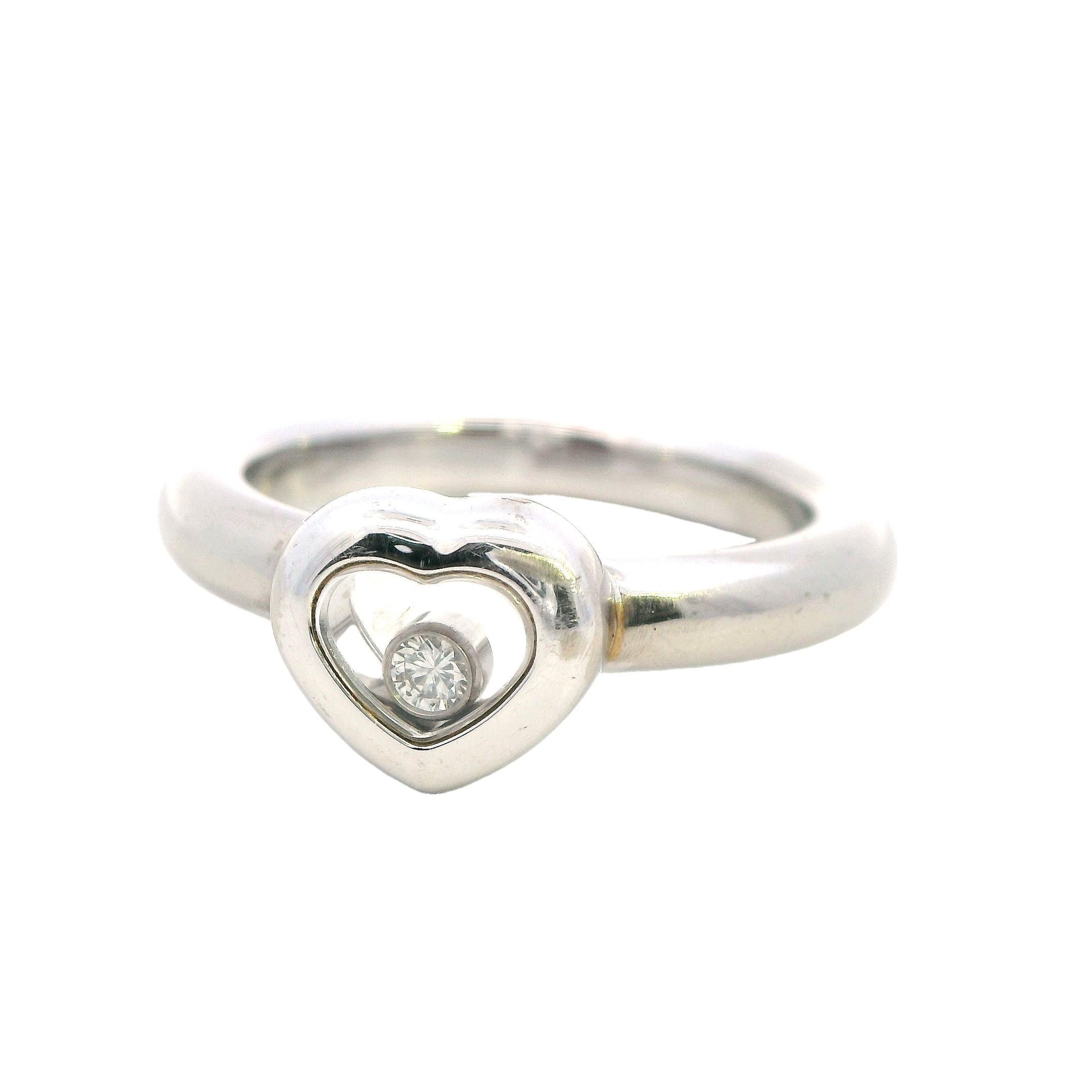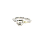 This stunning Chopard "Happy Diamonds" ring is a truly remarkable piece, handmade to the highest standards of luxury. The ring features a 3.2mm half-round shank that elegantly flows into a heart-shaped head, which showcases two sapphire crystal glasses. Between the glasses, a bezel-set 0.05ct brilliant cut diamond floats freely, embodying the whimsical yet refined spirit of Chopard's iconic "Happy Diamonds" collection.