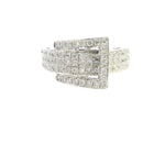 This stunning 10ct white gold diamond set buckle ring is a true statement piece, combining sophisticated design with brilliant sparkle. The ring features a flat tapered shank that widens to 12.0mm across the head, showcasing a luxurious buckle design. Grain set with seventy-two brilliant-cut diamonds, totaling 1.00ct, this ring exudes elegance with diamonds of "H" color and "SI" clarity, ensuring exceptional brilliance from every angle.