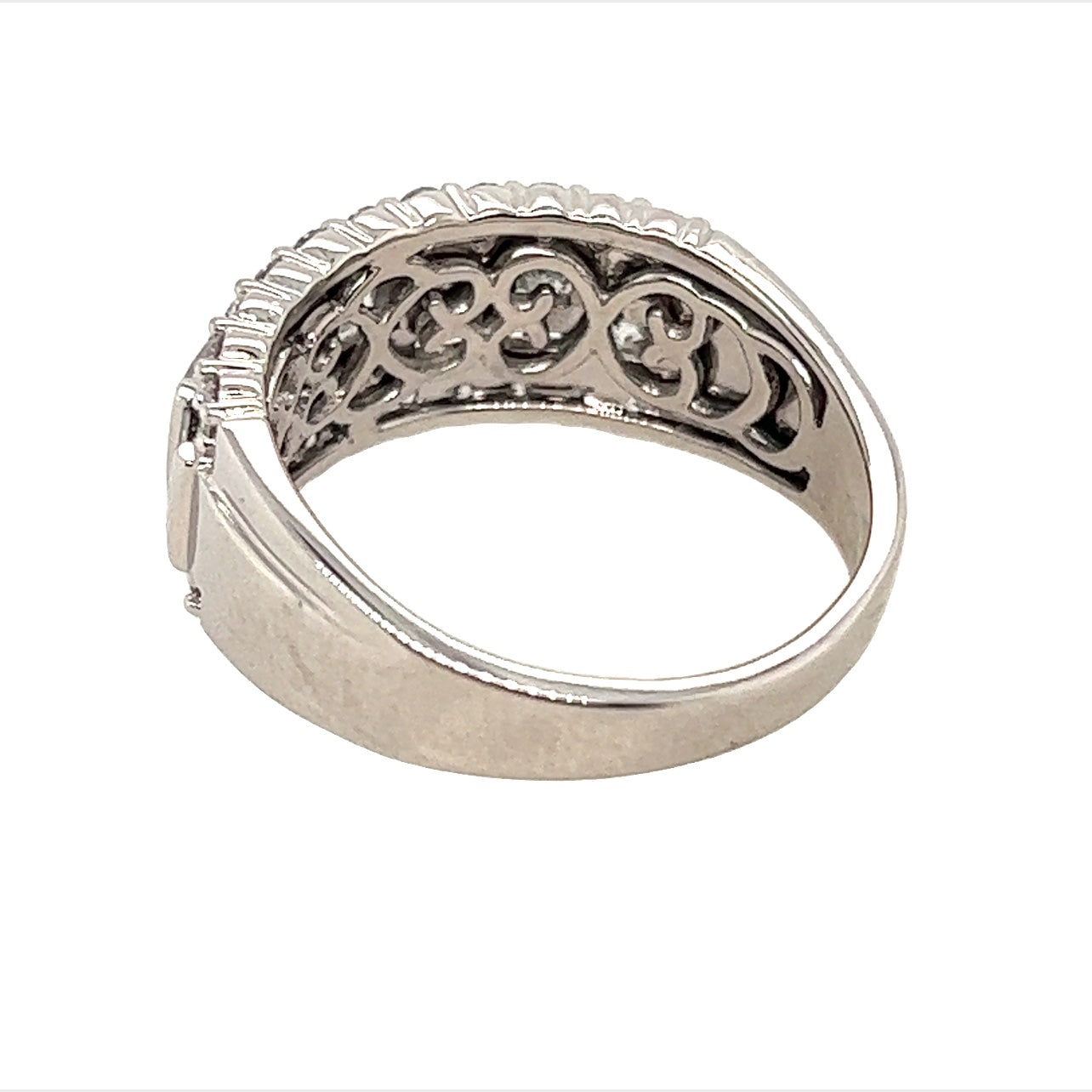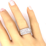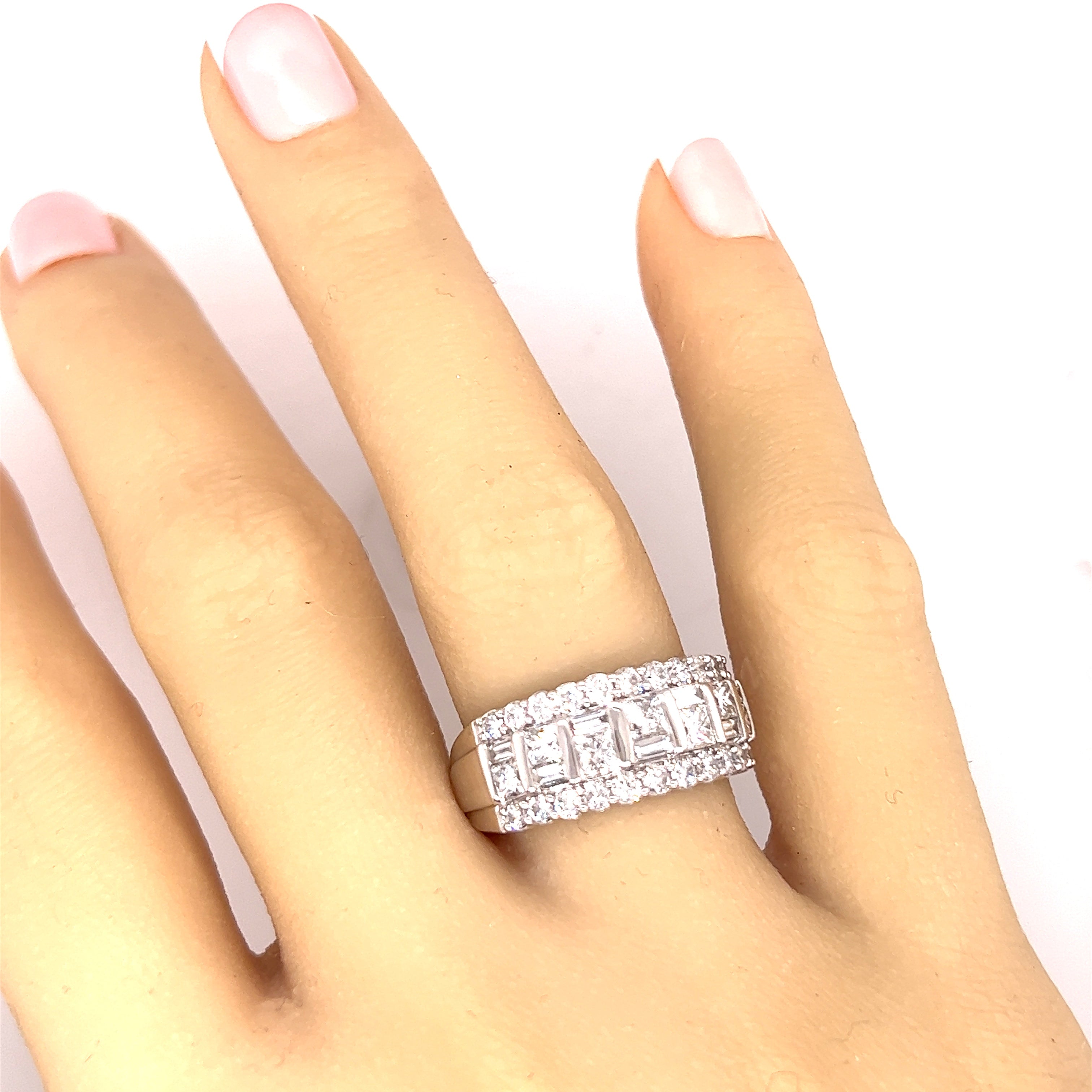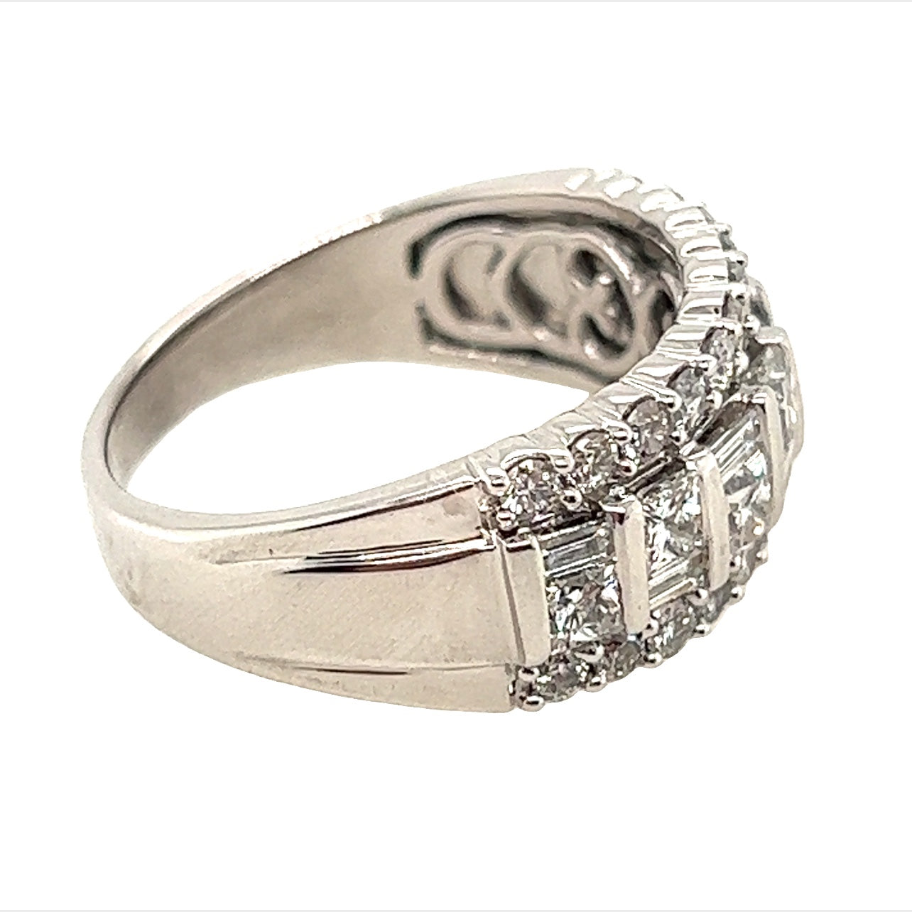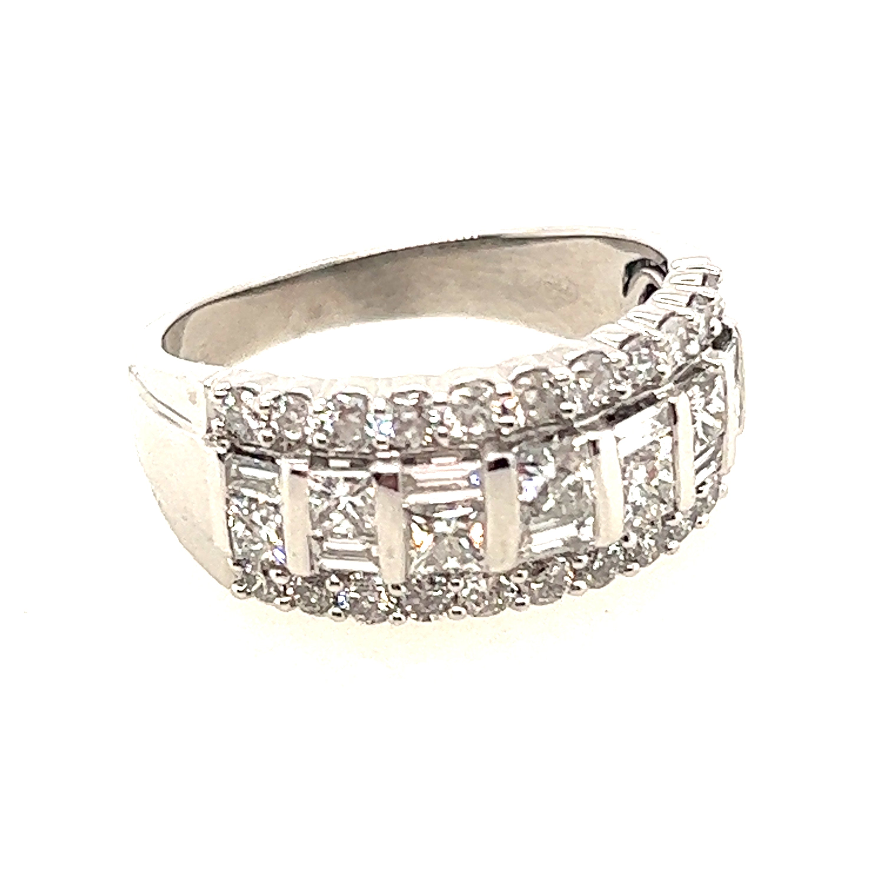Cast white gold diamond ring with a 3.2mm - 8.3mm flat tapered shank widening to 9.5mm across the head which is set with eleven brilliant cut diamonds on each side of seven princess cut and seven baguette cut diamonds. The diamonds are colour "H" and clarity "SI" and have a total weight of 2.00ct. The ring is stamped 750 and weighs 7.9gms.