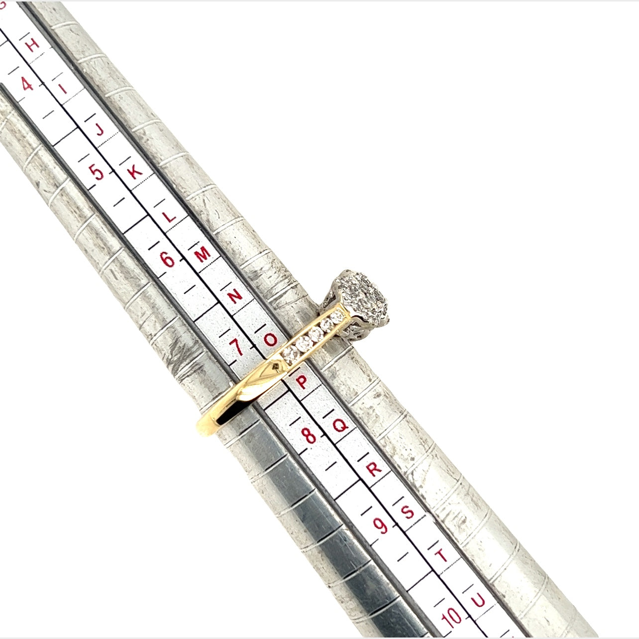 2.2mm - 2.7mm flat tapered shank and square flow up shoulders holding a white gold mount with three round flower style mounts claw set with a total of fifty-eight brilliant cut diamonds with a further five brilliant cut diamonds channel set in each shoulder.