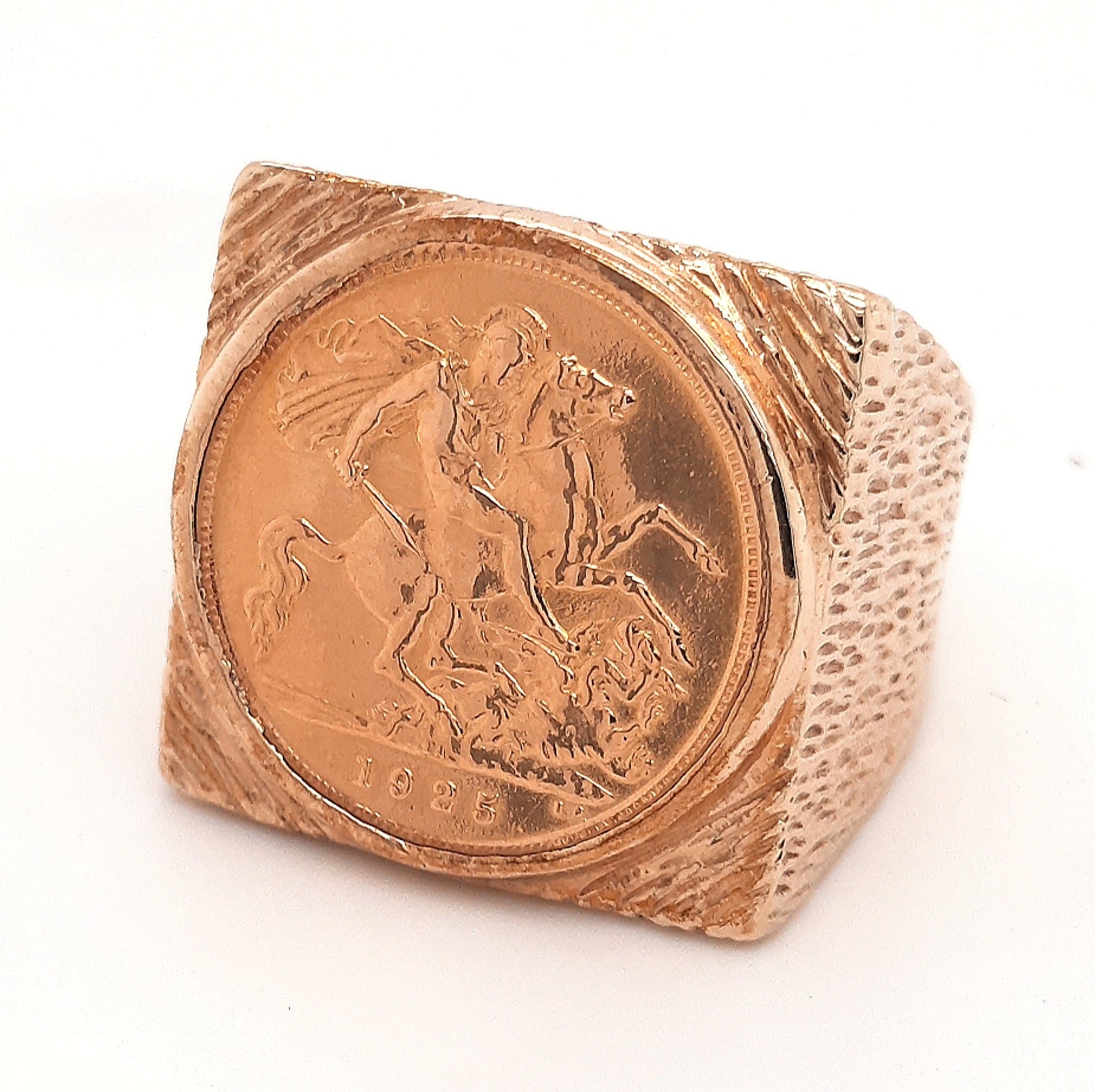 Cast yellow gold coin ring with a 4.5mm - 10mm flat tapered shank with patterned shoulders running into a 21.3mm x 22.2mm flat head bezel set with a half sovereign coin.