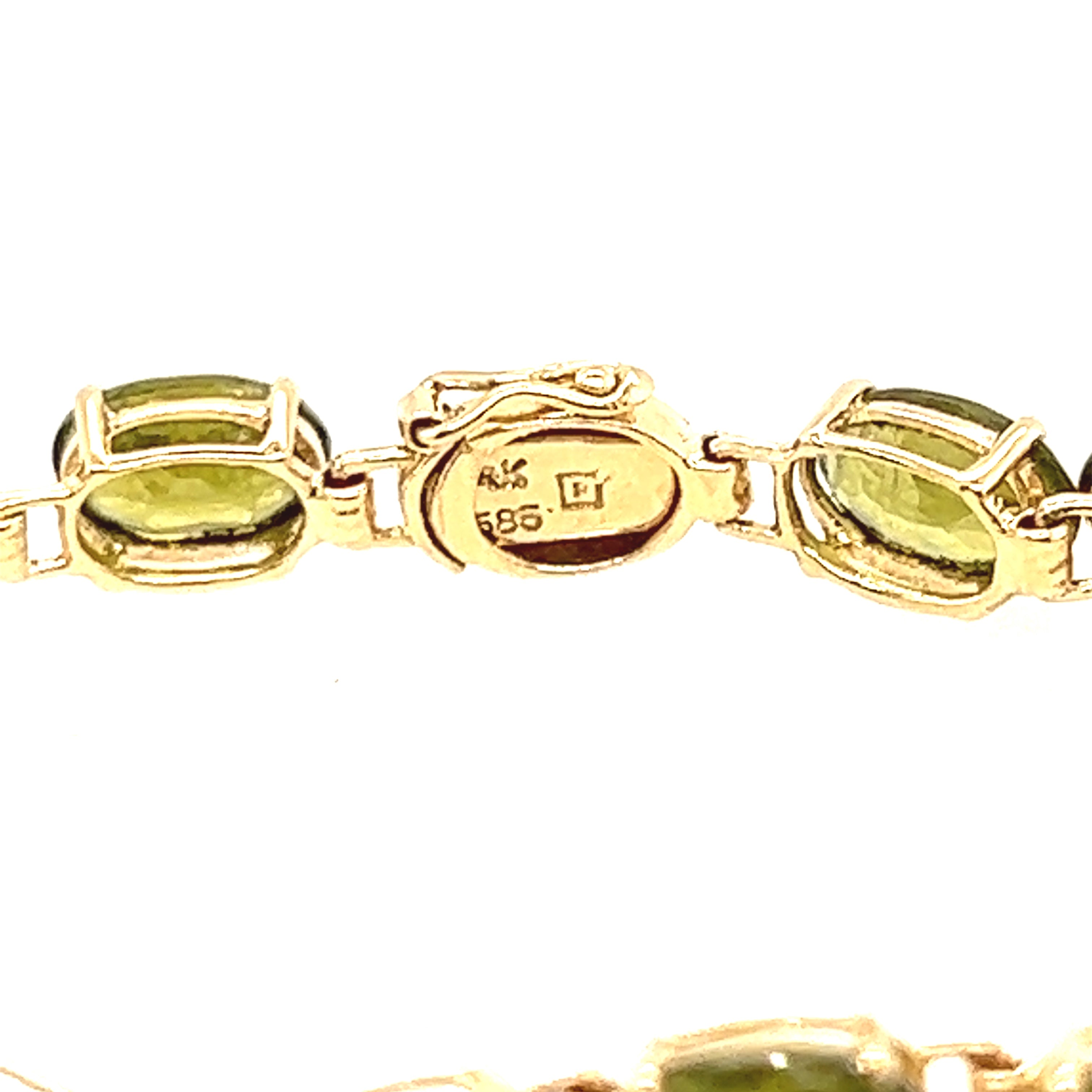 14ct yellow gold 19 stone Peridot bracelet. 19 oval peridot 4 claw set wtih oval box clap with figure 8 catch.
