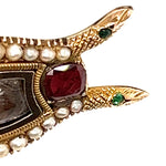 9ct Yellow Gold Serpent Mourning Brooch with Garnet, Emerald & Seed Pearl