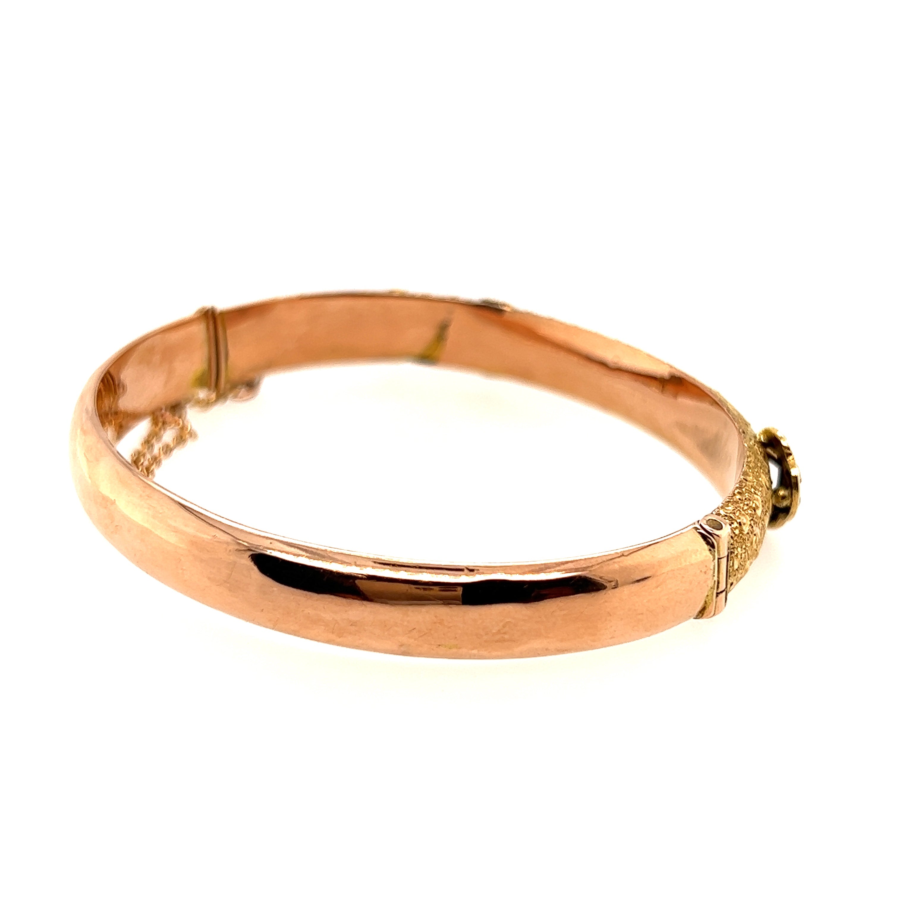 9ct yellow gold 12 stone Turquoise & Seed Pearl antique bangle. 3 round cabochon rim set 3 Seed Pearls & 1 round cabochon Turquoise grain set in buckle & 3 Seed Pearls & 2 round cabochon Turquoise grain set in bar in a floral engraved half of a 7.92mm wide 1/2 round oval hollow hinged bangle with concealed box clasp with safety chain.