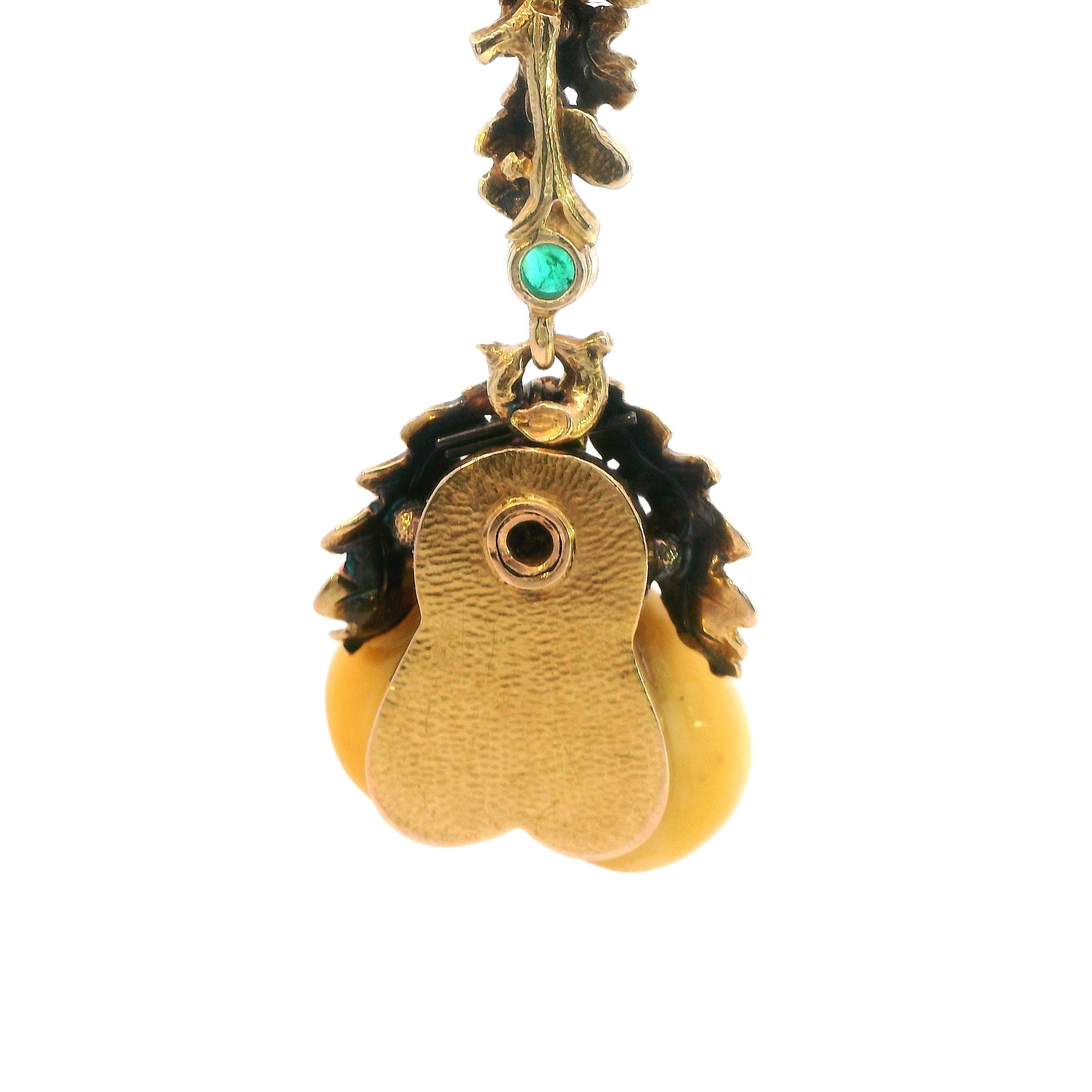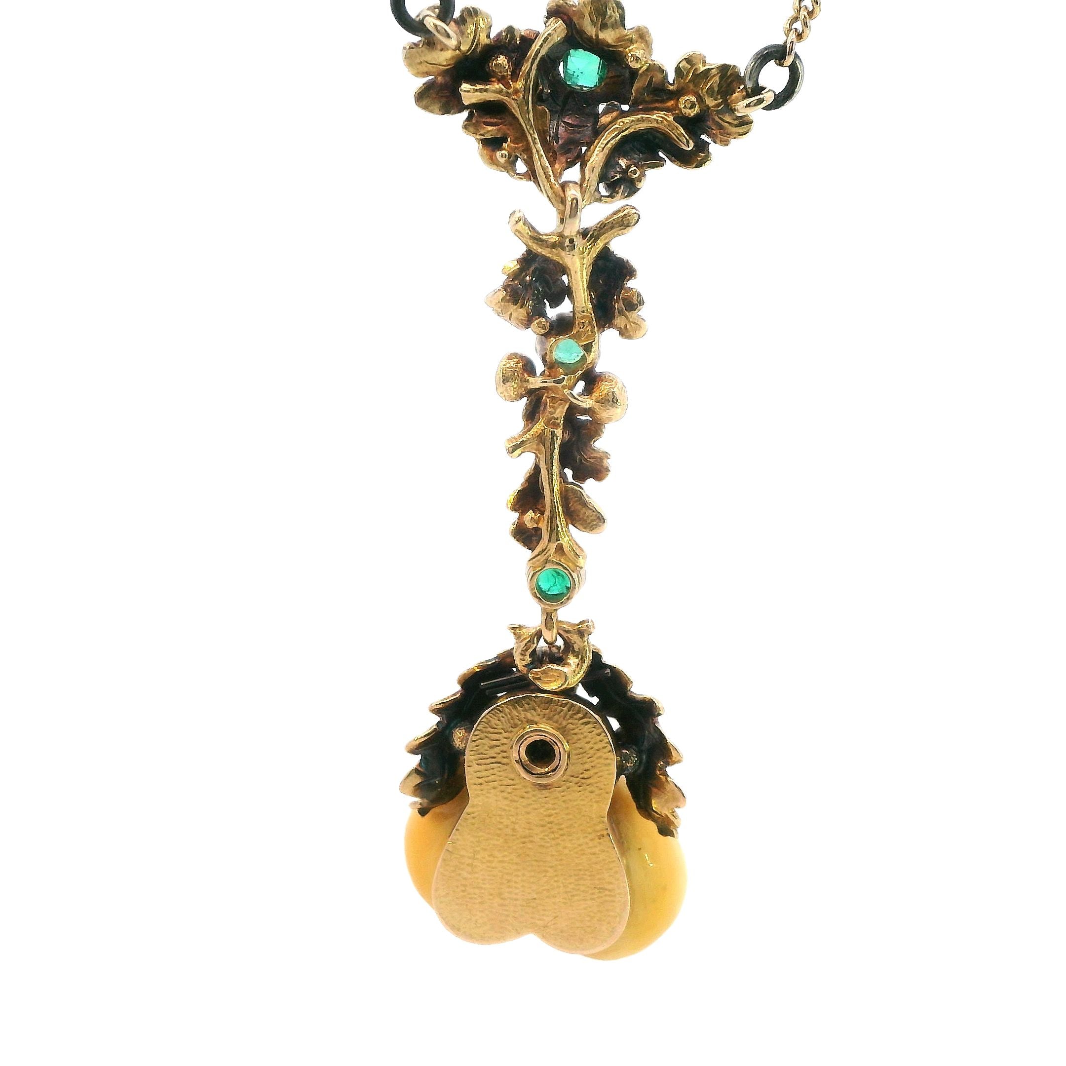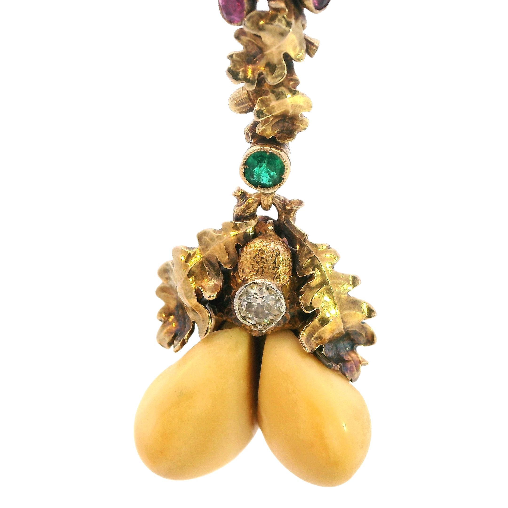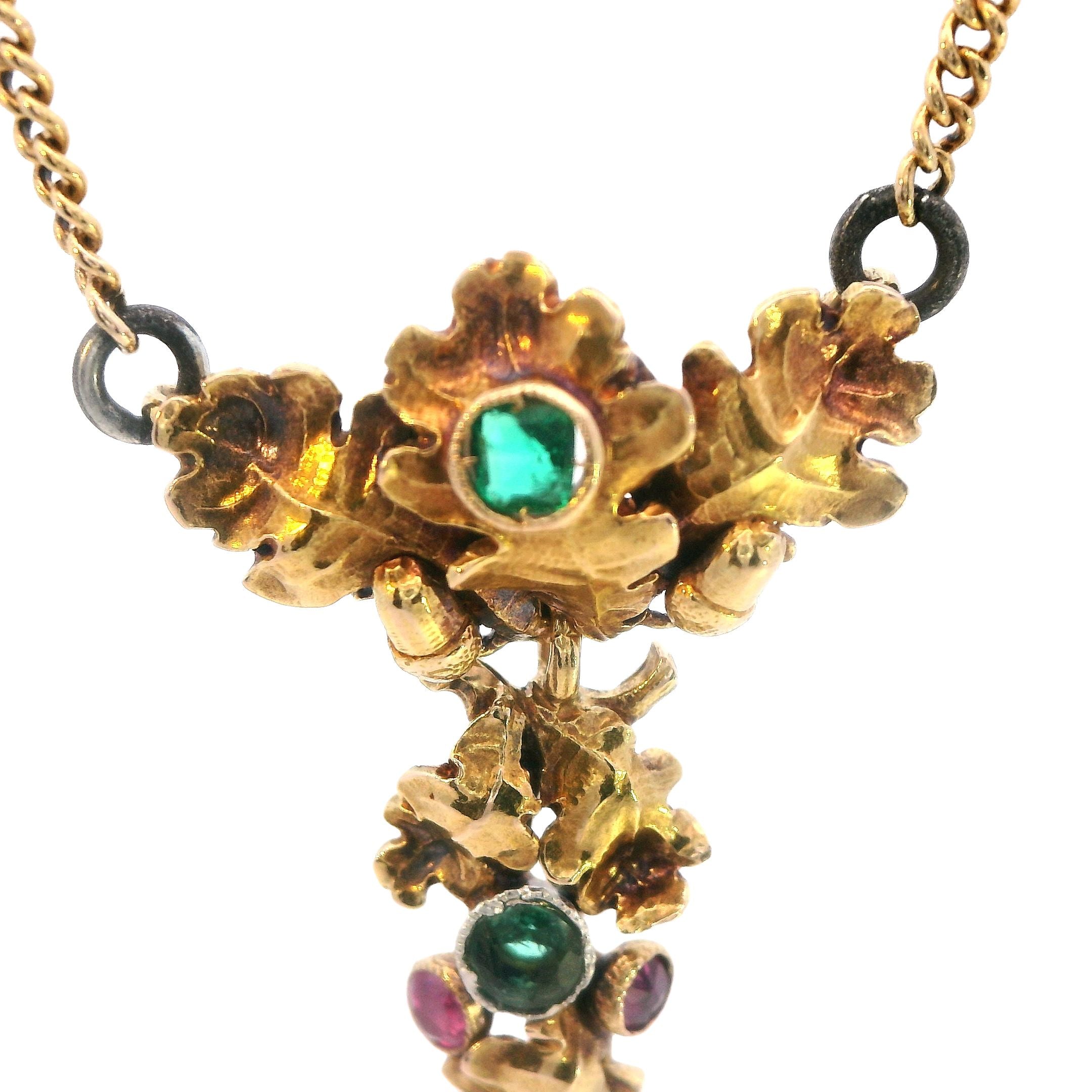This exquisite 14ct and 9ct yellow gold necklet, featuring emeralds, rubies, diamonds, and acorn seeds, is a true celebration of nature's beauty. Handcrafted with meticulous attention to detail, this piece is perfect for those who appreciate unique and meaningful jewelry. Add a touch of elegance and natural charm to your collection with this stunning necklet from The Exclusive Jewellery and Antiques Company.