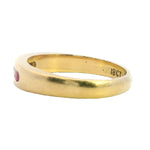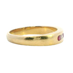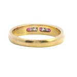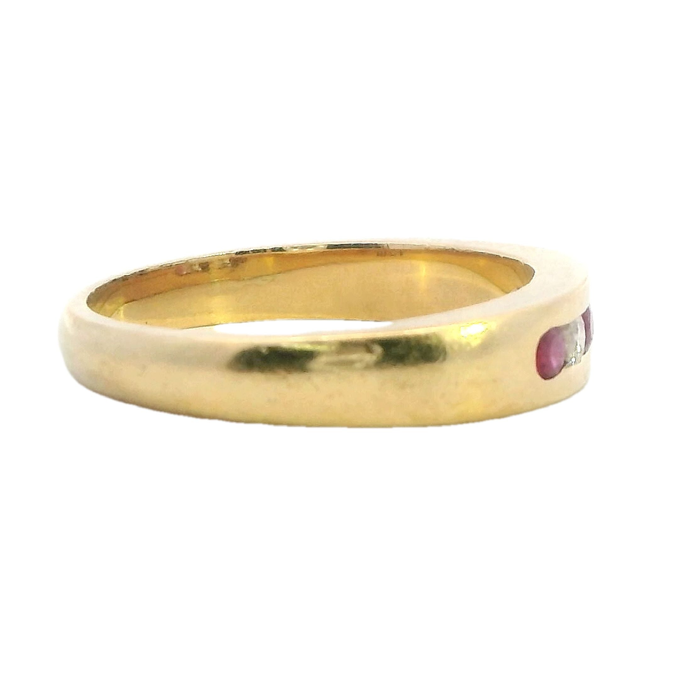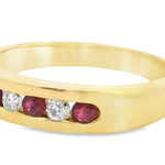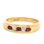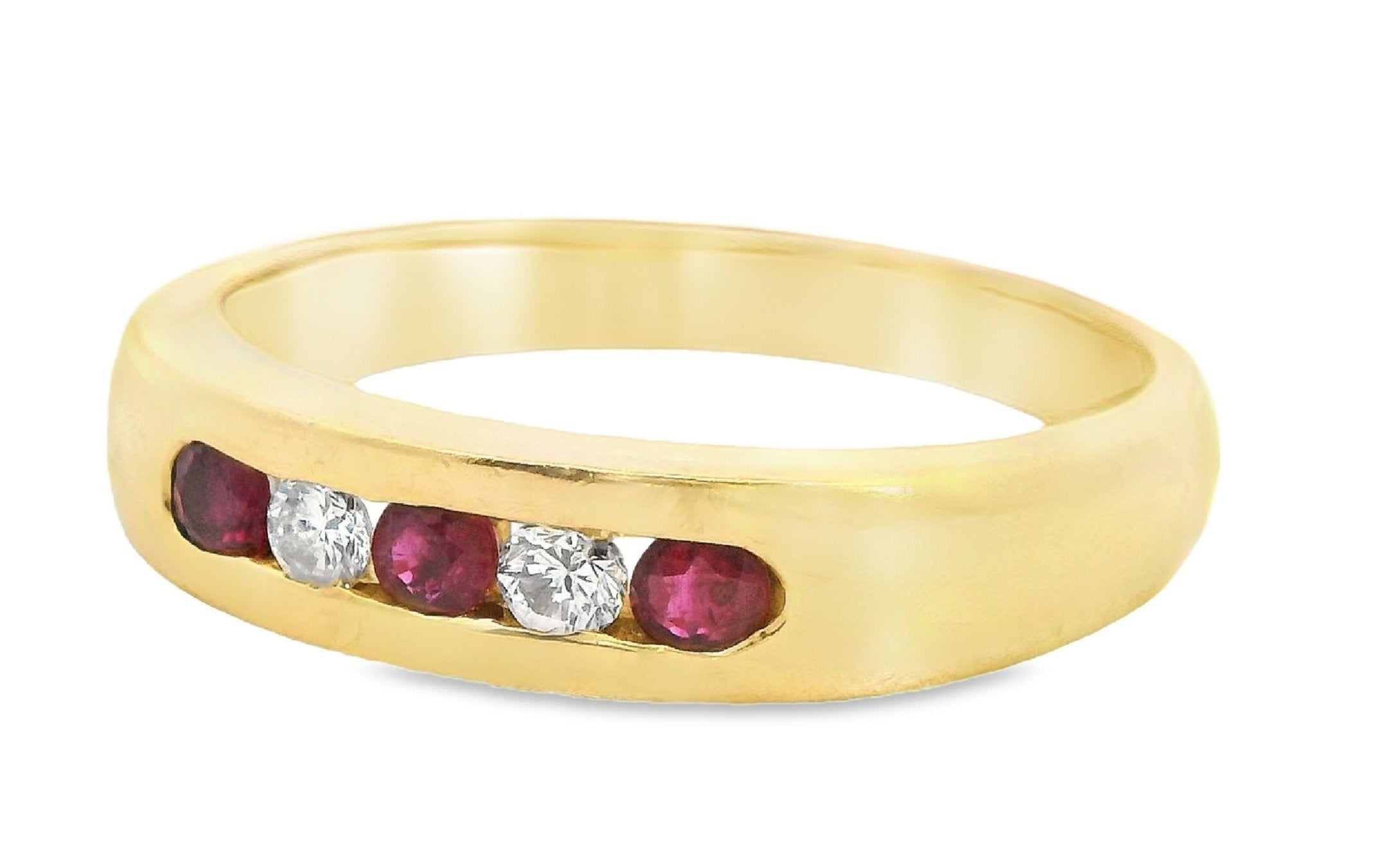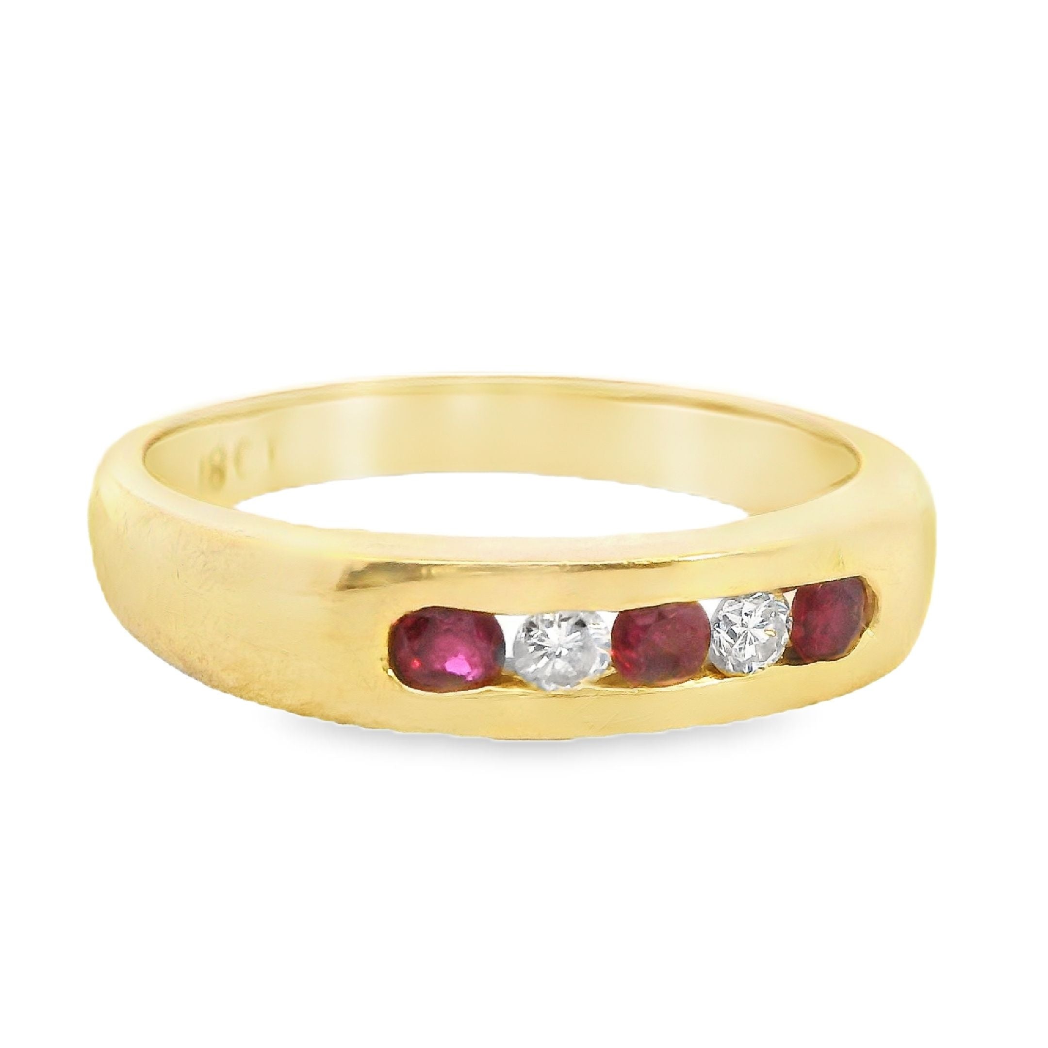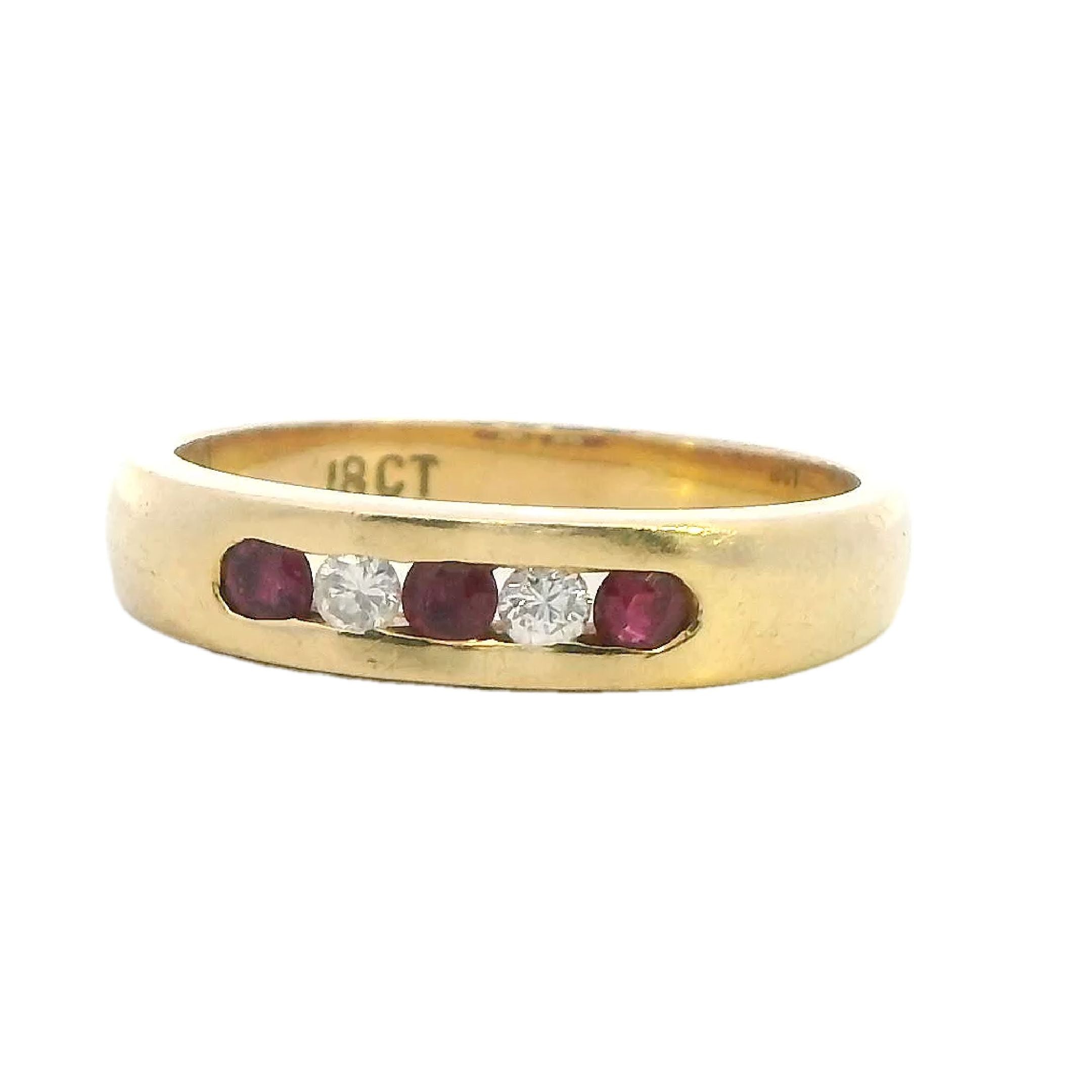 Presenting a stunning 18ct yellow gold ring featuring a beautiful arrangement of rubies and diamonds. This exquisite piece showcases three round rubies and two round brilliant cut diamonds, channel set alternately in a 1.2 round 3.91 - 2.6mm band. The vibrant rubies, with their moderately bright mid to dark slightly purplish red hue, perfectly complement the sparkling diamonds, creating a timeless design that exudes elegance.