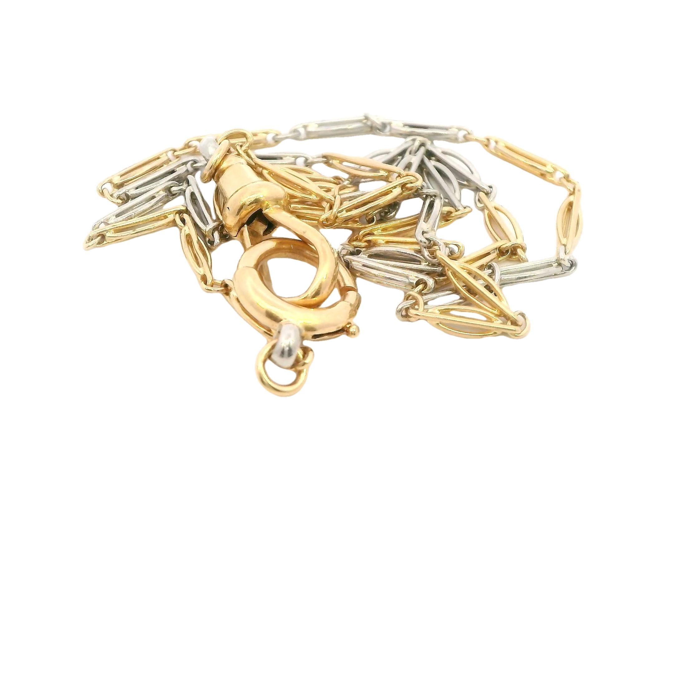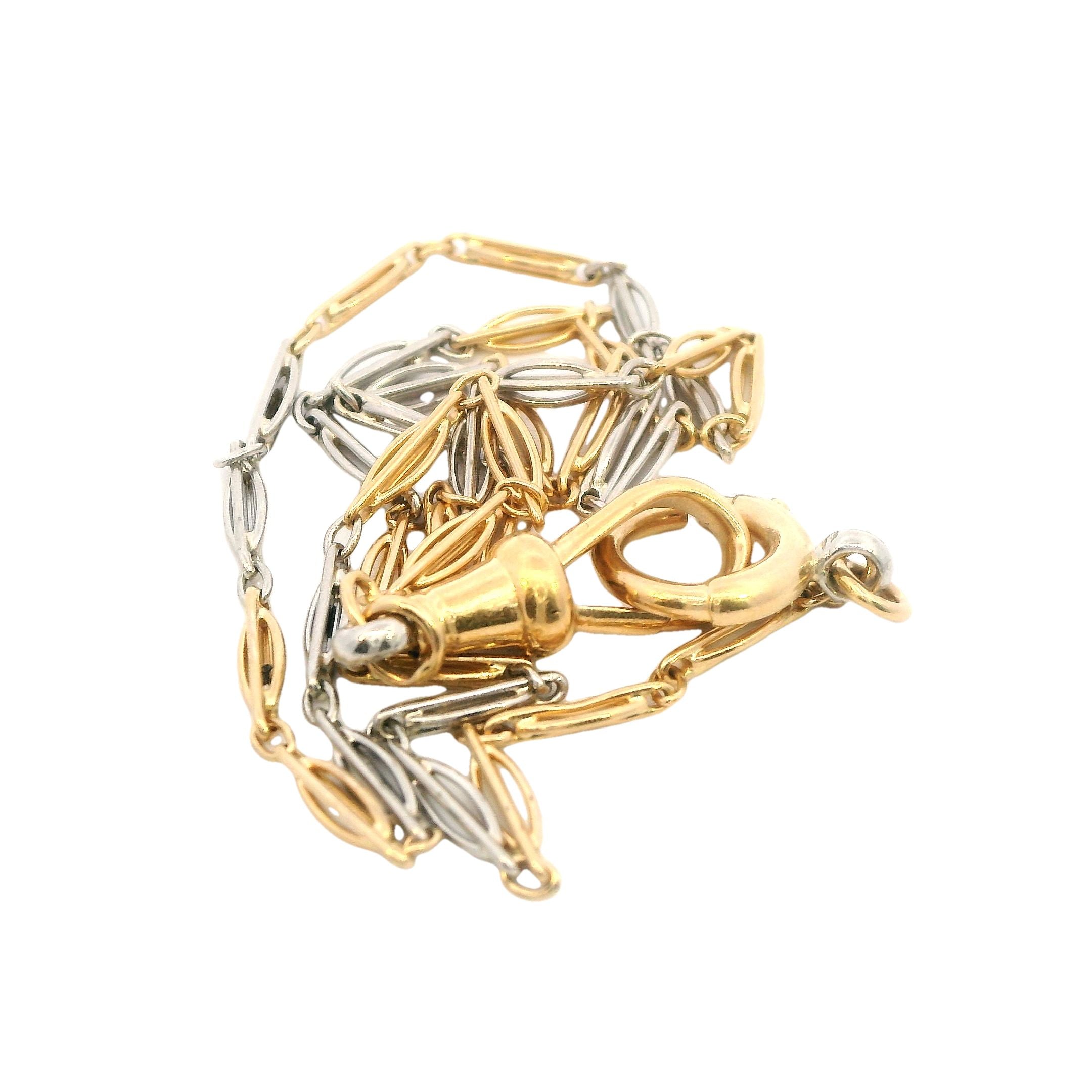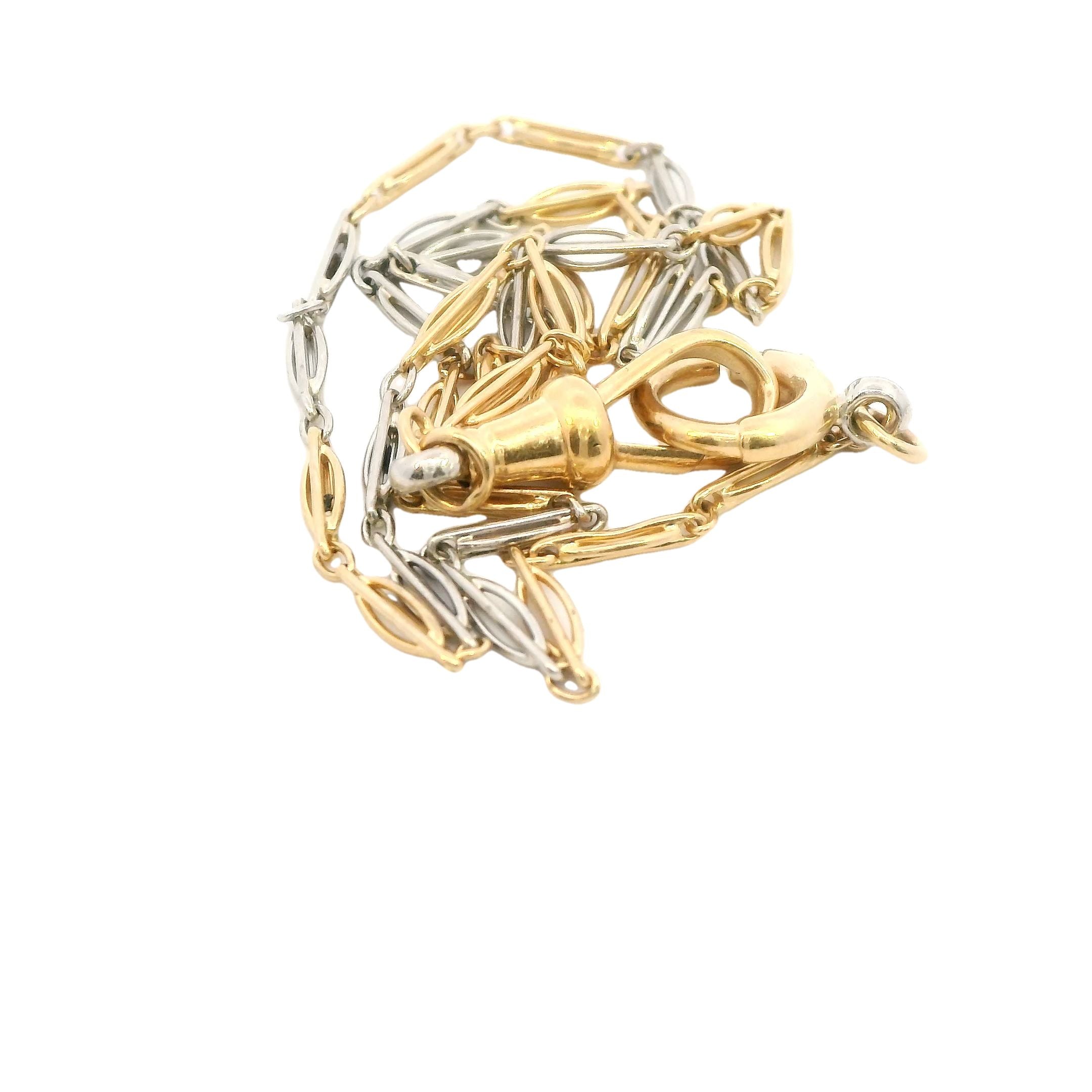 On offer is this exquisite antique gold chain, crafted from alternating yellow and white gold sections, showcasing both elegance and craftsmanship. Measuring 35cm in length, the chain features a striking white gold Albert swivel clasp, adding both style and function to this luxurious piece. The combination of 18ct yellow and white gold ensures this chain not only makes a statement but also holds its value over time, making it a beautiful addition to any fine jewelry collection.