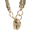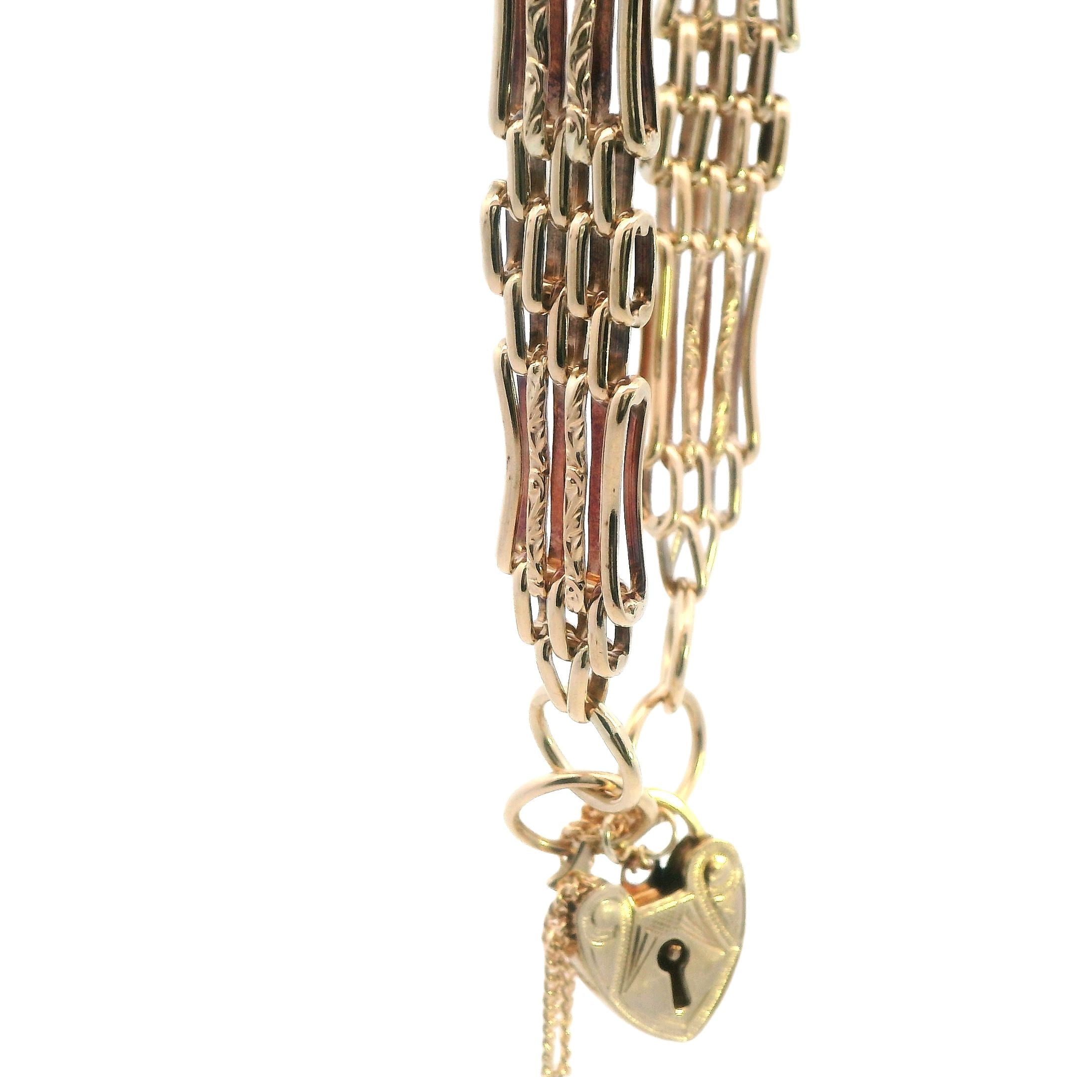 This stunning four-bar gate bracelet is a true testament to craftsmanship, cast and hand-assembled in radiant 9ct yellow gold. The bracelet features a beautifully engraved heart-shaped padlock clasp and a secure safety chain, adding both elegance and security.