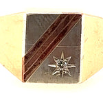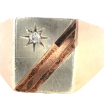 This sophisticated 9ct gold ring is a stunning blend of yellow, white, and rose gold, designed with a unique and eye-catching style. The ring features an 11.5 x 9mm white gold flat rectangular top with a diamond-cut inlay, accented by diamond-cut rose gold. At the center, a round brilliant cut diamond is star grain set, adding a touch of sparkle. The ring is finished with tapered yellow gold shoulders and a flat 3.17mm band, creating a piece that is both elegant and masculine.