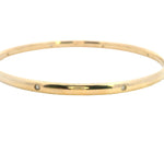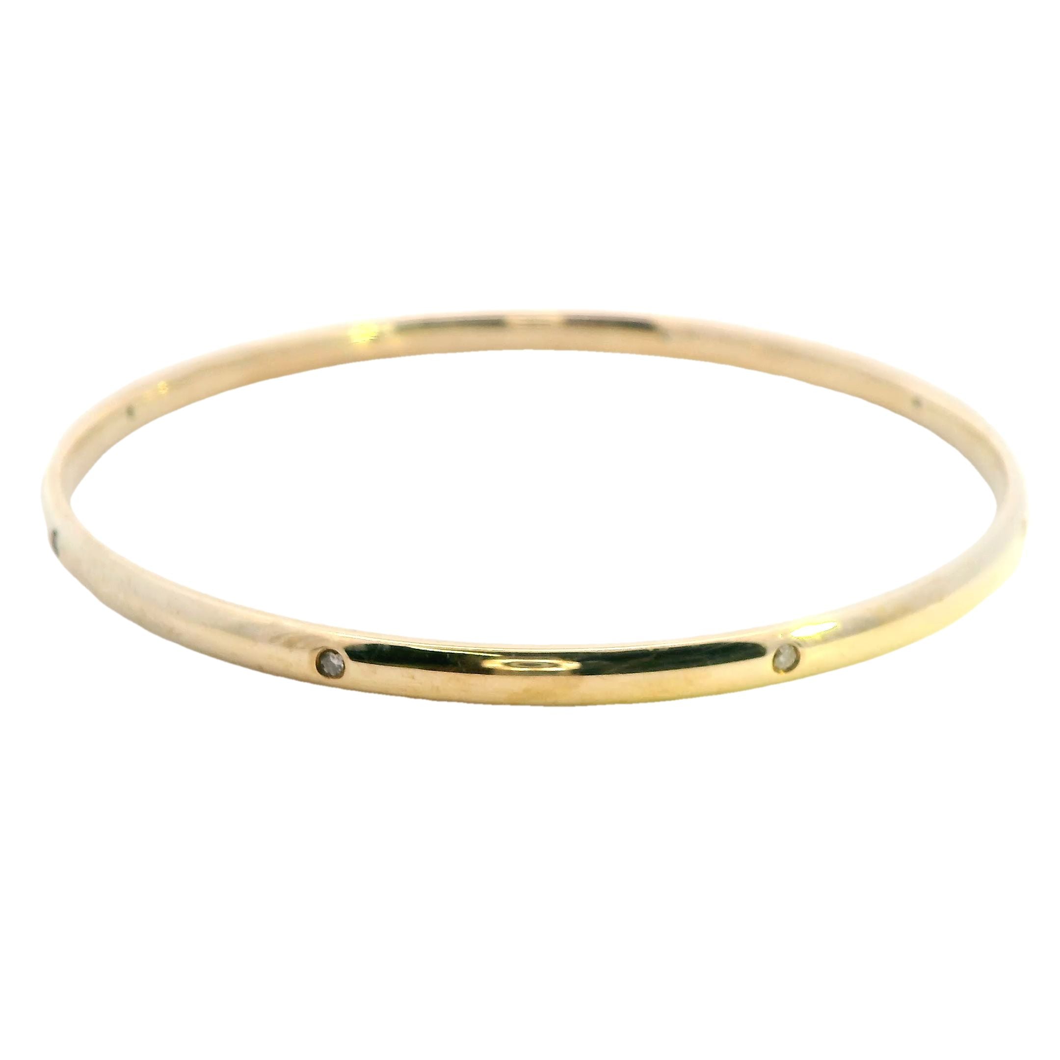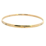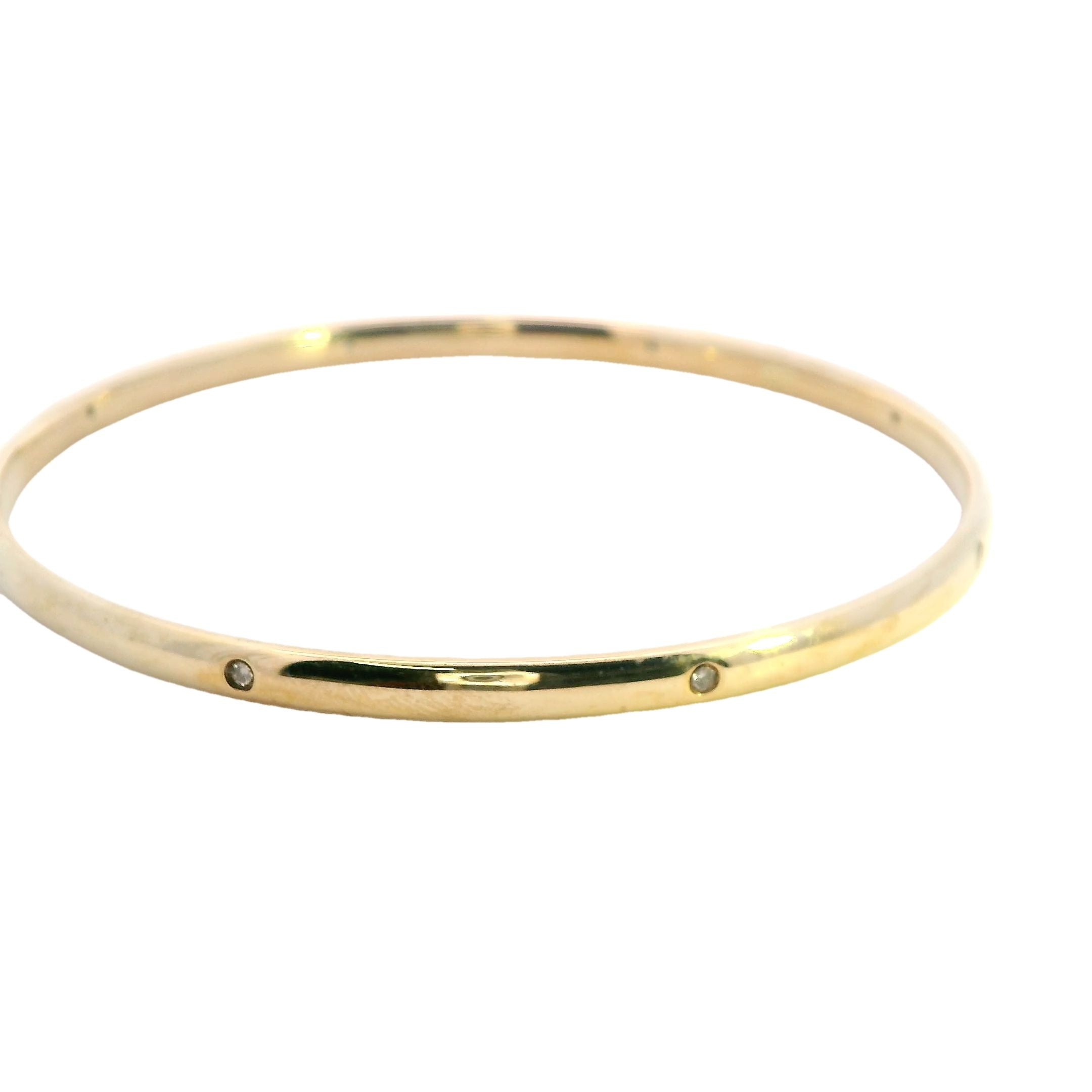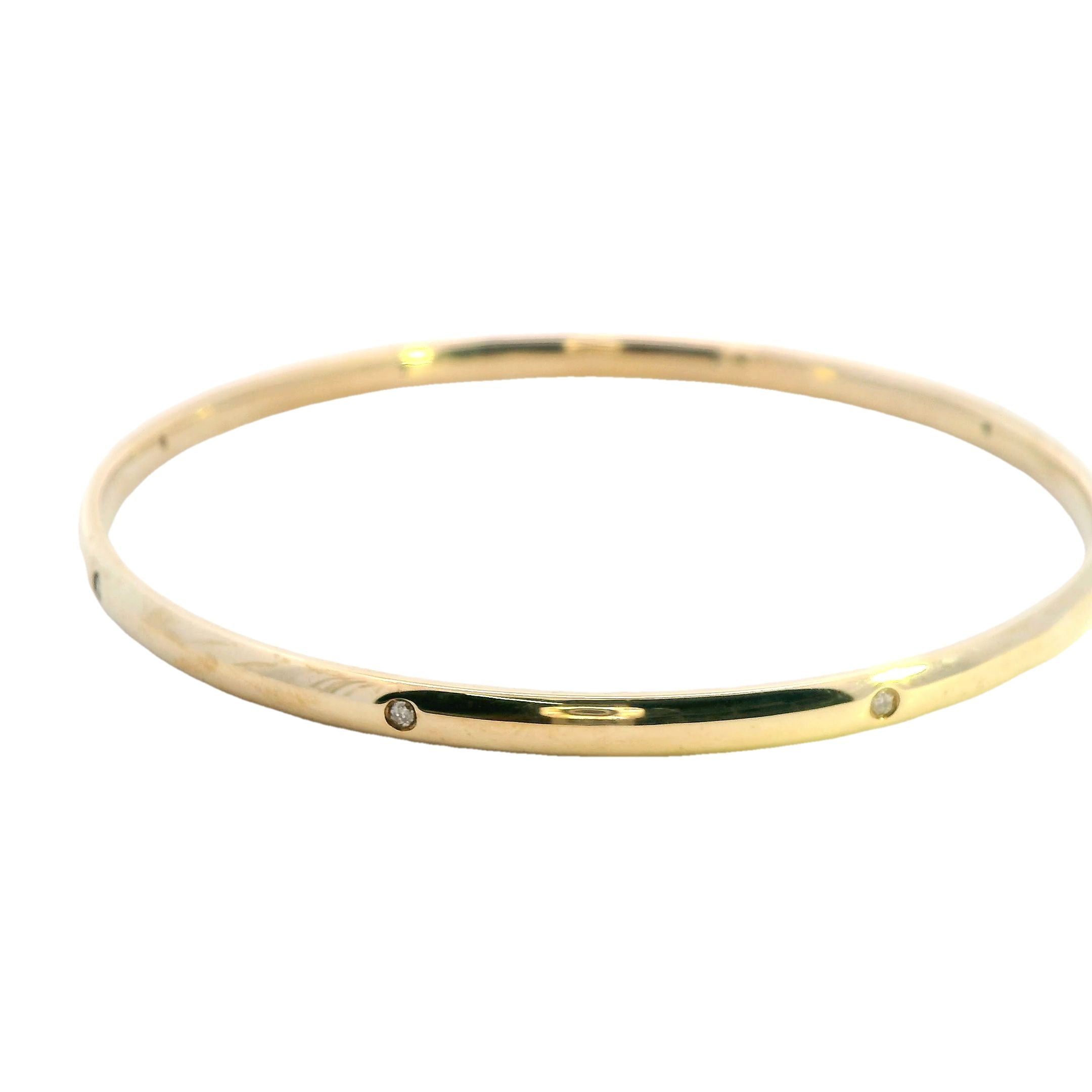 This stunning 9ct yellow gold bangle, adorned with sparkling diamonds, is an elegant investment piece that combines timeless beauty with intrinsic value. Designed with a 2.1mm thick comfort profile, this bangle features a sleek, polished finish and is hammer-set with eight brilliant-cut diamonds, each with a beautiful "H" color and "SI" clarity, adding a refined sparkle to the classic design.