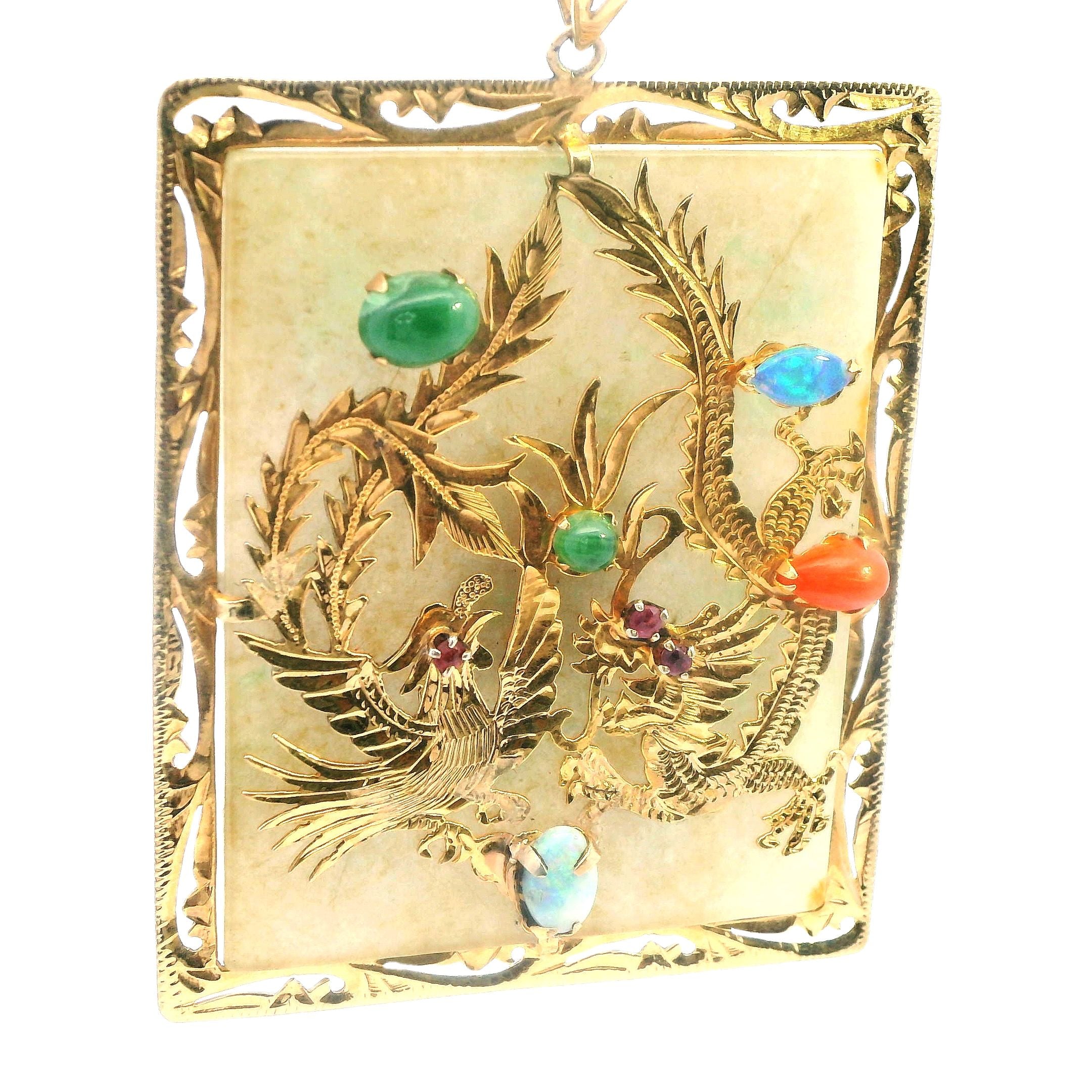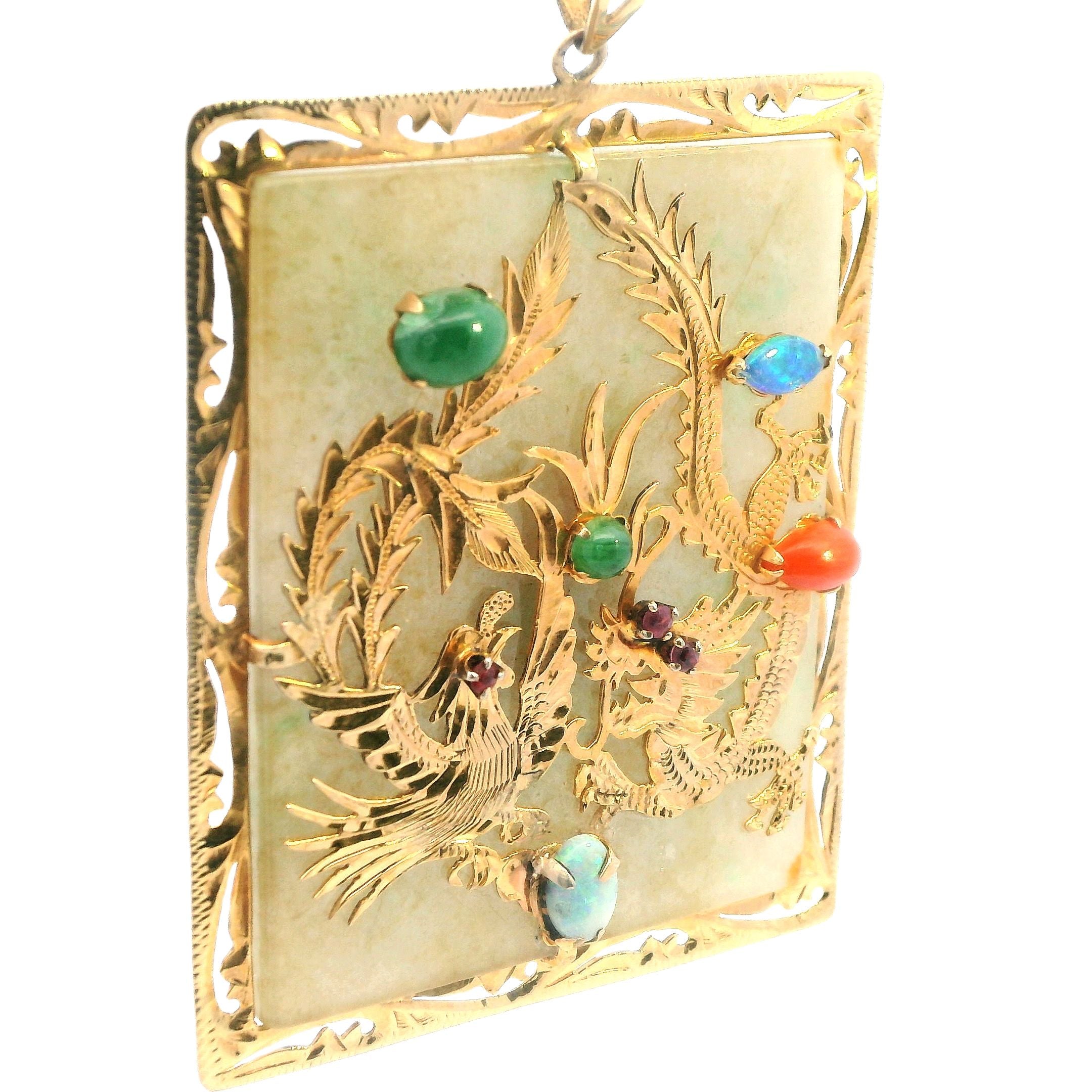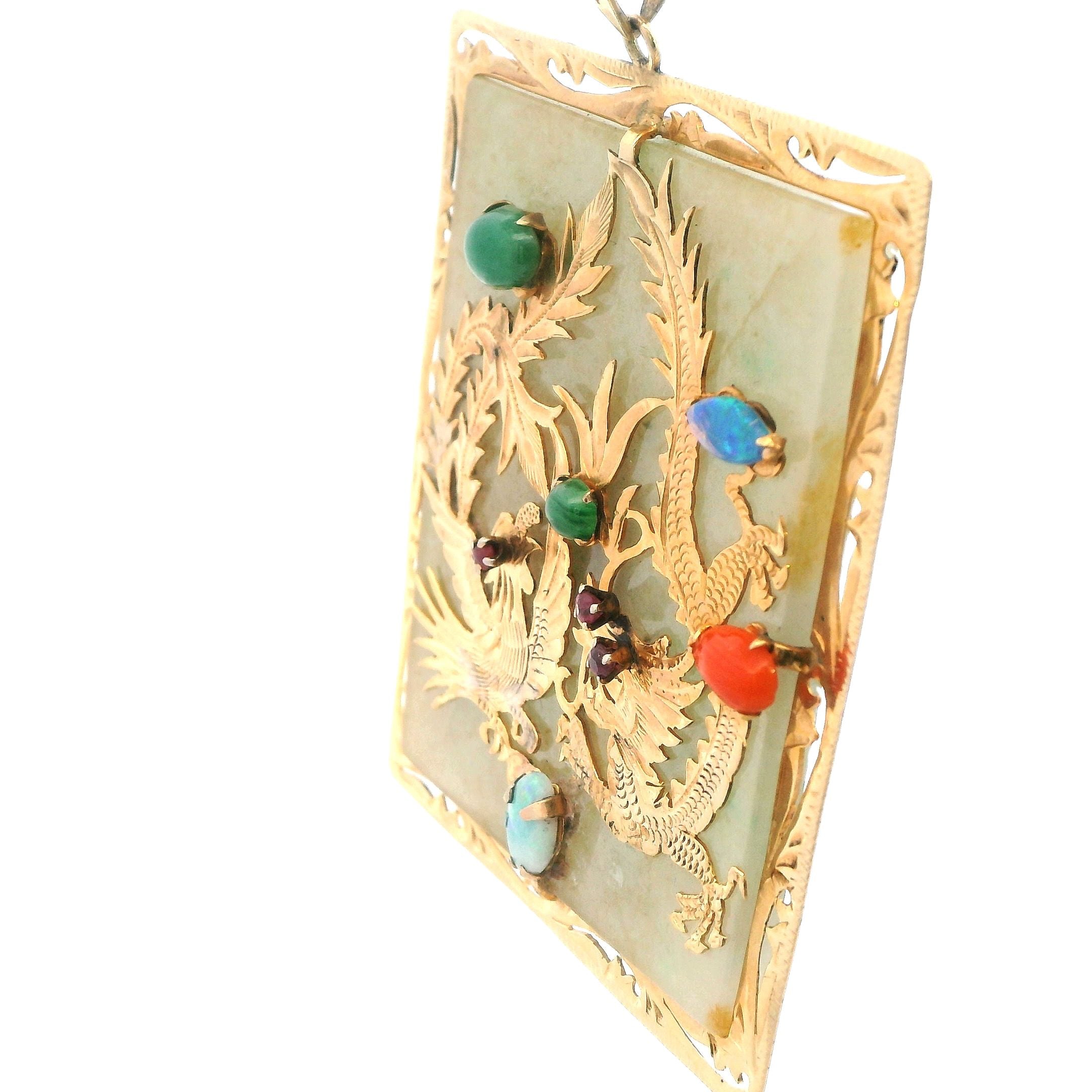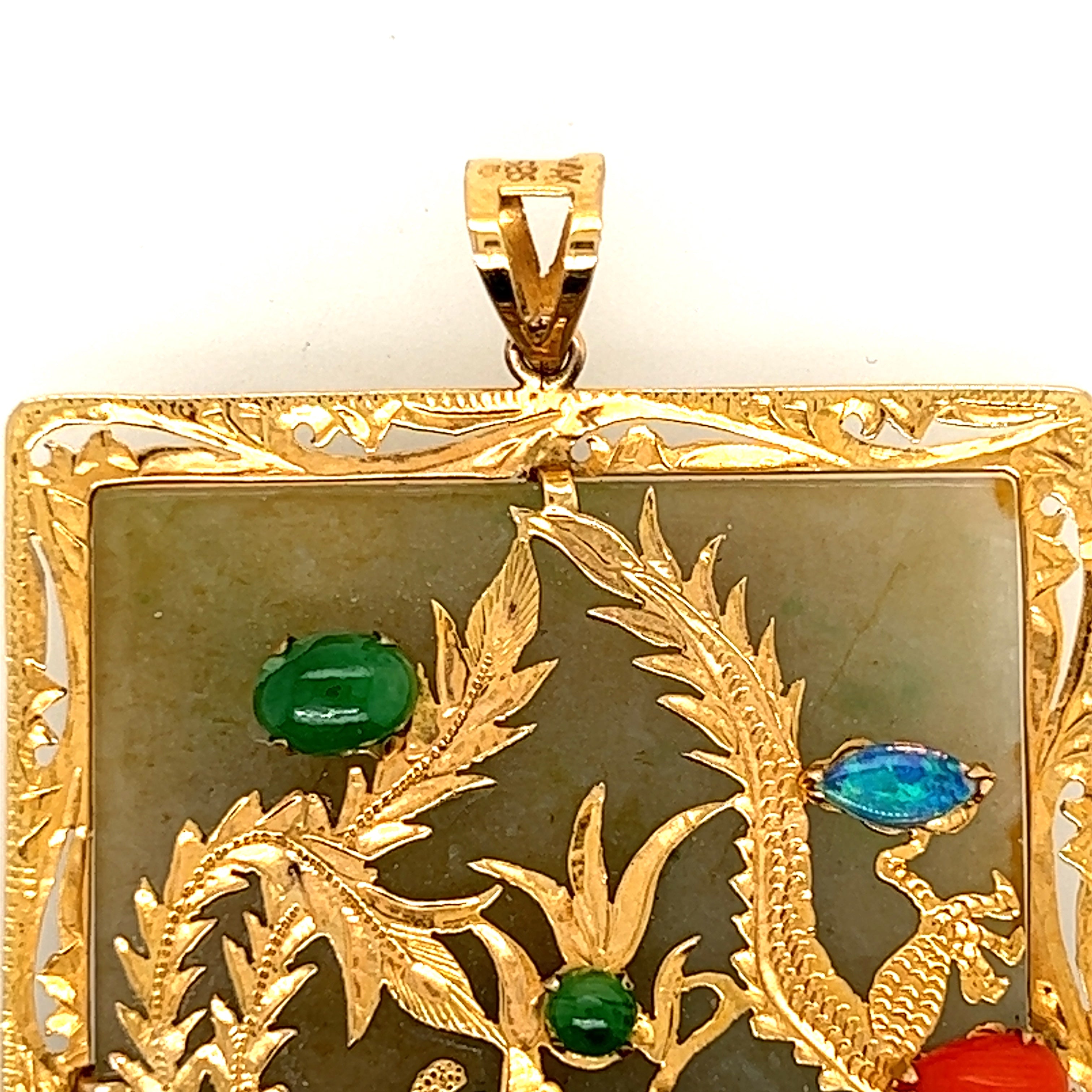 14ct Yellow Gold Jade, Opal, Red Coral, Ruby & Amethyst Handmade Pendant with two Engraved Dragons