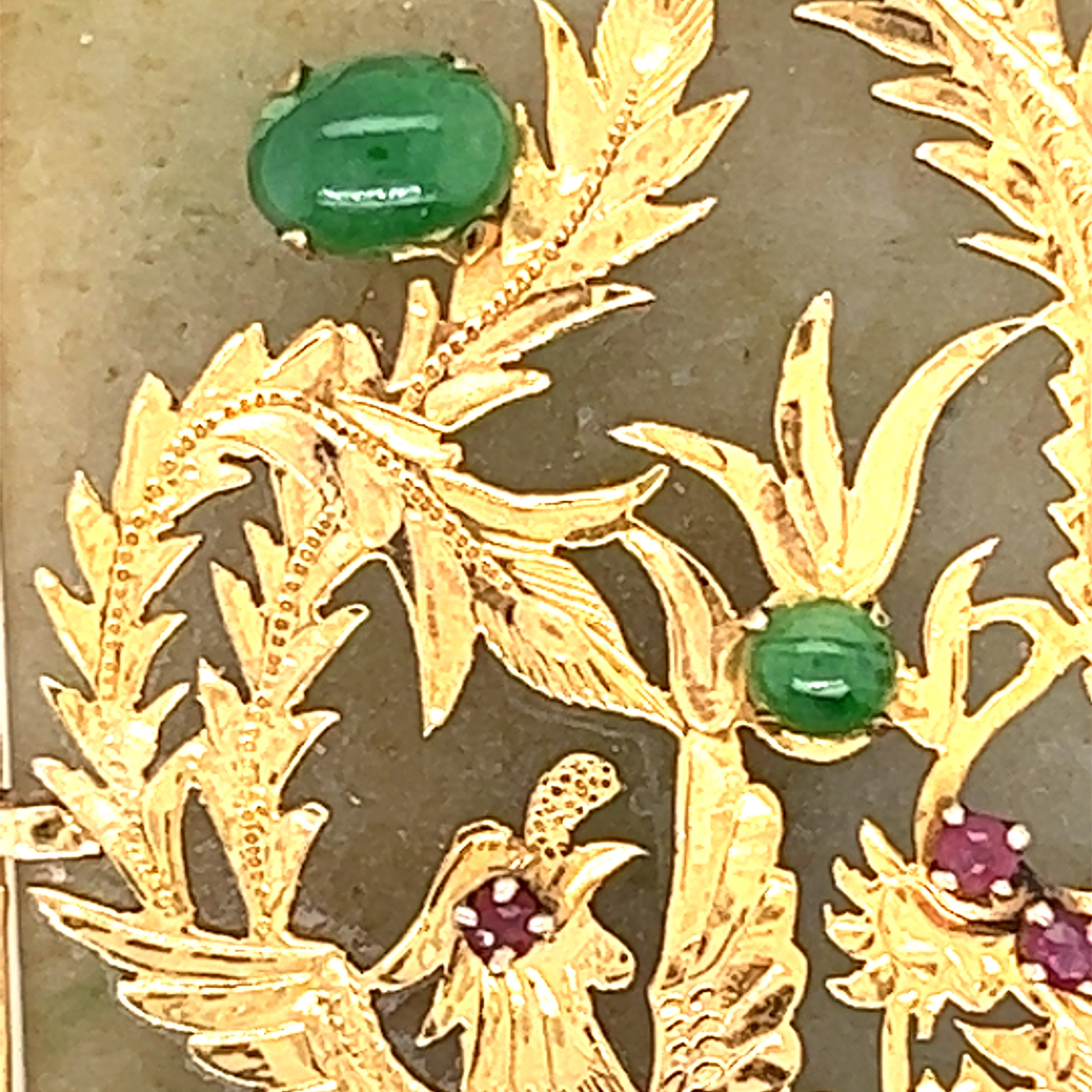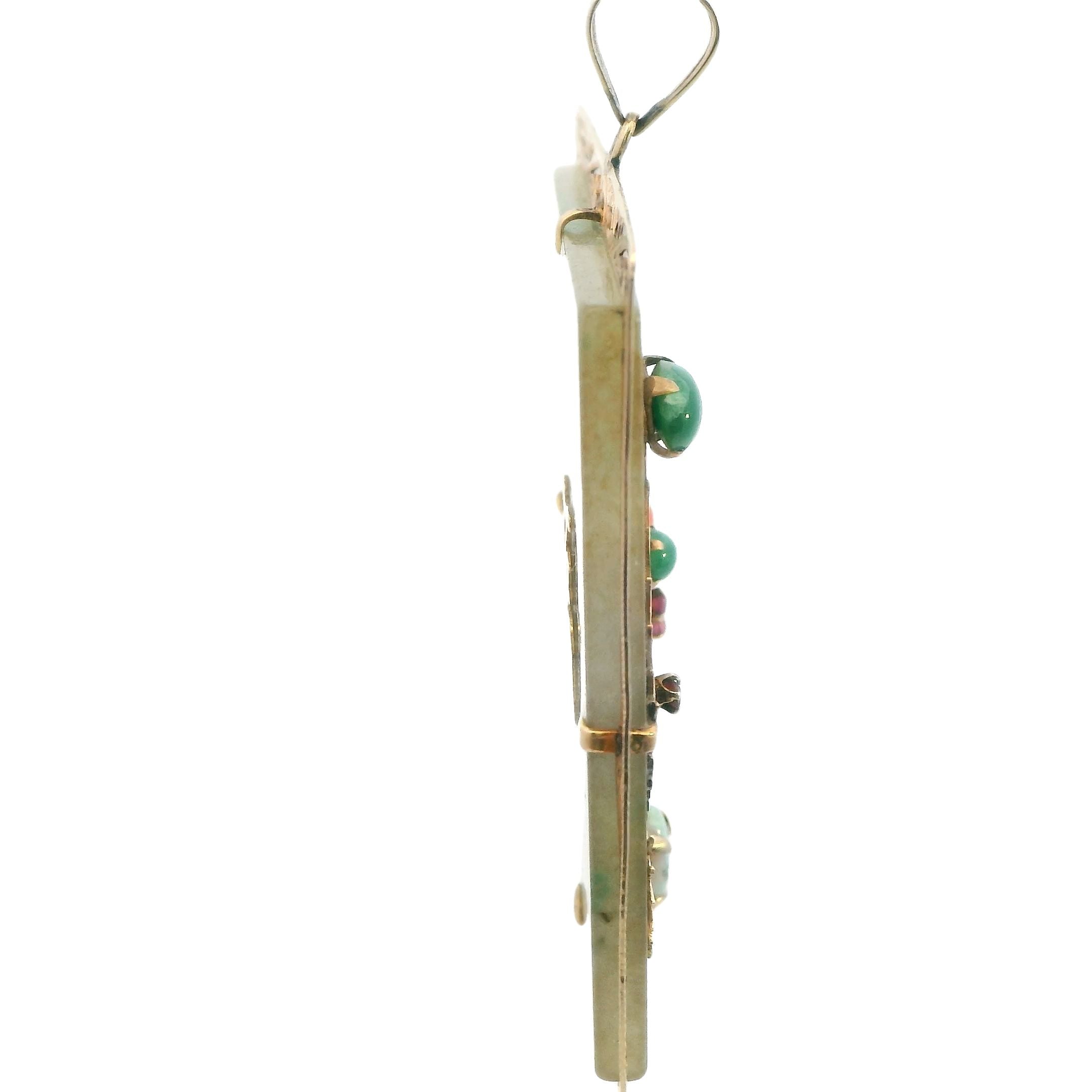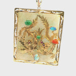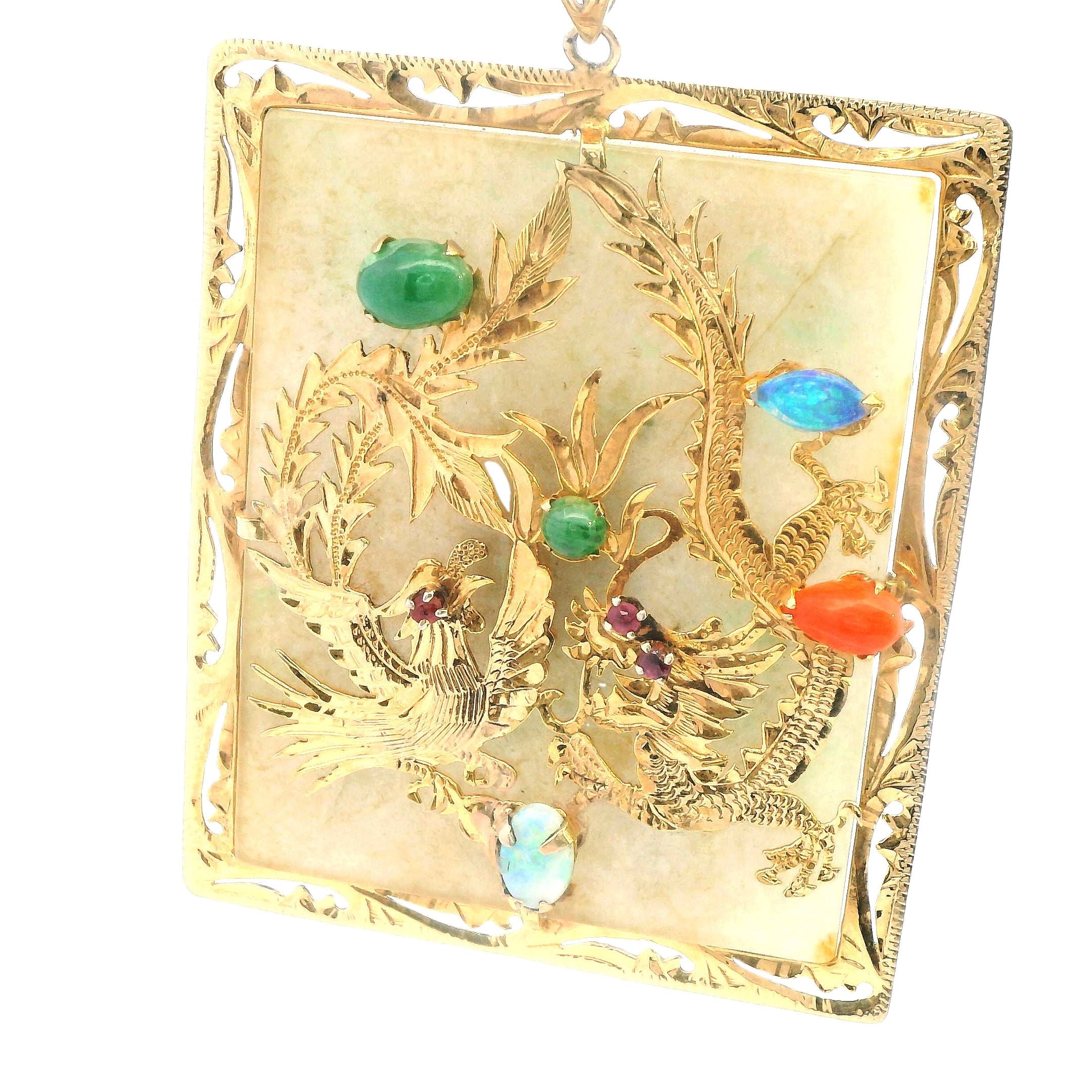 14ct Yellow Gold Jade, Opal, Red Coral, Ruby & Amethyst Handmade Pendant with two Engraved Dragons