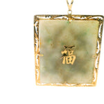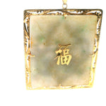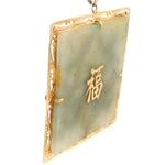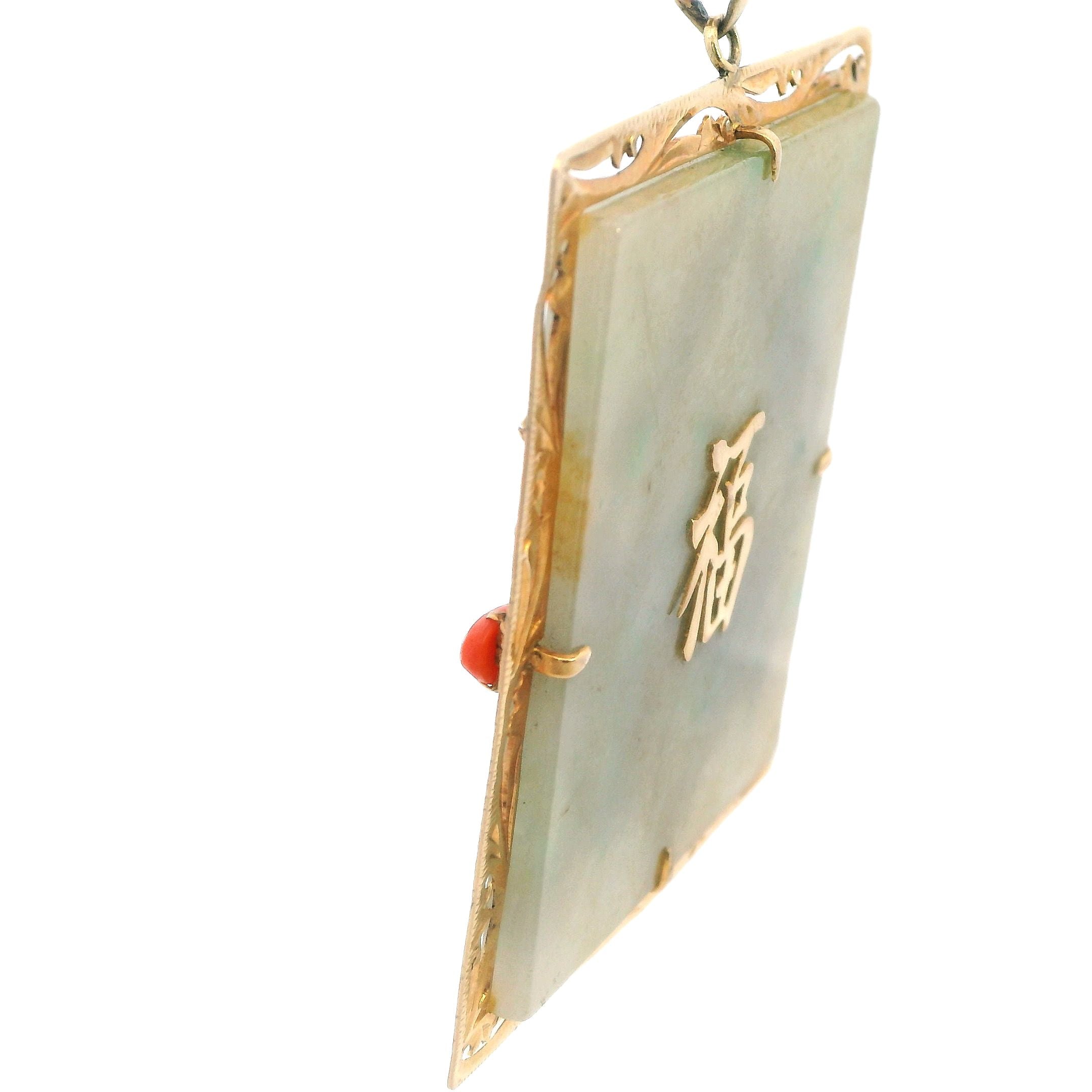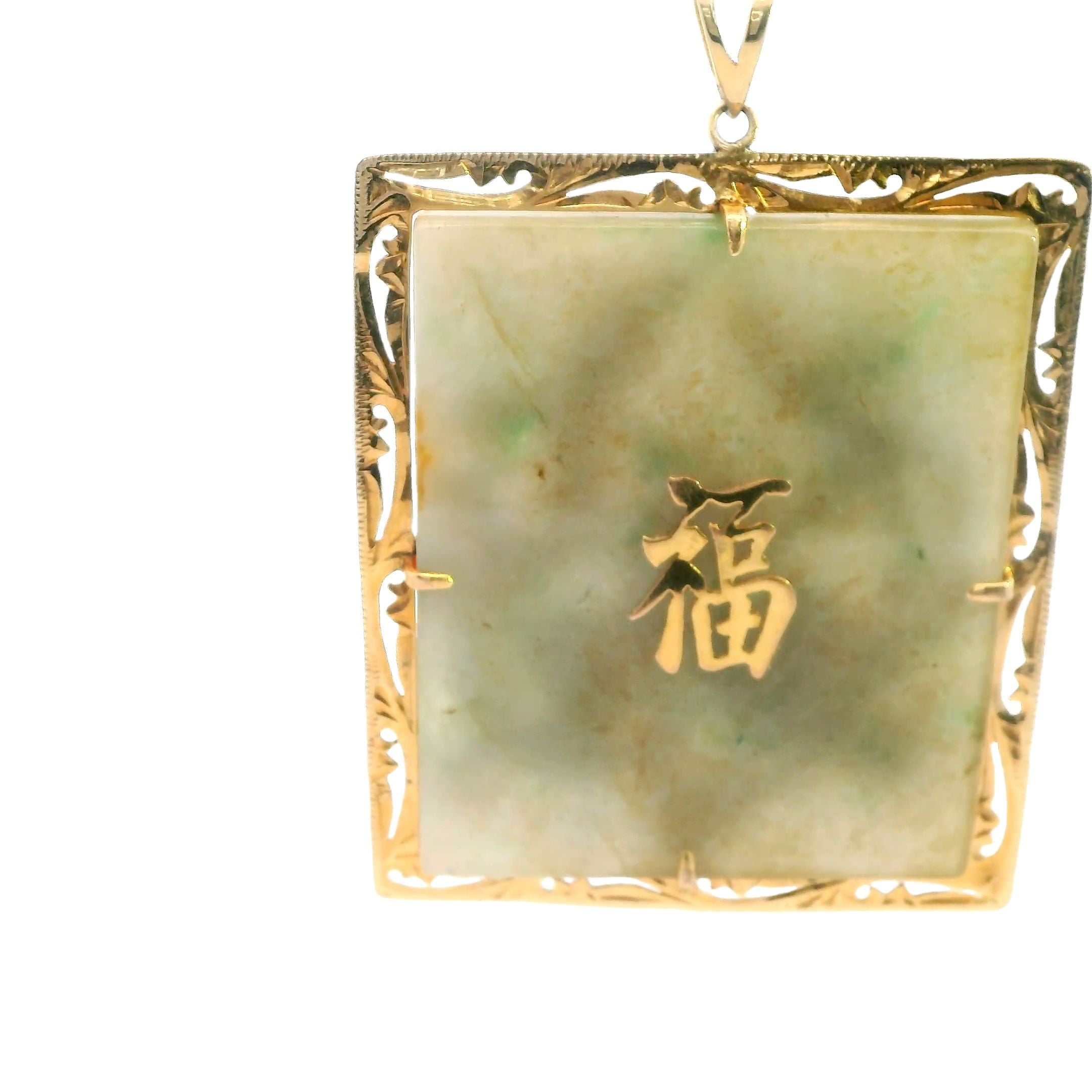 This one-of-a-kind handmade pendant is crafted from 14ct yellow gold, featuring a beautifully engraved gold border that holds a striking 42.4mm x 34.9mm flat jadeite plate. The jade is intricately engraved with two dragons, symbolizing power and strength. The pendant is set with a 5.8mm x 4.4mm oval opal cabochon, a marquise opal, two 1.5mm round cut amethysts, and a 1.5mm round cut ruby. The detailed craftsmanship and combination of vibrant gemstones make this pendant an extraordinary piece for any collection.