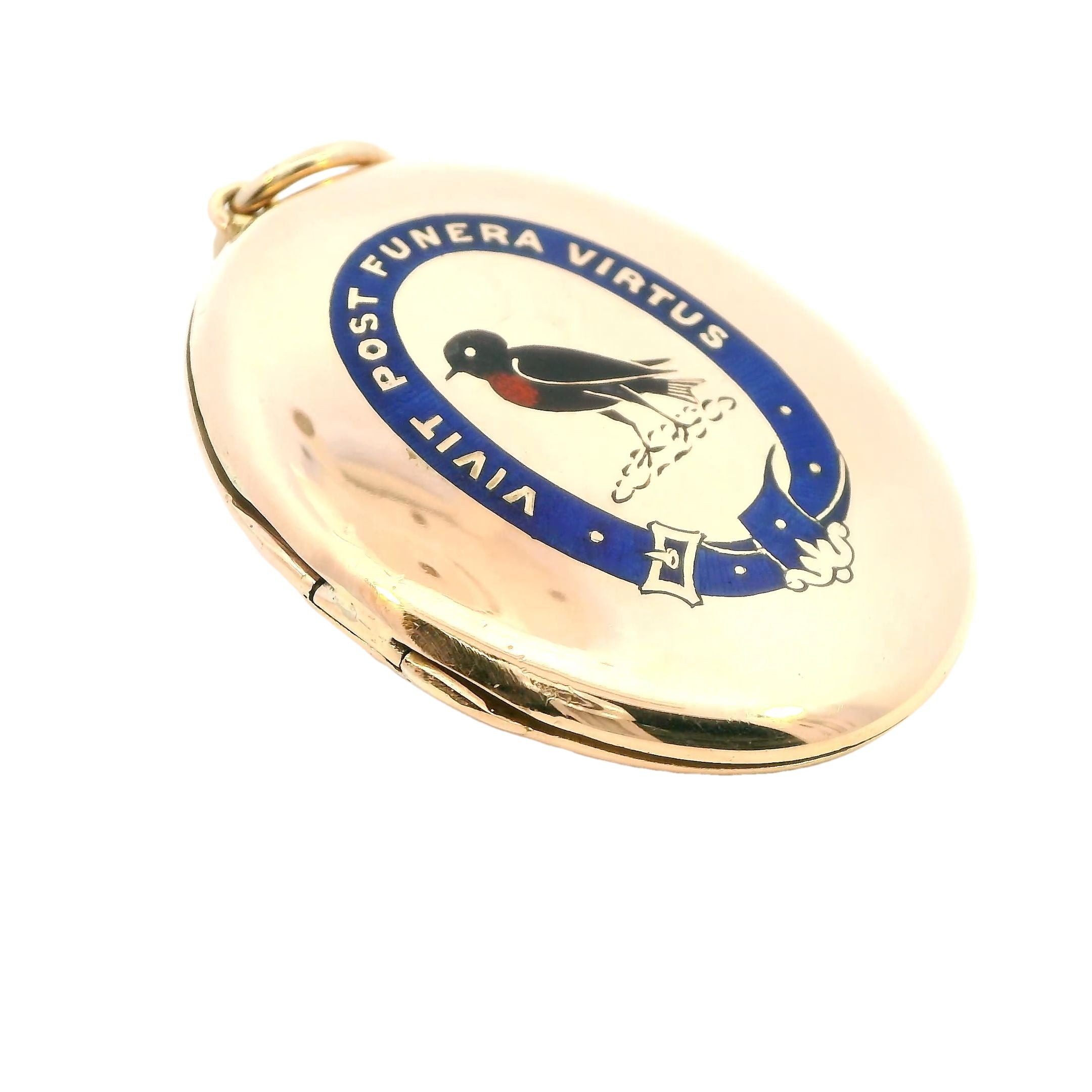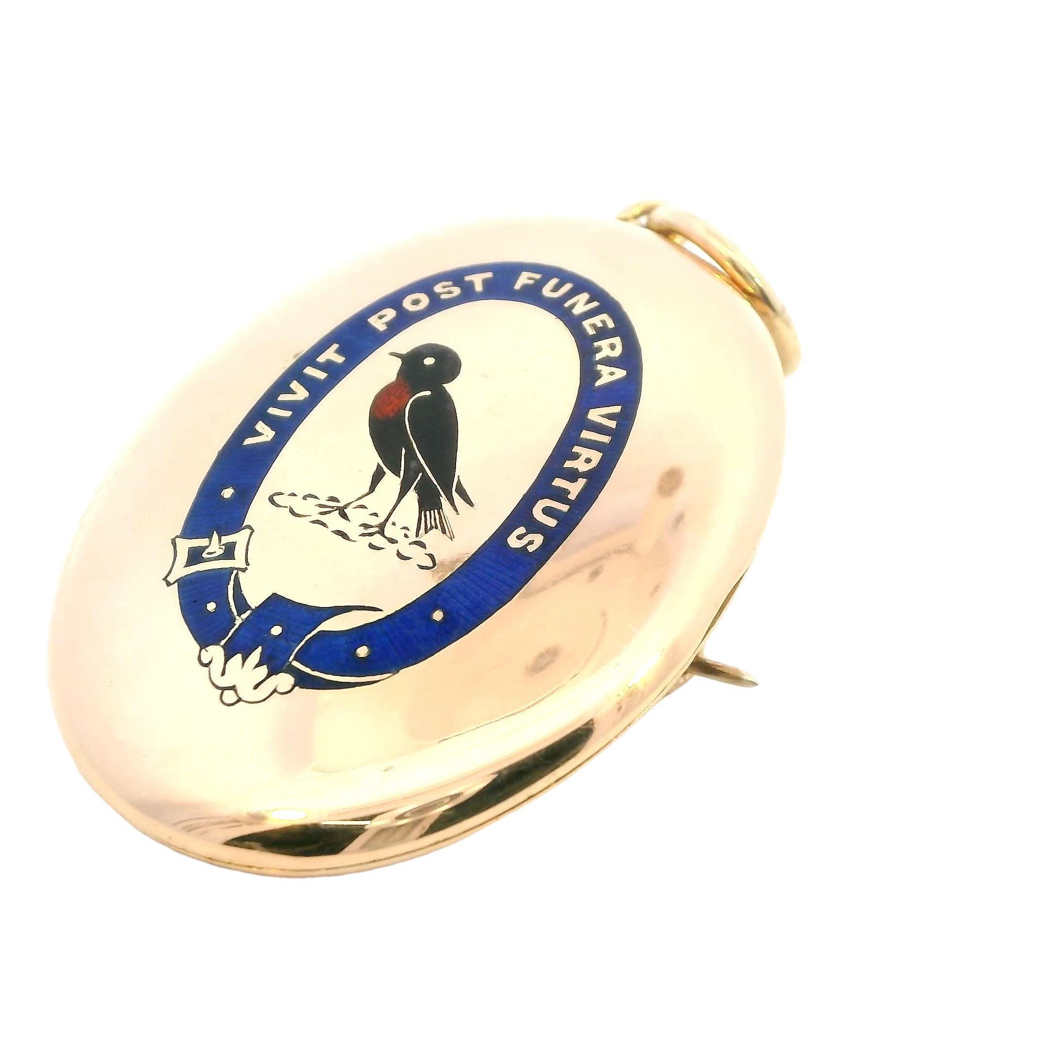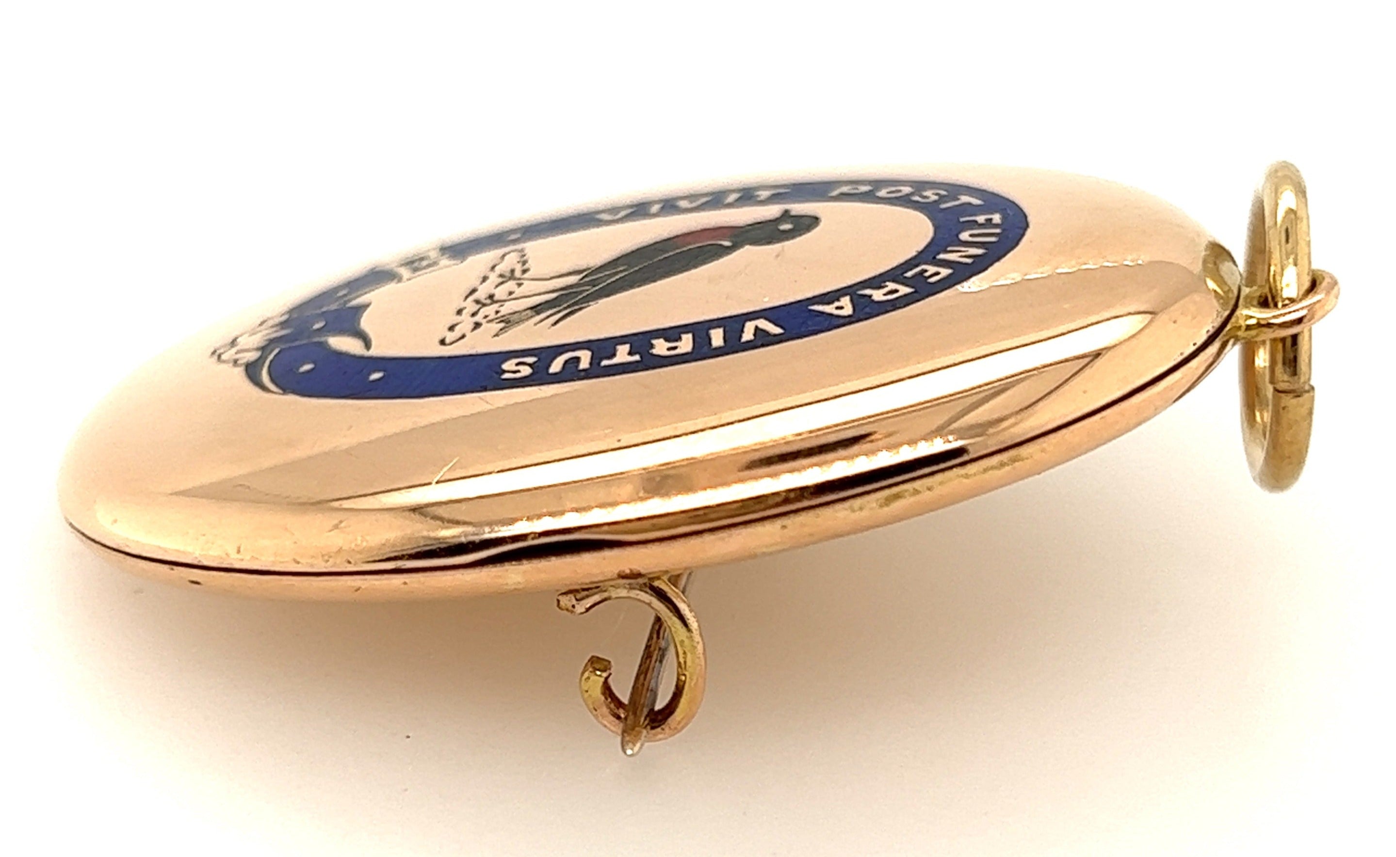 This stunning 18ct yellow gold locket features an exquisite enamelled design on the front, making it a true collector's piece. Measuring 49.2mm x 36.4mm, the locket is inscribed with the Latin motto "Vivit post funera virtus," which translates to "Virtue survives death" or "Virtue outlives death." This elegant message adds a meaningful touch to this beautiful pre-loved piece. The locket can be worn as a brooch or pendant, offering versatility and timeless elegance.