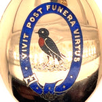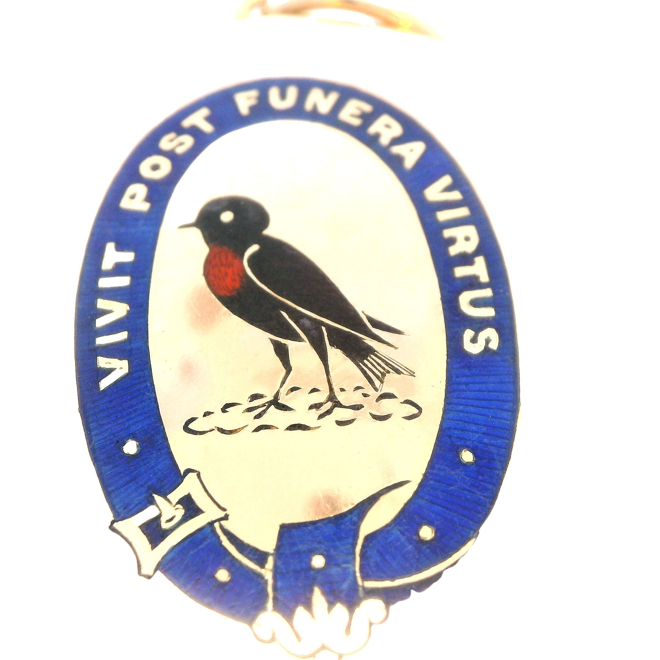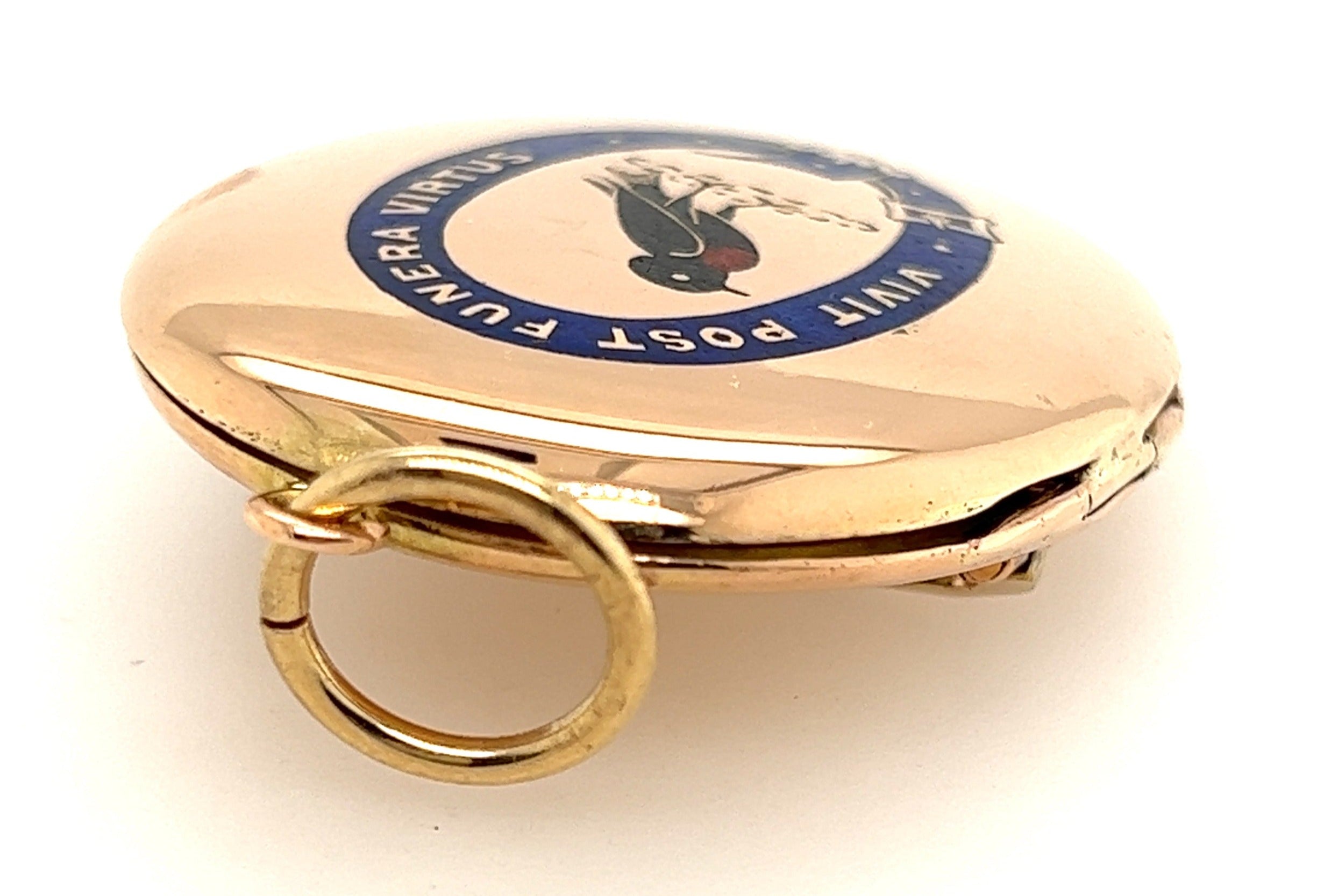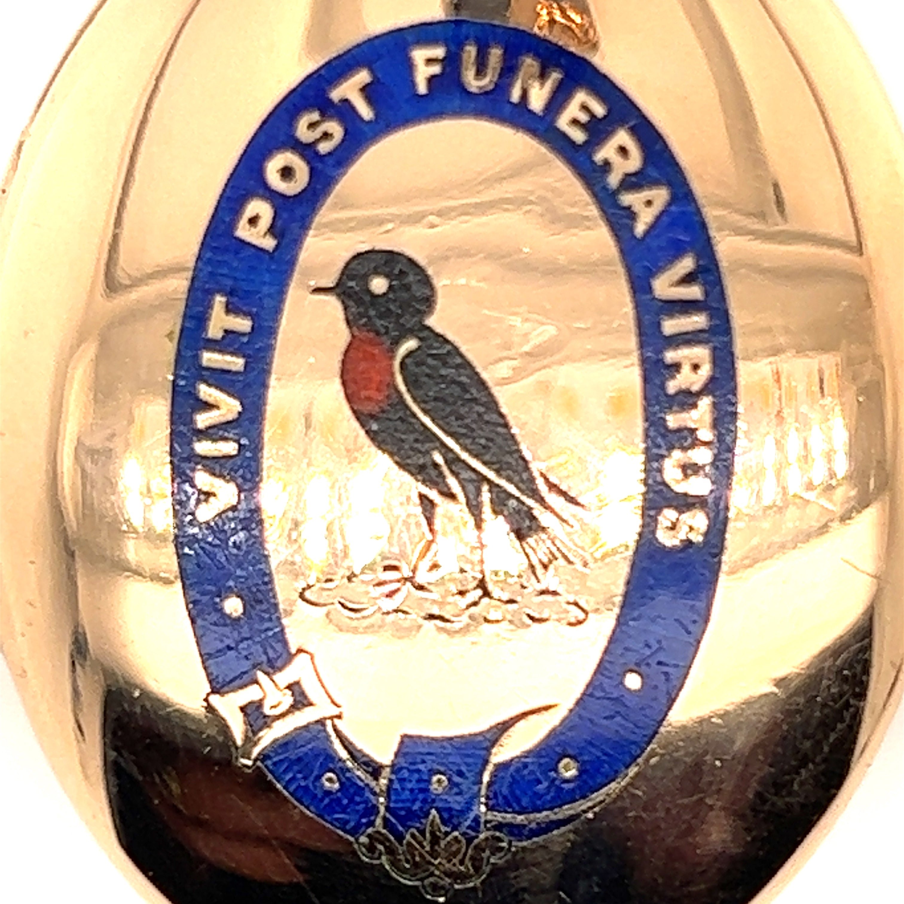This stunning 18ct yellow gold locket features an exquisite enamelled design on the front, making it a true collector's piece. Measuring 49.2mm x 36.4mm, the locket is inscribed with the Latin motto "Vivit post funera virtus," which translates to "Virtue survives death" or "Virtue outlives death." This elegant message adds a meaningful touch to this beautiful pre-loved piece. The locket can be worn as a brooch or pendant, offering versatility and timeless elegance.