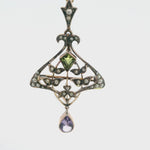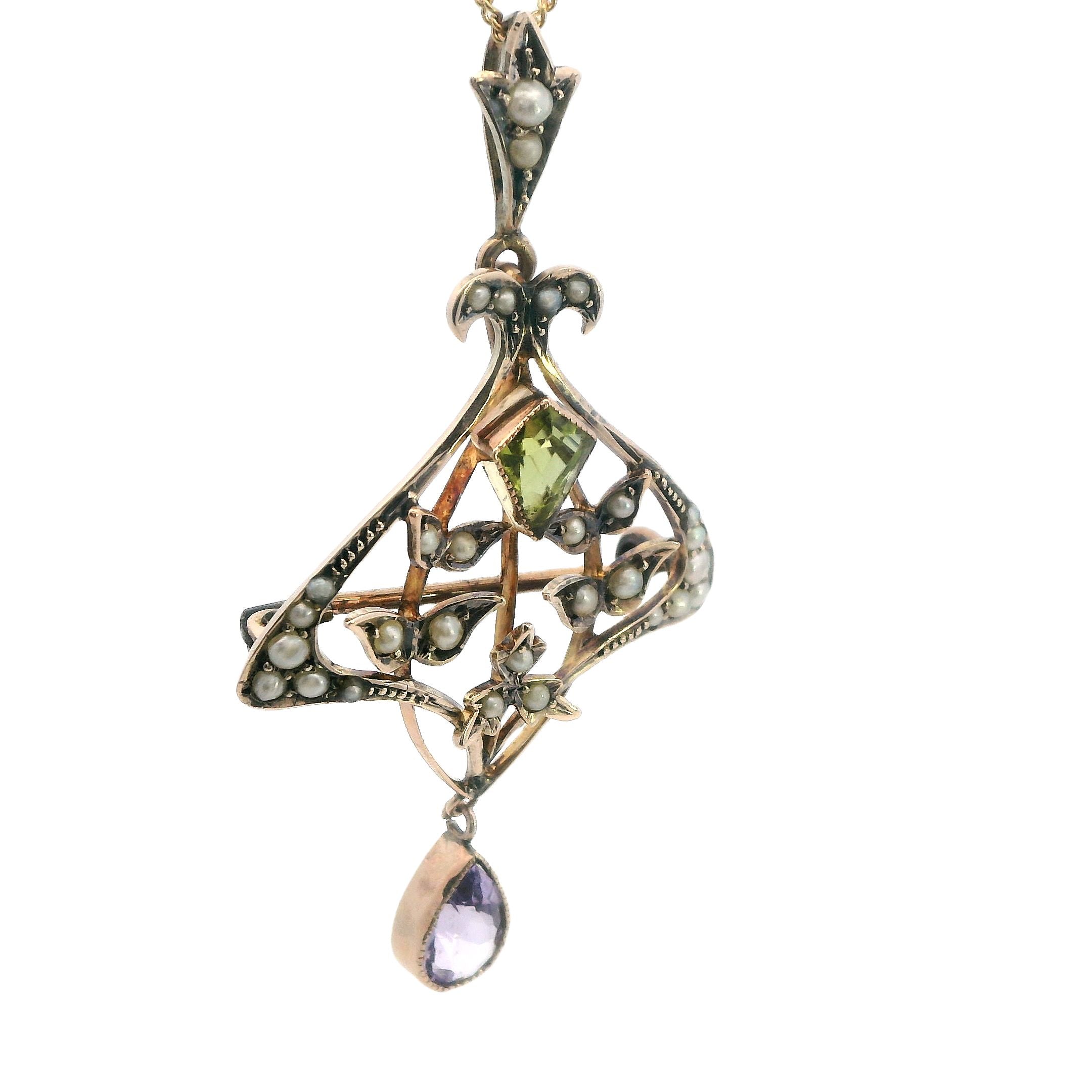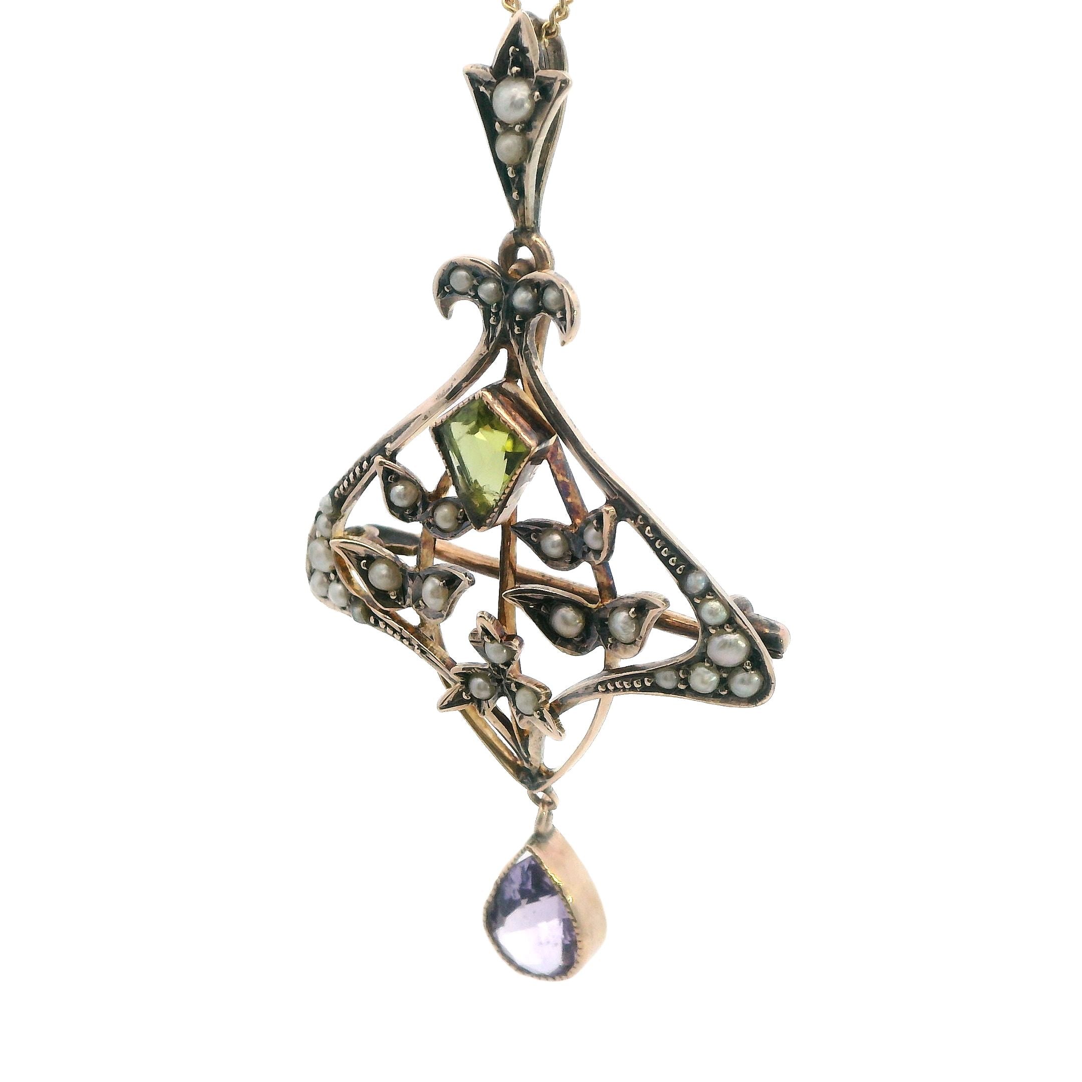 9ct Yellow Gold Brooch/Pendant with Peridot, Amethyst & Seed Pearl Gemstones