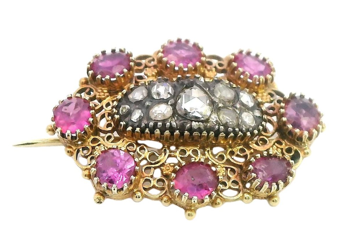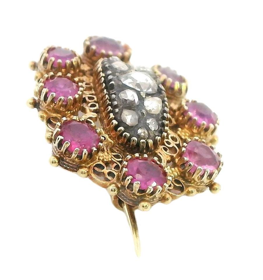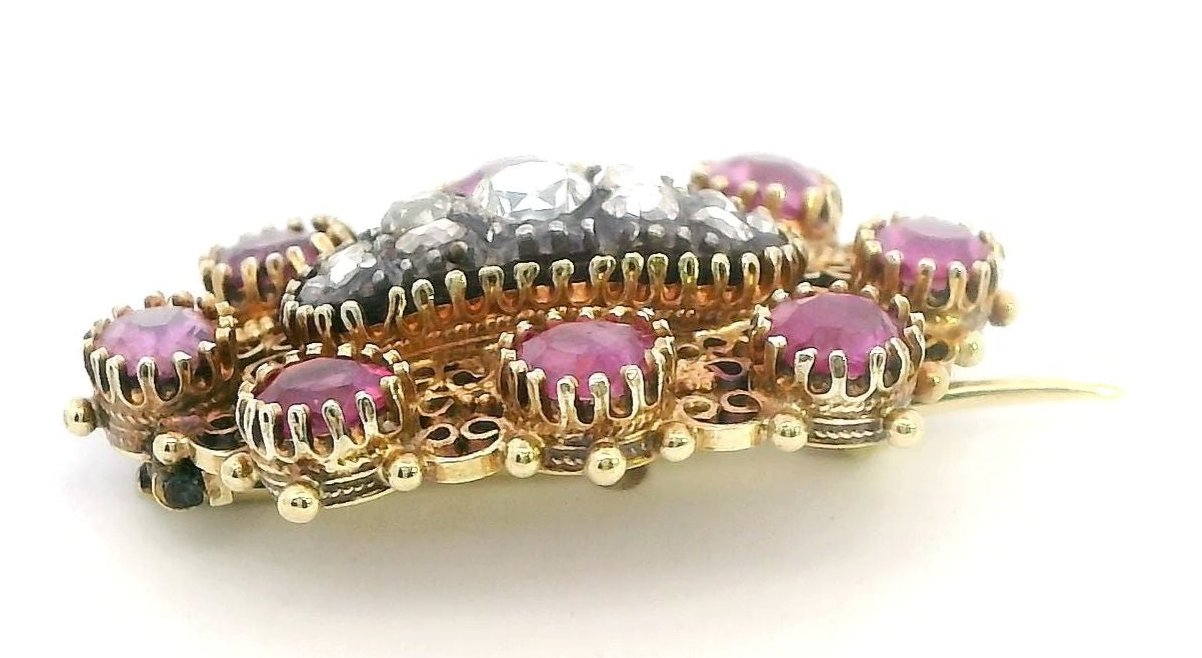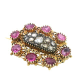 This elegant Victorian ruby and diamond brooch is a timeless piece that combines historical charm with exquisite detail, making it a truly exceptional addition to any fine jewelry collection.