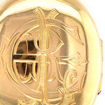 This exquisite antique locket, crafted from 18ct yellow gold, is a timeless piece from the early 1900s. The locket features a hinged design with an elegant oval shape, measuring 50mm x 40mm. The front is beautifully engraved with the initials "CRL" and is complemented by a tapered articulated loop, making it a perfect keepsake or heirloom piece.