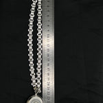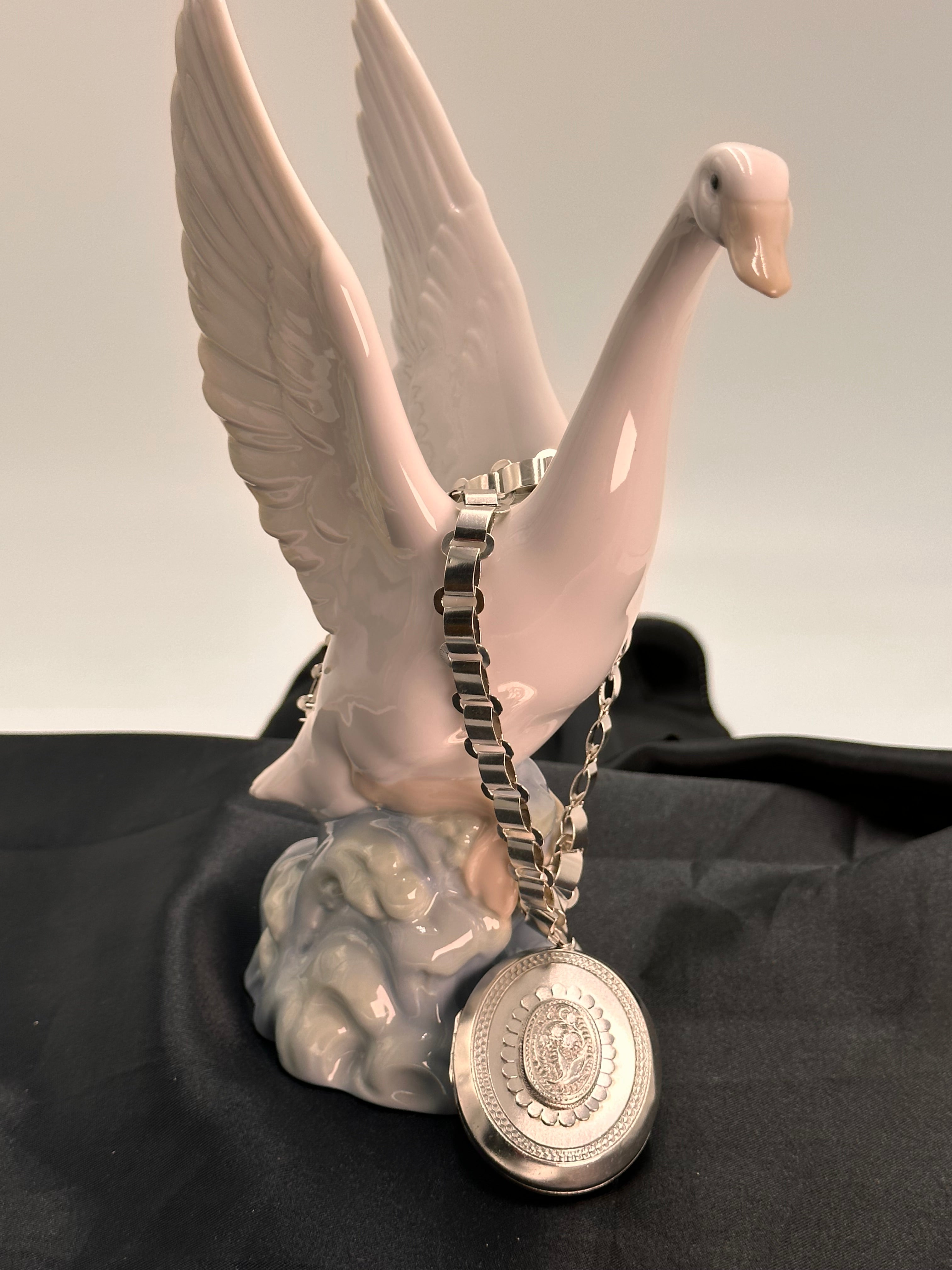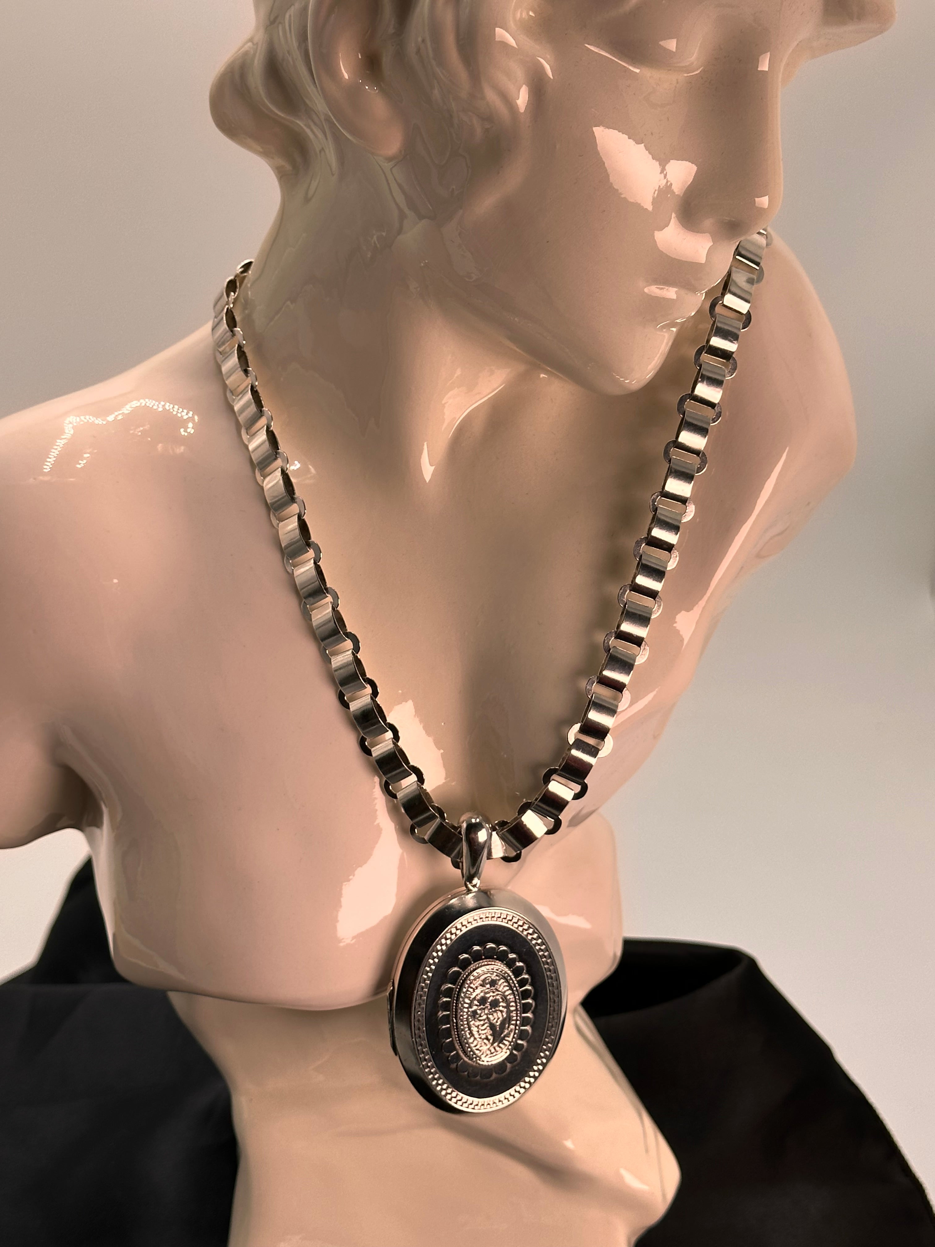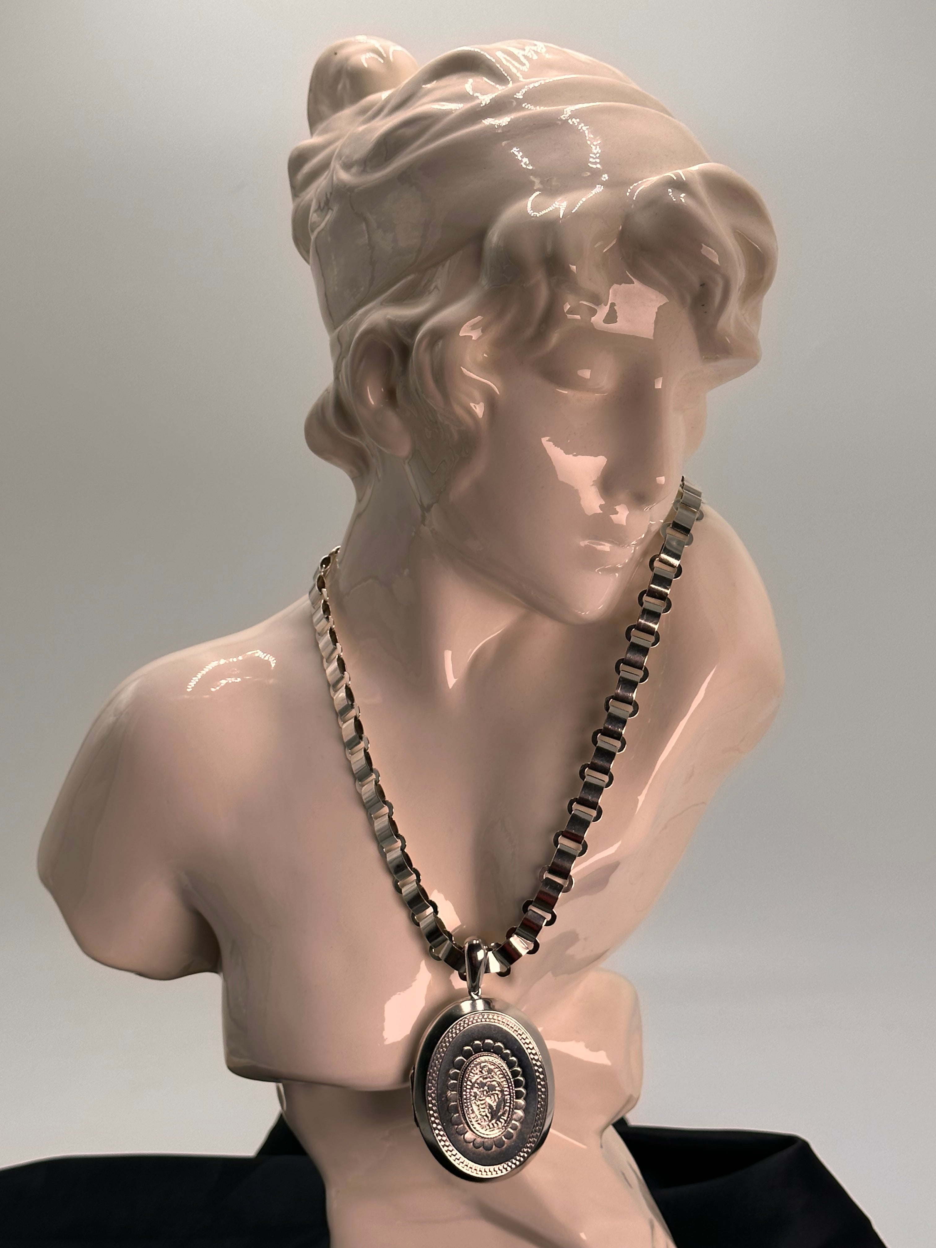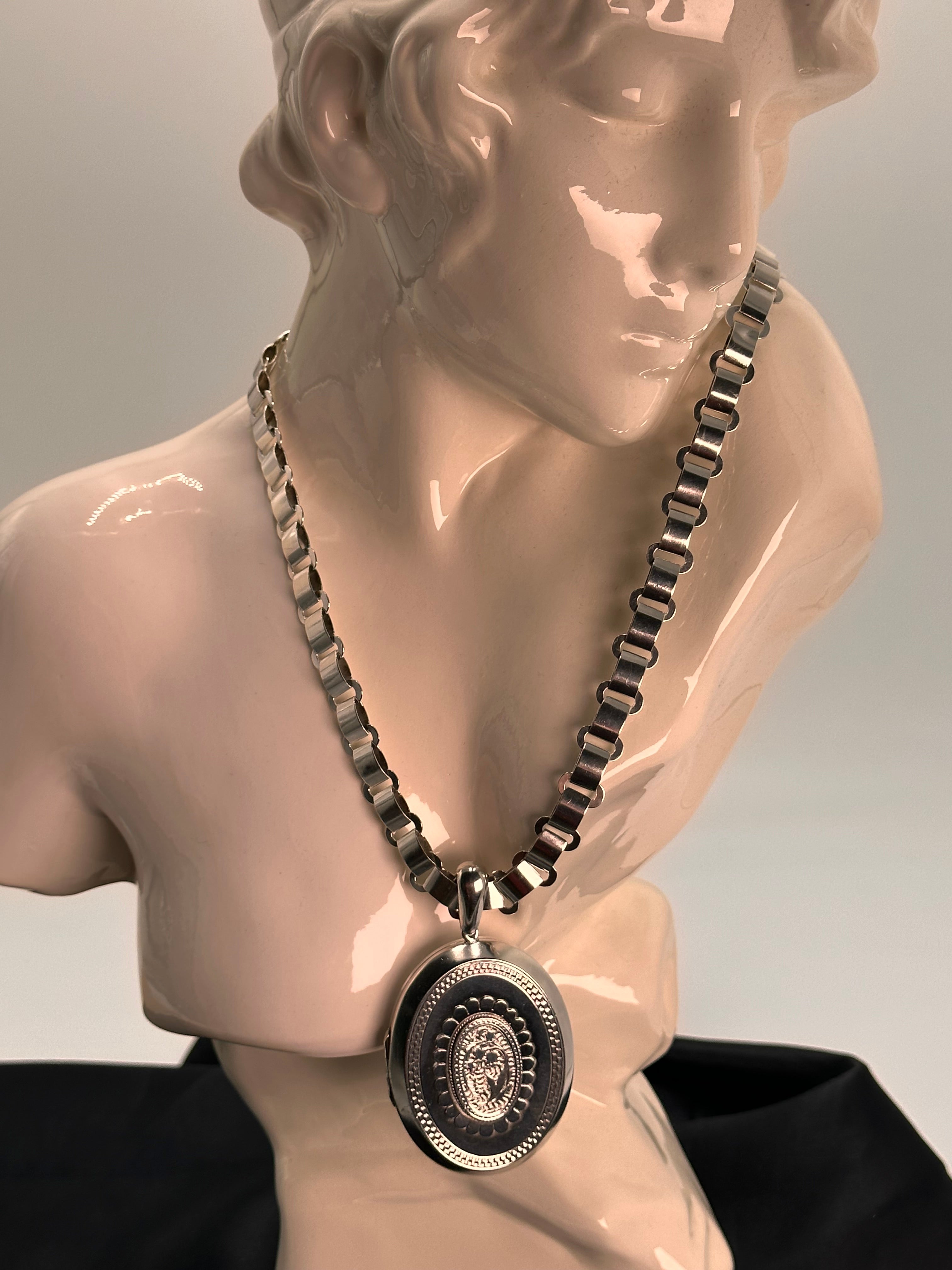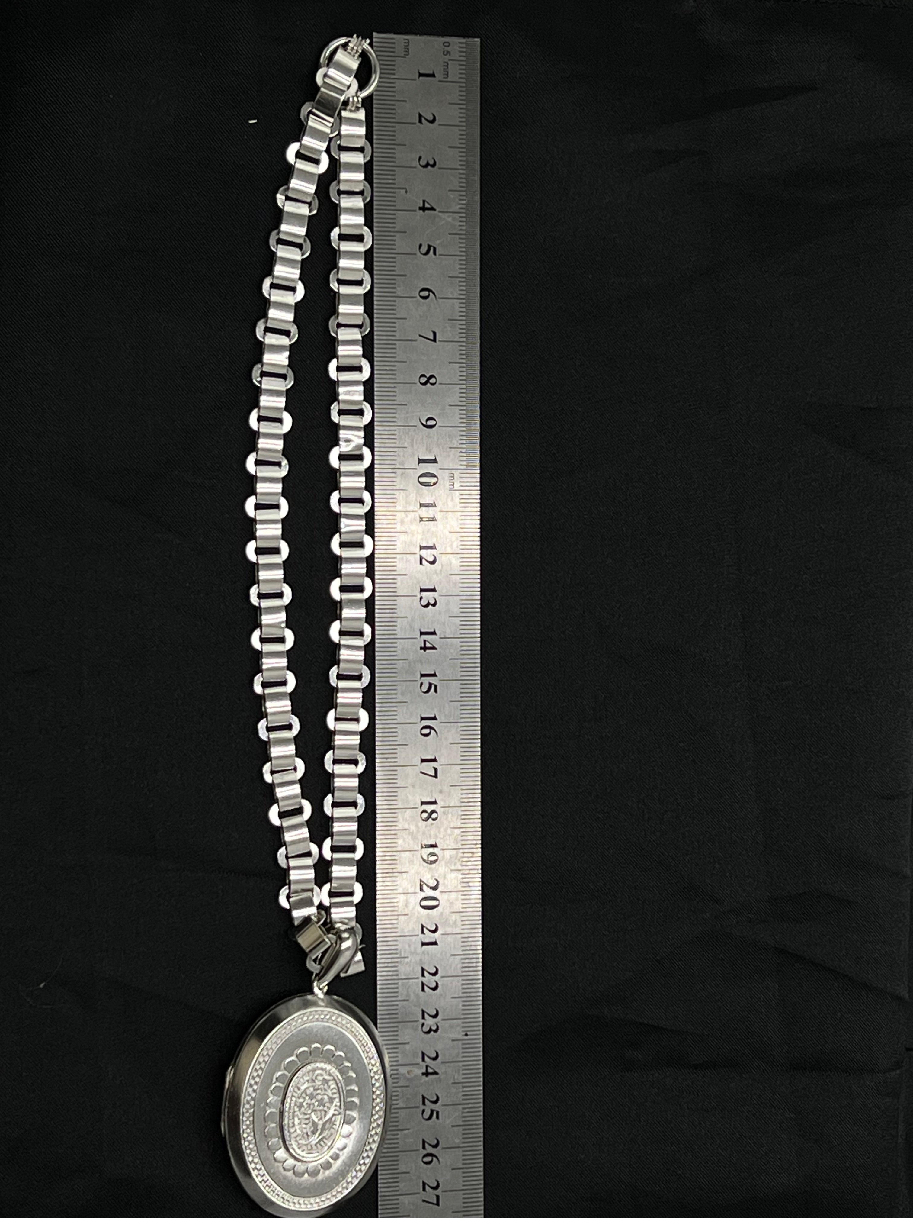 🗝Suspended from this chain is an exquisite silver locket, measuring 5.1 cm high and 4 cm wide. The locket boasts intricate designs, inviting you to unlock an era of nostalgia and romance, whilst providing a perfect place to hold cherished memories close to your heart.