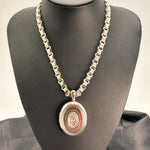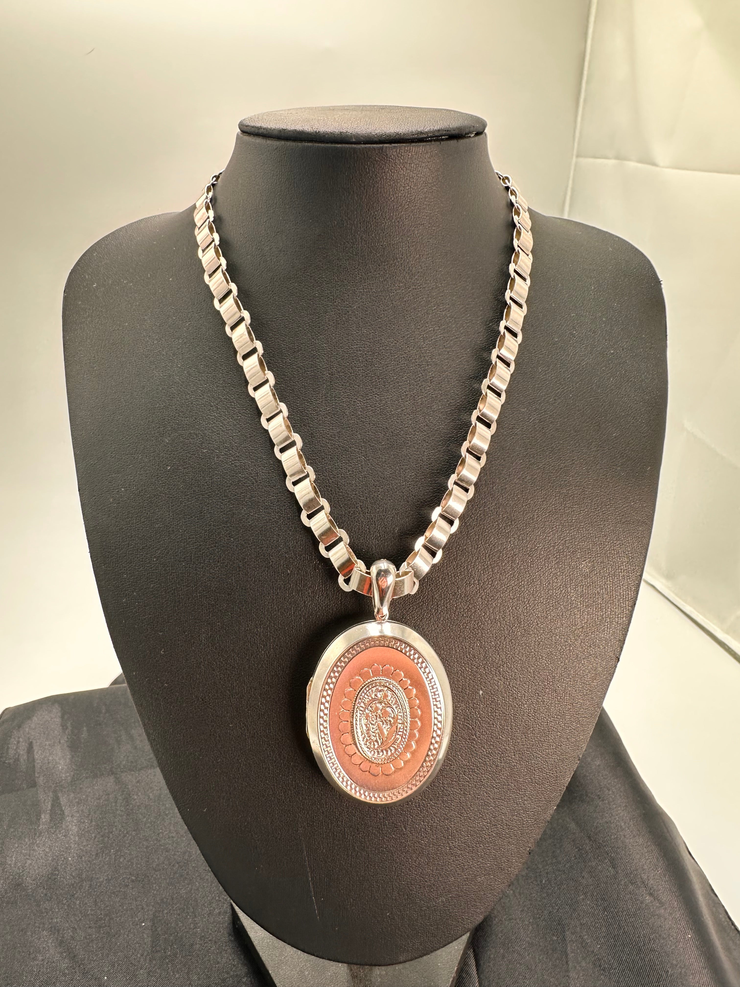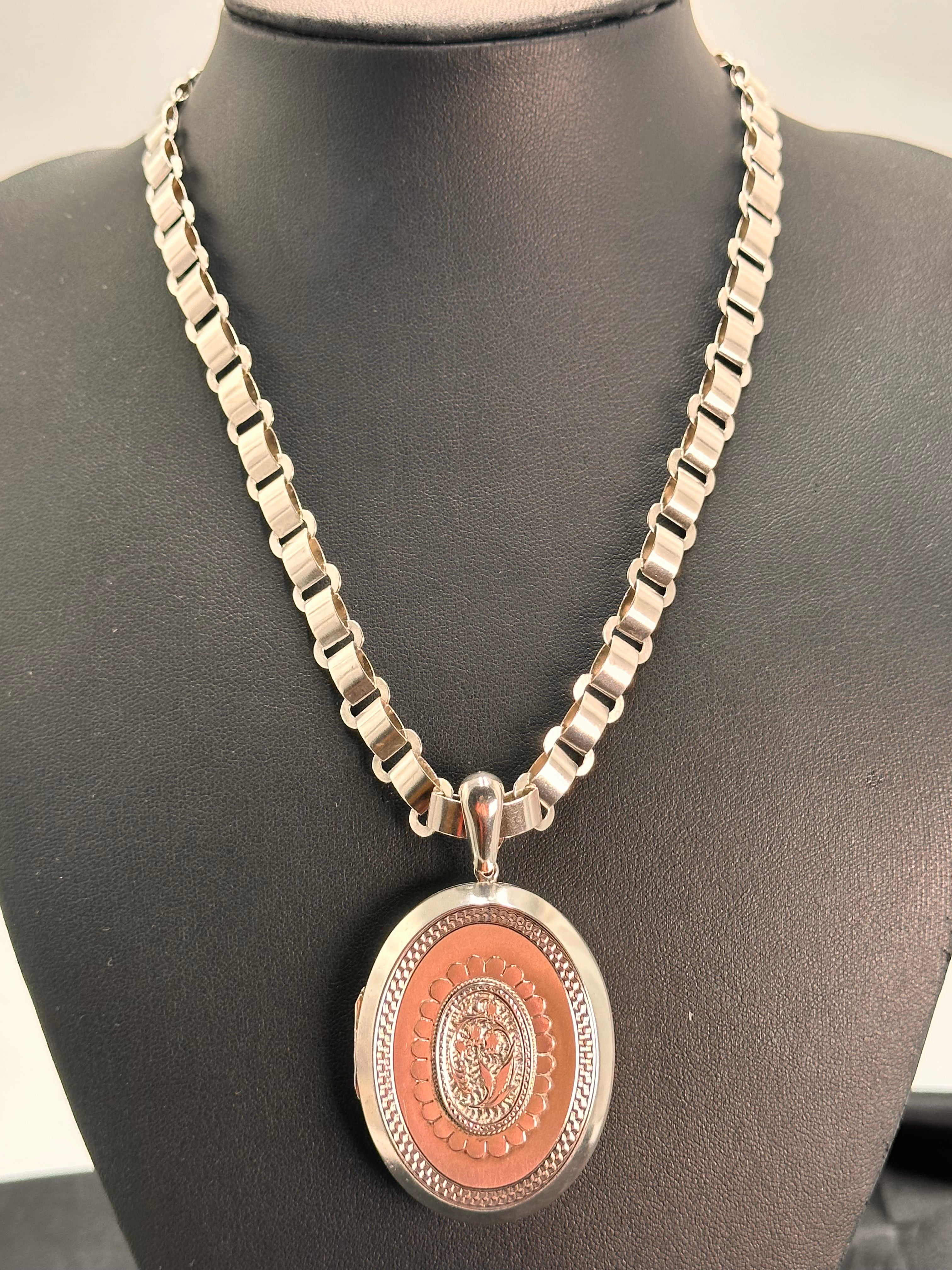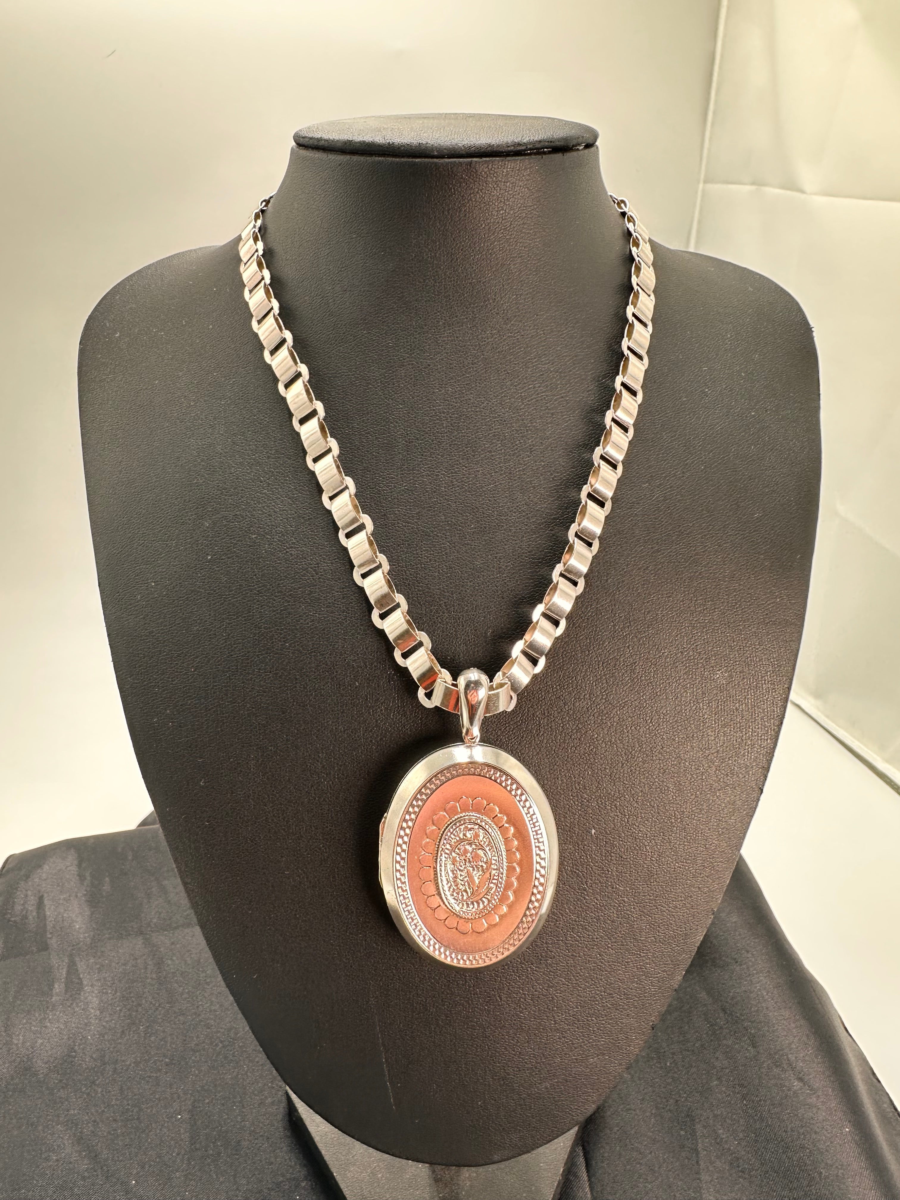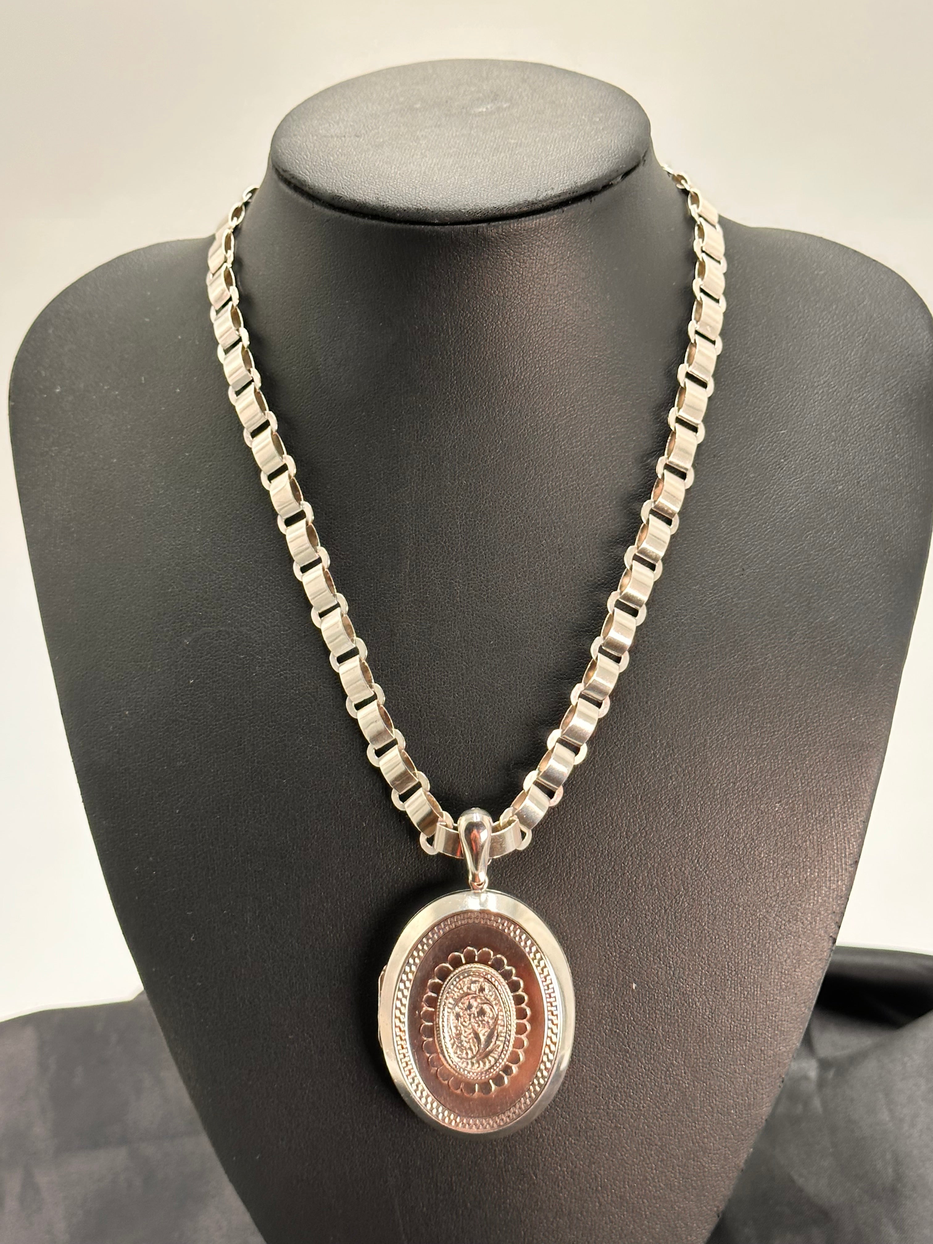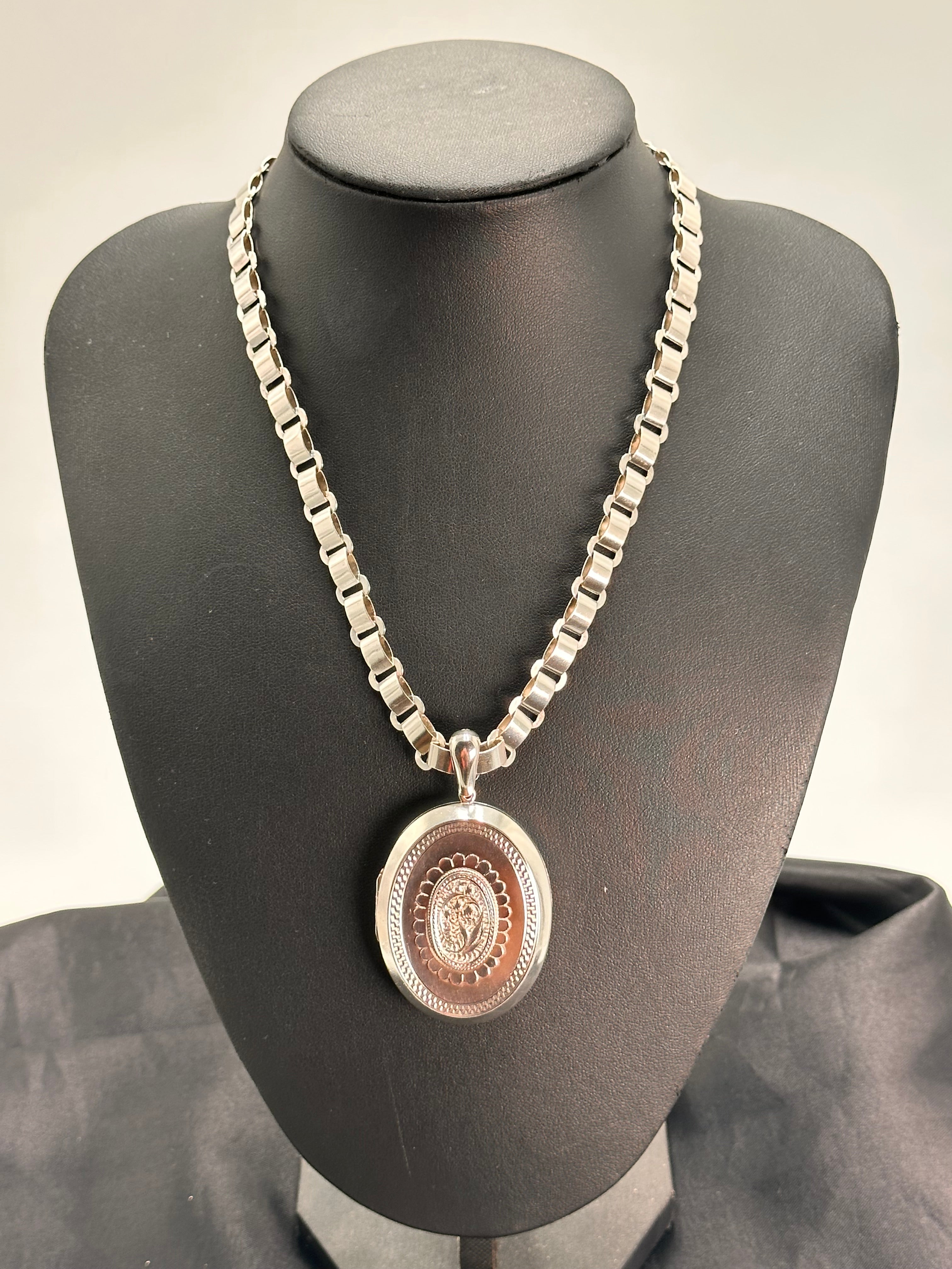 This combined piece weighs 49.91 grams, signifying its substantial quality and fine craftsmanship. The antique silver brings an undeniable warmth and radiance, enhancing the overall allure of the chain and locket.
