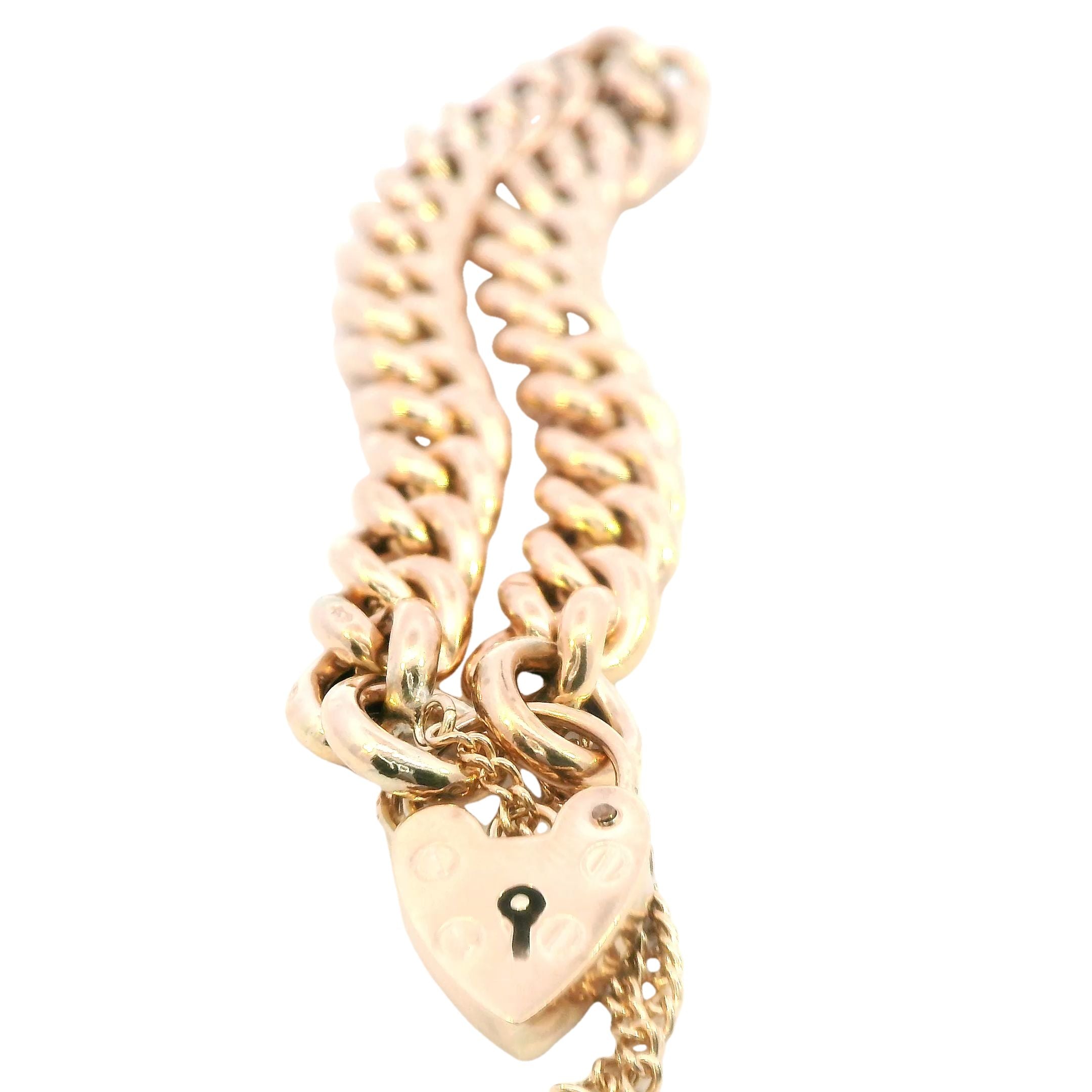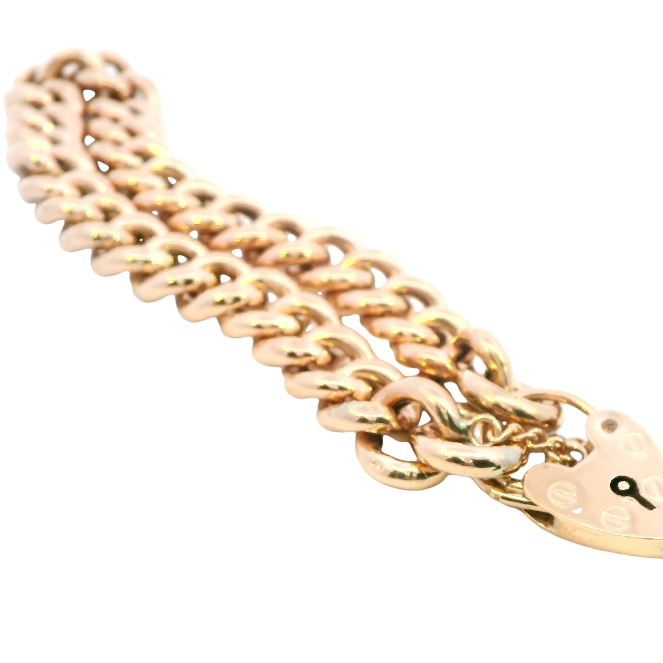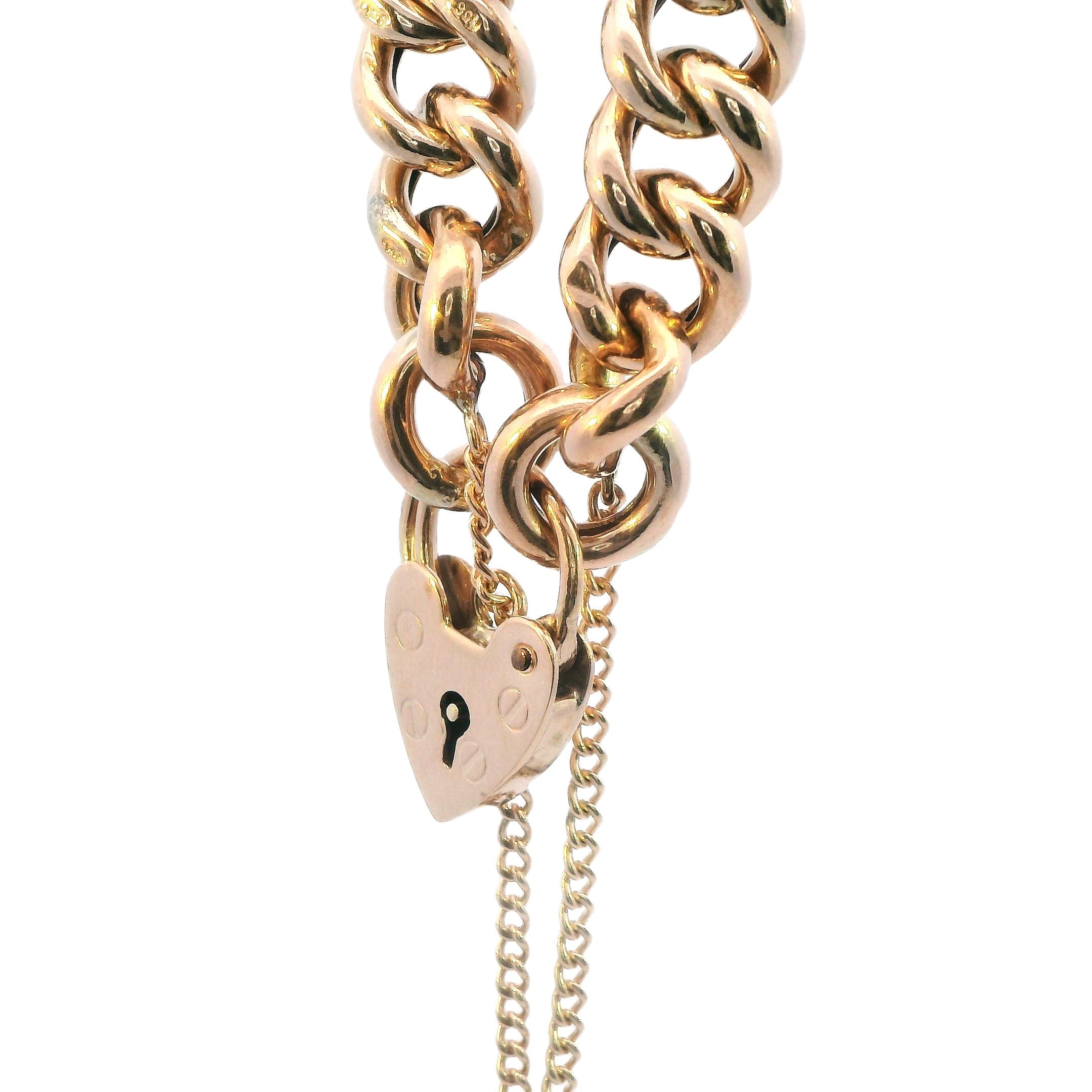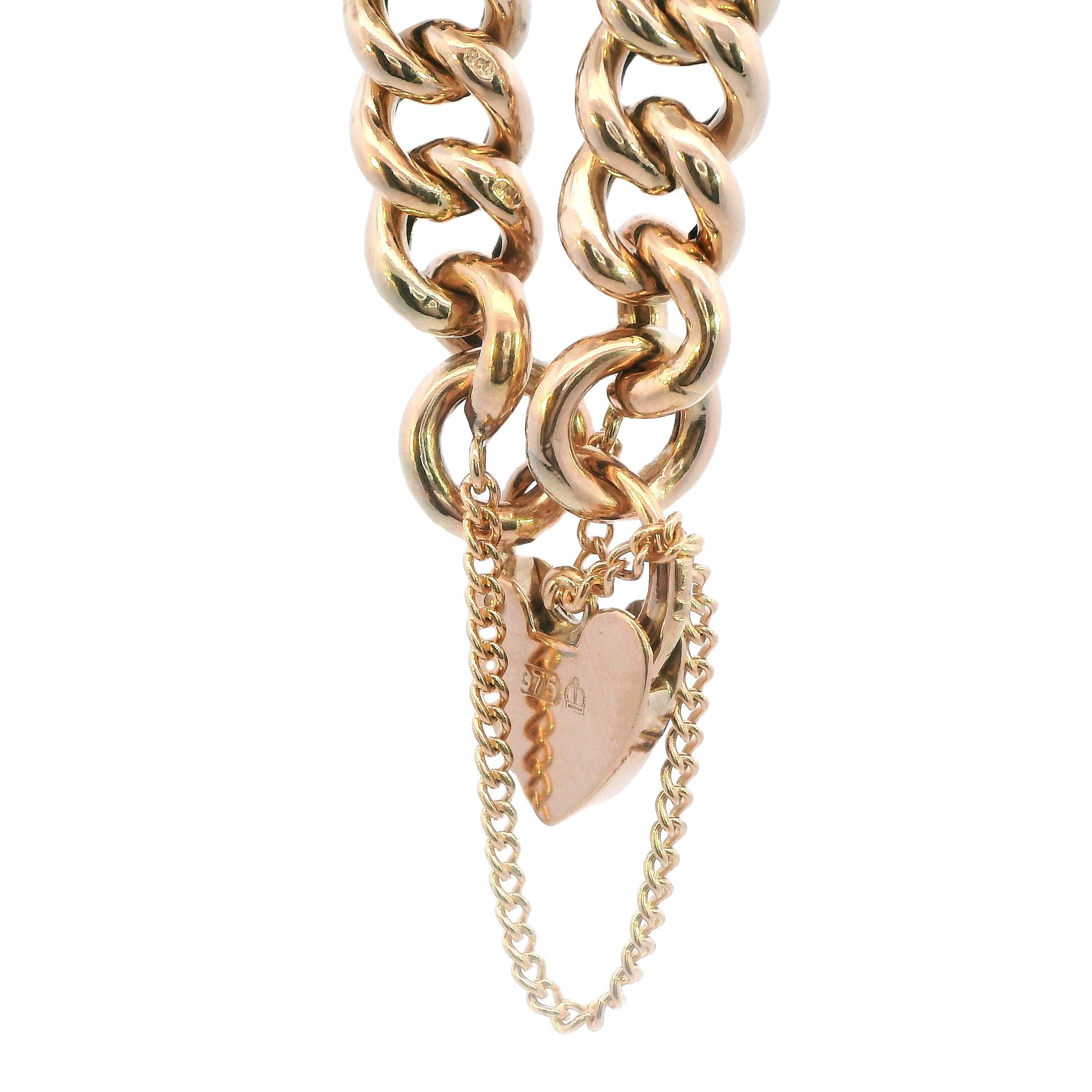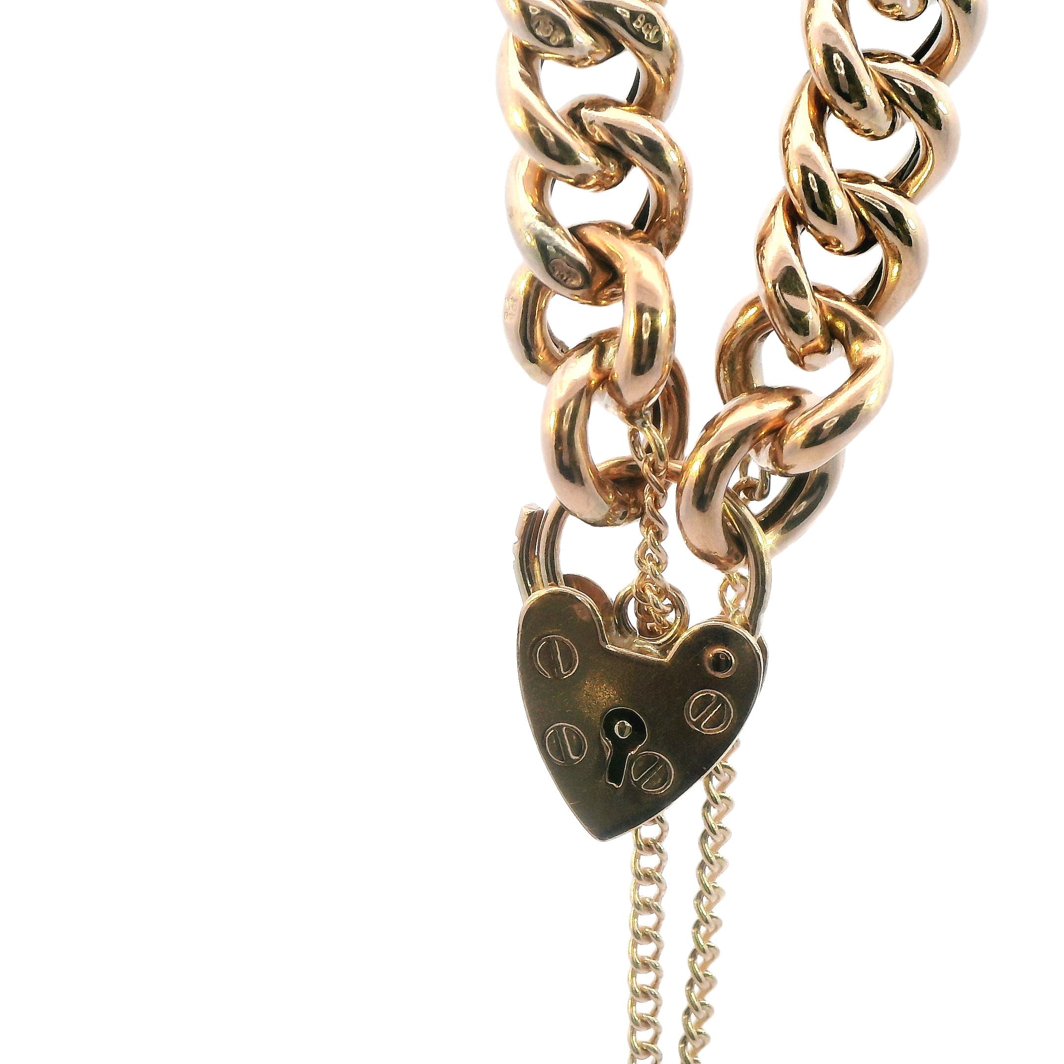 Short Description: A luxurious 9ct rose gold hollow curb link bracelet featuring a stunning flat heart padlock with a safety chain. This timeless piece is 18cm in length and weighs 23.4 grams, making it a perfect addition to any jewellery collection.