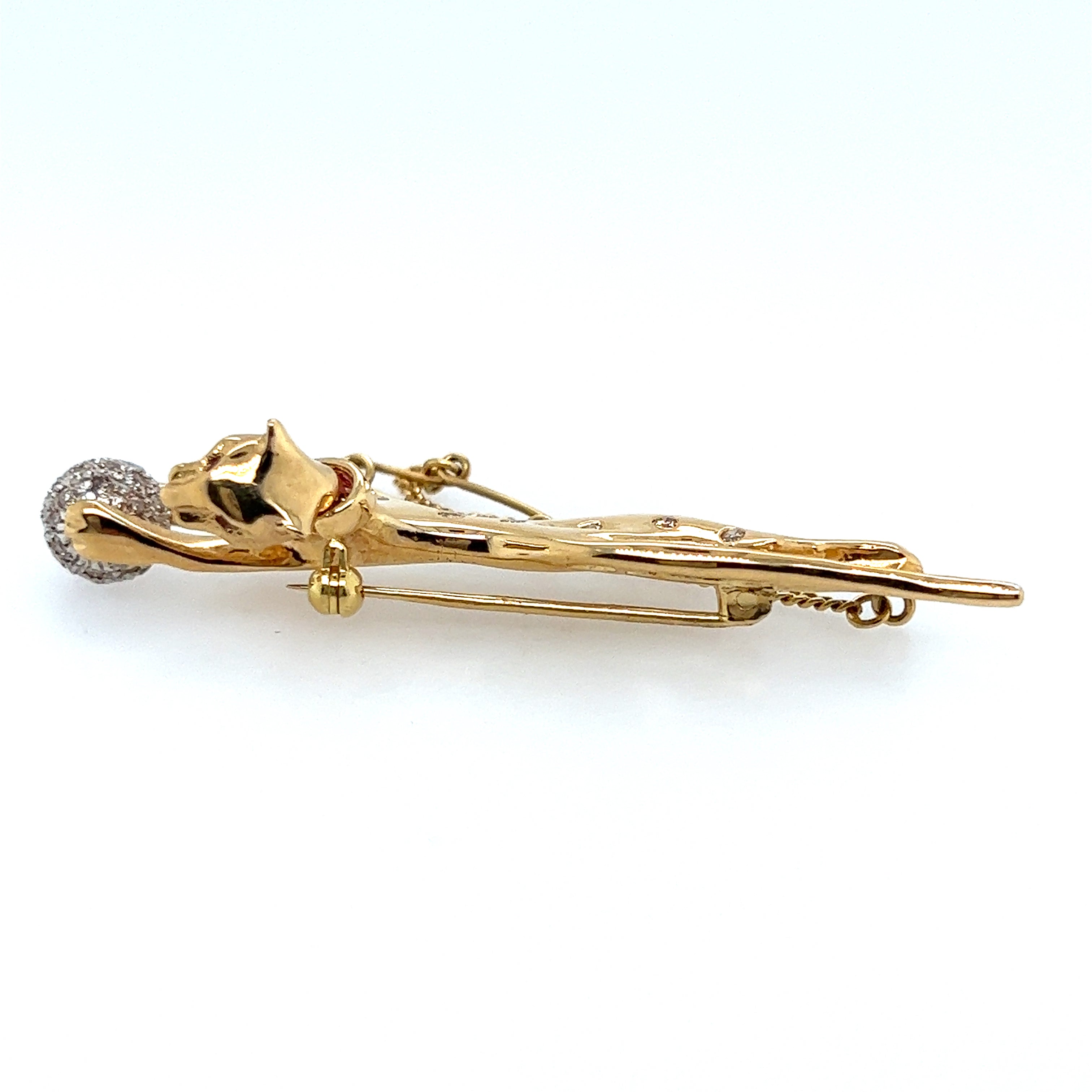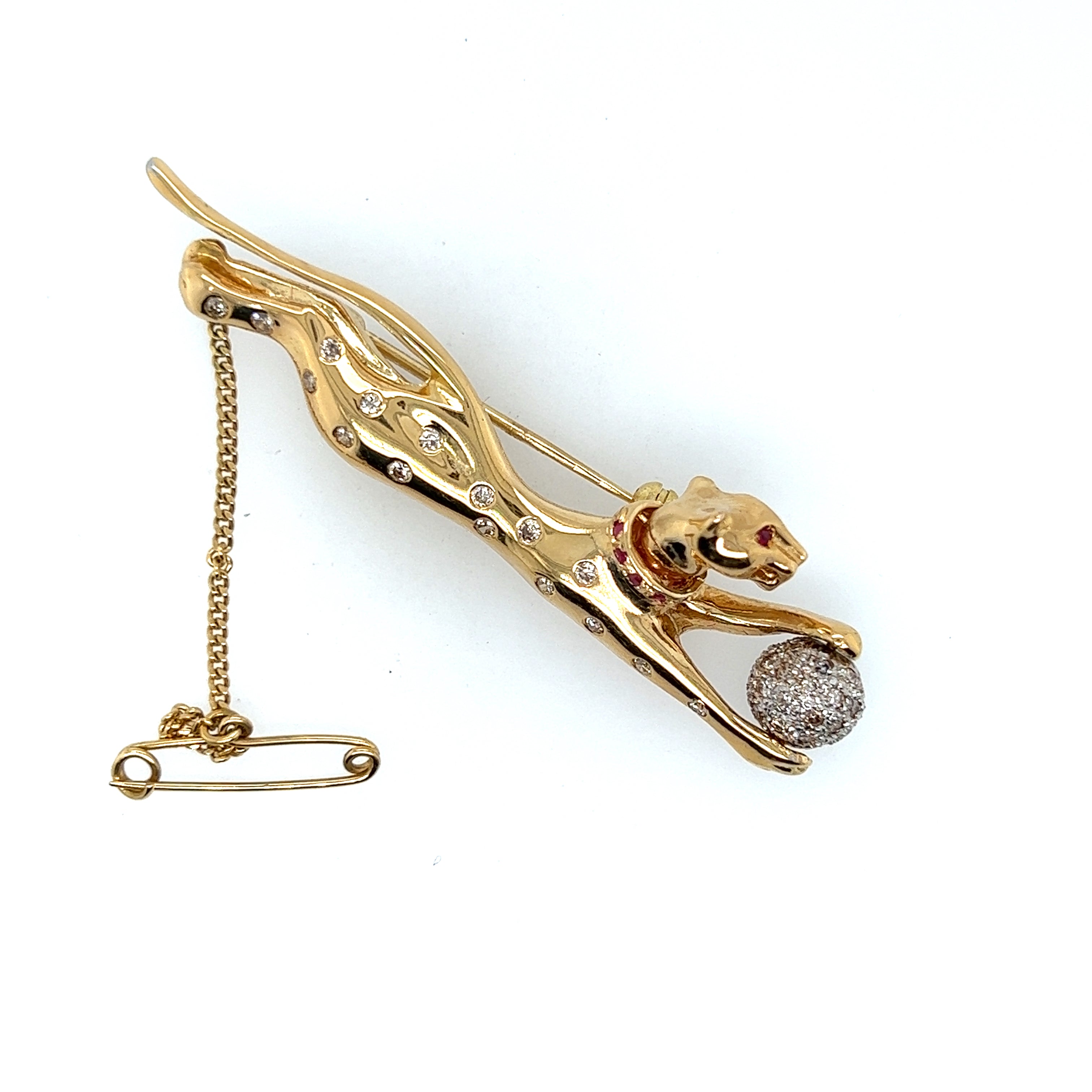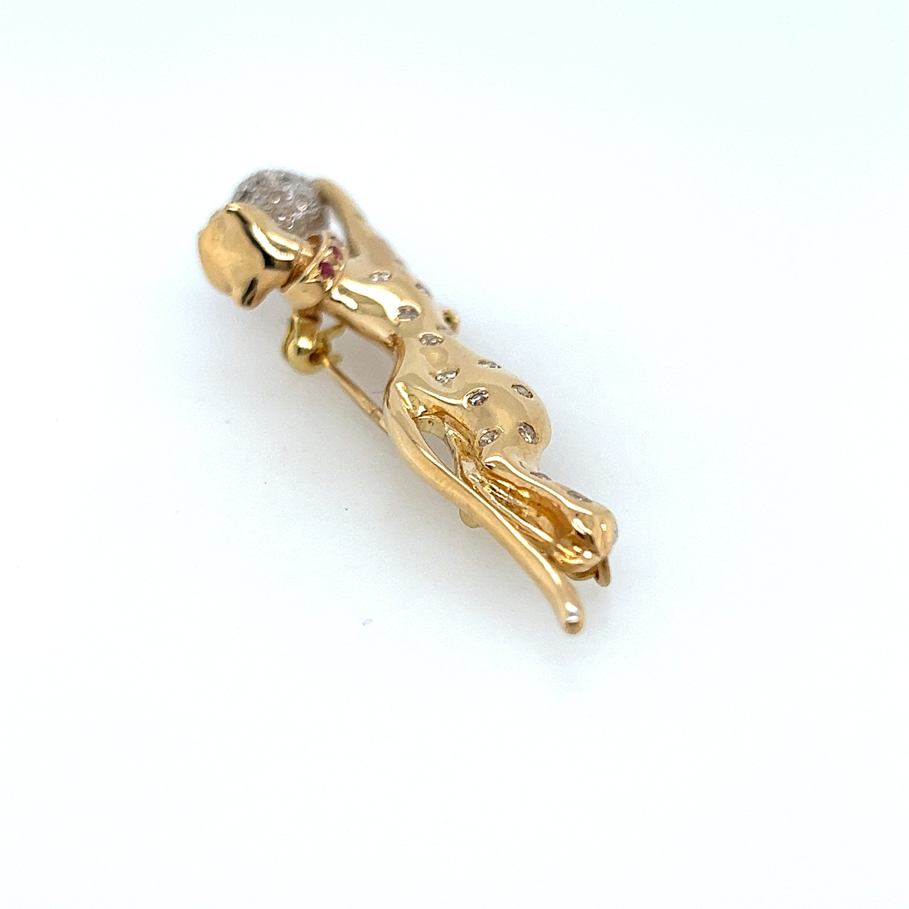 18ct yellow and white gold diamond and ruby set jaguar brooch. The brooch measures 61.5mm x 15.5mm with an articulated head and a white gold ball between the front paws which is set with thirty-eight (38) 0.005ct brilliant cut diamonds.