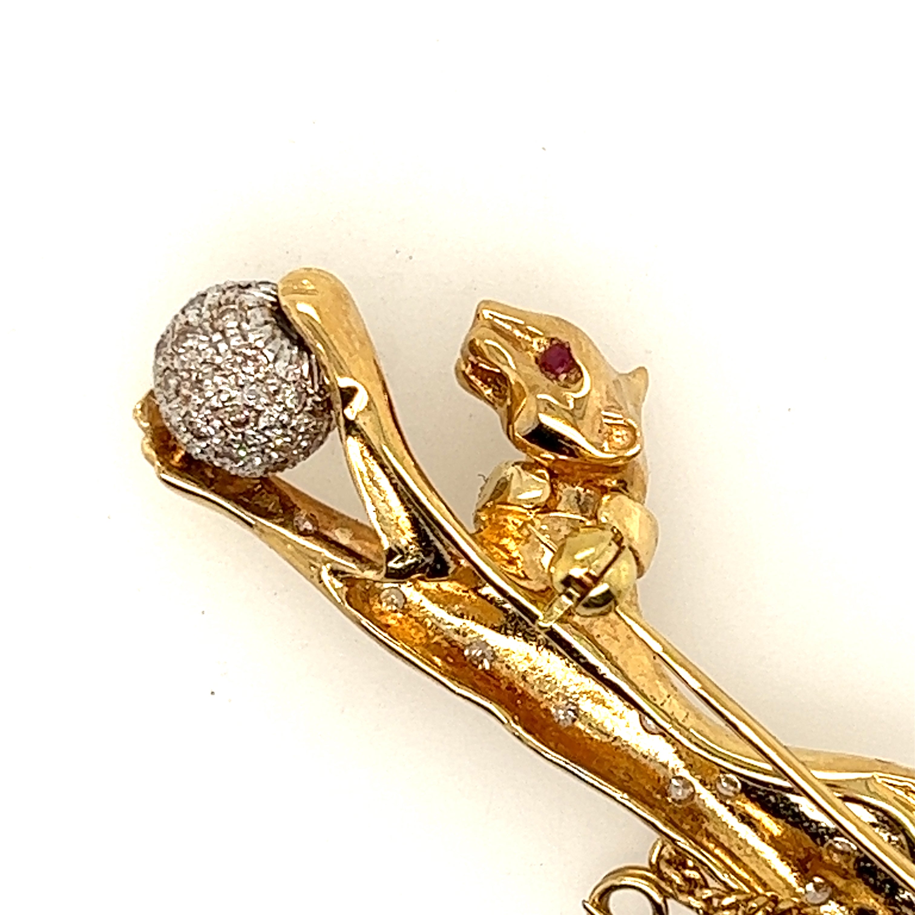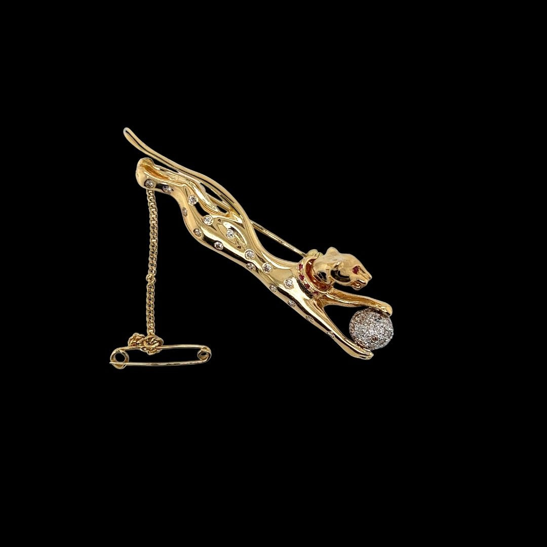 What an amazing item. A magnificent yellow and white gold jaguar brooch sprinkled with diamonds and rubies. The head moves giving life to this amazing object.